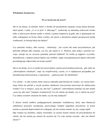 Włodzisław Kuzitowicz Po co uczeń ma się uczyć? Jak to się dzieje, że dziecko, które w drodze do przedszkola zasypuje swoją mamę dziesiątkami pytań z cyklu „A co to jest? A dlaczego?”, zachowuje tą naturalną ciekawość świata tylko w pierwszym okresie nauki w szkole, a potem stopniowo ją gubi, aby w gimnazjum nie tylko zobojętnieć na liczne oferty wiedzy, ale nawet z okrzykiem radości przyjmować każdą wiadomość, że dzisiaj lekcji nie będzie? Czy potrzeba wiedzy, albo szerzej – informacji, jest czymś tak samo przyrodzonym, jak potrzeba afiliacji albo uznania, czy też, jak opisał to A. Maslow, jako jedna z potrzeb rozwoju, sytuuje się na szczycie piramidy potrzeb ludzkich? Że trzeba ją najpierw wywołać, ukształtować, a dopiero potem będzie ona źródłem nigdy niezaspokojonych dążeń człowieka poszukującego odpowiedzi na tysiące pytań? Jak to się dzieje, że to co miało być przywilejem, potem powszechnym prawem, gdy stało się „obowiązkiem szkolnym”, staje się uciążliwością, czymś, co w najlepszym przypadku jest nieuniknioną koniecznością, a najczęściej – „pańszczyzną” do odrobienia? Czy szkoła – to taki system, który niszczy naturalny pęd dziecka do wiedzy, czy raczej instytucja, która nie potrafi u swych uczniów zbudować rzeczywistej motywacji do zdobywania wiedzy? Czy w miejsce „uczę się, aby być” [„pełnym” człowiekiem] realizuje się tam model „uczę się, aby mieć” [stopień, świadectwo]? Czy do szkoły się chodzi, czy w szkole się uczy? Czy należy uczniów zmuszać do nauki, czy do niej zachęcać? Z okresu moich studiów pedagogicznych pamiętam wykładowcę, który nam tłumaczył subtelności procesów kształcenia, przywołując, bodajże angielskie przysłowie, że konia można co prawda doprowadzić do wodopoju, ale nie można zmusić, by się z niego napił! Idąc tropem tej metafory, należy stwierdzić, że ucznia można zmusić do przychodzenia do szkoły, ale nie można go zmusić do uczenia się. Co więc można uczynić, „aby oni chcieli chcieć”? Przypomnijmy sobie elementarz teorii motywacji. Motyw – to bodziec skłaniający do określonego działania, które ma zaspokoić jakąś potrzebę, a motywacja – to ogół motywów, którymi kieruje się człowiek w swym działaniu. Bywa wewnętrzna – pobudzająca do działania, które jest wartością samą w sobie, na przykład zainteresowania, zamiłowania, lub zewnętrzna, występująca w postaci zachęty do działania, za które można uzyskać nagrodę lub uniknąć kary. Nie do przecenienia jest wpływ motywacji na procesy poznawcze, pamięci i myślenia. Psychologowie wyróżniają ponadto motywację dodatnią – gdy napędza nas pragnienie uzyskania czegoś, i ujemną – gdy pragniemy czegoś uniknąć. Motywacja może być słaba i silna. Jednak jej natężenie nie ma prostego przełożenia na sprawność i stopień trudności realizowanych pod jej wpływem zadań. Wykazano, że istnieje określony, optymalny poziom motywacji dla określonego stopnia trudności rozwiązywanych problemów. Mówią o tym dwa prawa Yerkesa-Dodsona: Pierwsze: „W miarę wzrostu natężenia motywacji sprawność działania wzrasta do pewnego poziomu, po czym zaczyna spadać, a przy bardzo wysokim natężeniu motywacji sprawność działania jest niska.” Drugie: ”W rozwiązywaniu zadania łatwego największą sprawność osiąga się przy wysokim poziomie motywacji, a rozwiązywanie zadań trudnych – przy niskim poziomie motywacji.”1 Po co przypominam to historyczne już źródło wiedzy psychologicznej nauczycieli? Bo moje kilkudziesięcioletnie obserwacje funkcjonowania szkoły, nauczycieli, ale także rodziców uczniów każą mi sądzić, że owa elementarna wiedza jest im obca, albo całkowicie zapomniana. Codzienność większości szkół, nie tylko polskich, bardzo trafnie scharakteryzował profesor Uniwersytetu Gerharda Merkatora w Duisburgu – Gerd Miztel w pracy „Psychologia kształcenia”: „Ciągle jeszcze dominuje punkt widzenia, który skłania do postrzegania klasy jako miejsca produkcji („fabryki uczenia”). Zgodnie z tym poglądem […] uczniowie, niczym pracownicy fabryki, są oceniani (nagradzani lub chwaleni) przede wszystkim za osiągnięcia; to co robią, co czynią z korzyścią dla pracodawcy. Pracownicy przedsiębiorstwa wymieniają swoje dokonania na pieniądze. Podobnie uczniowie w ramach lekcji zorientowanej na produkcję mogą „wytwarzać” osiągnięcia, ponieważ otrzymują za to stopnie albo określone przywileje. [..] Jeżeli nauczyciele – jawnie lub otwarcie – postrzegają klasę szkolną jako miejsce 1 [J.Strelau, A.Jurkowski, Z.Putkiewicz, Podstawy psychologii dla nauczycieli, s.152,153] produkcji, to przywiązują wagę do nienagannej pracy prowadzącej do osiągnięć, a nie do samego procesu uczenia.”2 Ja uzupełniłbym jeszcze ten obraz o rodziców. Bo to oni zachowują się często, jakby kupowali u swoich dzieci „produkt” ich „pracy” w „fabryce osiągnięć”, czyli szkole, płacąc im gotówką lub drogimi prezentami za dobre świadectwo, maturę, dostanie się na studia! A gdzie w tym stara rzymska zasada Seneki Młodszego: Non scholae, sed vitae discimus (Nie dla szkoły a dla życia się uczymy)? Jak współcześnie określa się zadania polskiej szkoły, szerzej – systemu oświaty, w odniesieniu do kształcenia, w tym nauczania-uczenia się? Nie odnajdziemy zapisów tych zadań w ustawie o systemie oświaty. Dopiero w rozporządzeniu w sprawie podstawy programowej wychowania przedszkolnego oraz kształcenia ogólnego w poszczególnych typach szkół można odszukać co jest zadaniem szkoły w tej dziedzinie. Czytamy tam, między innymi: „Szkoła w zakresie nauczania, co stanowi jej zadanie specyficzne, zapewnia uczniom w szczególności: 1) naukę poprawnego i swobodnego wypowiadania się, pisania i czytania ze zrozumieniem, w tym w j