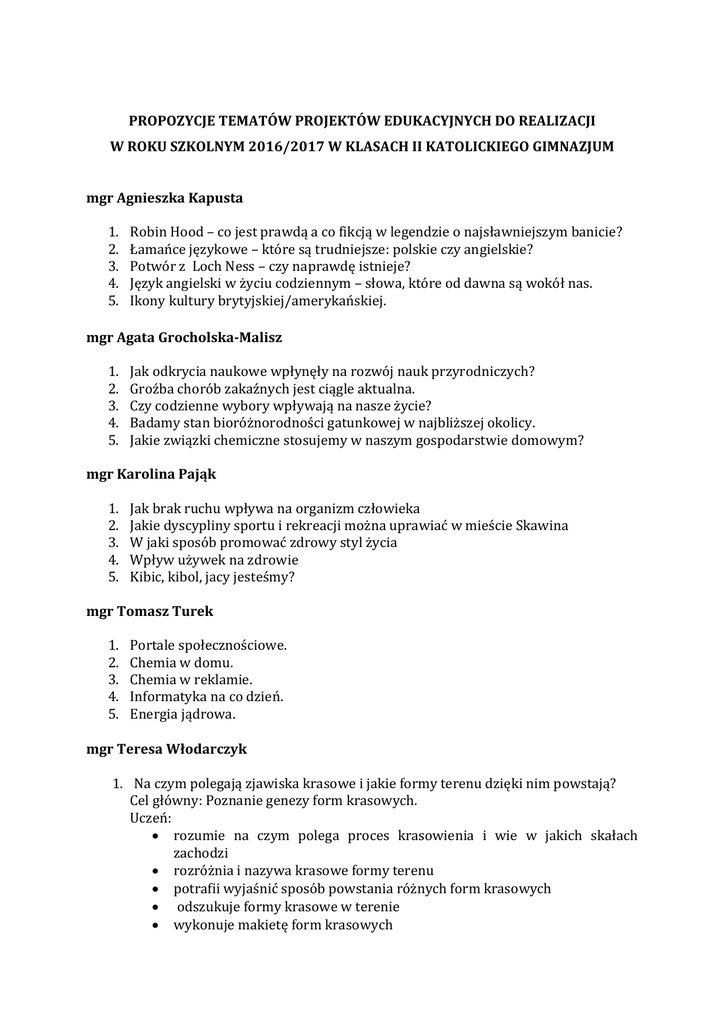 PROPOZYCJE TEMATÓW PROJEKTÓW EDUKACYJNYCH DO REALIZACJI W ROKU SZKOLNYM 2016/2017 W KLASACH II KATOLICKIEGO GIMNAZJUM mgr Agnieszka Kapusta 1. 2. 3. 4. 5. Robin Hood – co jest prawdą a co fikcją w legendzie o najsławniejszym banicie? Łamańce językowe – które są trudniejsze: polskie czy angielskie? Potwór z Loch Ness – czy naprawdę istnieje? Język angielski w życiu codziennym – słowa, które od dawna są wokół nas. Ikony kultury brytyjskiej/amerykańskiej. mgr Agata Grocholska-Malisz 1. 2. 3. 4. 5. Jak odkrycia naukowe wpłynęły na rozwój nauk przyrodniczych? Groźba chorób zakaźnych jest ciągle aktualna. Czy codzienne wybory wpływają na nasze życie? Badamy stan bioróżnorodności gatunkowej w najbliższej okolicy. Jakie związki chemiczne stosujemy w naszym gospodarstwie domowym? mgr Karolina Pająk 1. 2. 3. 4. 5. Jak brak ruchu wpływa na organizm człowieka Jakie dyscypliny sportu i rekreacji można uprawiać w mieście Skawina W jaki sposób promować zdrowy styl życia Wpływ używek na zdrowie Kibic, kibol, jacy jesteśmy? mgr Tomasz Turek 1. 2. 3. 4. 5. Portale społecznościowe. Chemia w domu. Chemia w reklamie. Informatyka na co dzień. Energia jądrowa. mgr Teresa Włodarczyk 1. Na czym polegają zjawiska krasowe i jakie formy terenu dzięki nim powstają? Cel główny: Poznanie genezy form krasowych. Uczeń: rozumie na czym polega proces krasowienia i wie w jakich skałach zachodzi rozróżnia i nazywa krasowe formy terenu potrafii wyjaśnić sposób powstania różnych form krasowych odszukuje formy krasowe w terenie wykonuje makietę form krasowych 1. Jak zmieniała się nasza szkoła? Cel główny: Poznanie historii szkoły Uczeń: wyszukuje informacje dotyczące szkoły zapoznaje się ze zmianami w funkcjonowaniu szkoły przeprowadza wywiady z osobami związanymi ze szkołą wykonuje prezentację dotyczącą zaistniałych zmian podaje propozycje dalszego rozwoju szkoły 1. Co zrobić aby Skawina stała się atrakcyjną miejscowością dla młodych ludzi? Cel główny: Poznanie ofert zajęć pozalekcyjnych dla młodzieży. Uczeń: zbiera informacje o sposobach spędzania wolnego czasu przez młodzież zbiera informacje o propozycjach organizowanych zajęć dla młodzieży poszukuje możliwości uatrakcyjnienia sposobów spędzania wolnego czasu opracowuje folder z informacjami o różnych zajęciach zabiega o rozszerzenie oferty zajęć dodatkowych dla młodzieży 2. Jaki jest a jaki był w poprzednich latach przyrost naturalny w Skawinie? Cel główny: Poznanie przyrostu naturalnego mieszkańców Skawiny Uczeń: zbiera informacje na temat przyrostu naturalnego ludności Skawiny przedstawia zebrane informacje w postaci graficznej szuka przyczyn wielkości urodzeń i zgonów w Skawinie analizuje w jaki sposób wskaźniki urodzeń i zgonów wpływają na rynek pracy w Skawinie szuka sposobów na podniesienie wielkości przyrostu naturalnego w Skawinie 3. Korona Gór Polski – czy łatwo ją zdobyć? Cel główny: Poznanie Korony Gór w Polsce Uczeń: zbiera informacje o nazwach szczytów tworzących Koronę Gór Polski tworzy mapę Korony Gór Polski poznaje walory turystyczne poszczególnych wzniesień wyszukuje legendy związane ze wzniesieniami prezentuje zdobytą wiedzę mgr Joanna Bielawska 1. 2. 3. 4. 5. 6. Polacy w historii Australii. Reklama dźwignią handlu. Tradycje Bożego Narodzenia w Wielkiej Brytanii. Planujemy tygodniową wycieczkę do Londynu. System edukacji w USA. Temat zaproponowany przez uczniów, związany z ich zainteresowaniami. mgr Kinga Adamczyk 1. Legendarne postaci Wielkiej Brytanii . Cel: - zapoznanie się z dziedzictwem kulturowym UK - wzbogacenie słownictwa - poznanie geografii i historii UK 2. Wielcy budowniczy Państwa Polskiego - rocznica Chrztu Polski Cel: - zapoznanie się historią Polski - zaznajomienie się z ważnymi postaciami tworzącymi państwowość Polski - prawa i instytucje - zmiany i ich konsekwencje 3. Ważni ludzie nauki w UK. Cel: - zapoznanie się z tradycjami naukowymi UK - wzbogacenie własnej wiedzy - wzbogacenie słownictwa - poznanie geografii i historii UK 4. Sławni pisarze w UK. Cel: - zapoznanie się z dziedzictwem kulturowym UK - stworzenie mapy miejsc związanych z pisarzami - wzbogacenie słownictwa - poznanie geografii i historii UK 5. Brytyjska Wspólnota Narodów Cel: - zapoznanie się z dziedzictwem kulturowym UK - stworzenie mapy Imperium Brytyjskiego - wzbogacenie słownictwa - poznanie geografii i historii UK mgr Joanna Stadnik 1. 2. 3. 4. 5. Nasza ulubiona postać literacka. Ulubione potrawy Brytyjczyków. Z wizytą w Szkocji. Obce zapożyczenia w języku angielskim. Moja ulubiona książka napisana w j. angielskim. mgr Konrad Rzepecki 1. 2. 3. 4. 5. Jakie ślady historii odnajdujemy w Skawinie? Czy Polacy potrafili wykorzystać wielkie zwycięstwa swego oręża? Warszawa - miasto stare czy nowe? Czy gry komputerowe mogą nauczyć historii? Pokolenie Jana Pawła II - rzeczywistość czy wymysł medialny? mgr Marta Jaćkiewicz- Lesiak 1. Bach – życie i twórczość w oparciu o wybrane zdjęcia i utwory muzyczne 2. Przewodnik po najciekawszych zabytkach Niemiec 3. Niemieckojęzyczni odkrywcy i wynalazcy 4. Dlaczego warto się uczyć języka niemieckiego? 5. Znani i zasłużeni Niemcy oraz ich osiągnięcia mgr Bernadetta Stec 1. Temat: Czy twierdzenie Pitagorasa „jedno ma imię”? Cele: Uogólnienie twierdzenia Pitagorasa. Uczeń umie: - stawiać hipotezy, - weryfikować hipotezy, - uzasadniać własności figur. 2. Temat: Jakie własności mają Księżyce Hipokratesa? Cele: Odkrycie własności Księżyców Hipokratesa Uczeń umie: - stawiać hipotezy, - weryfikować hipotezy, - uzasadniać własności figur. 3. Temat: Kiedy pudełko zbudowane z kartki A4 będzie miało największą objętość? Cele: Wyznaczenie wymiarów pudełka o największej objętości. Uczeń umie: - obliczać objętość pudełka, - wyznaczać objętość pudełka w zależności od długo