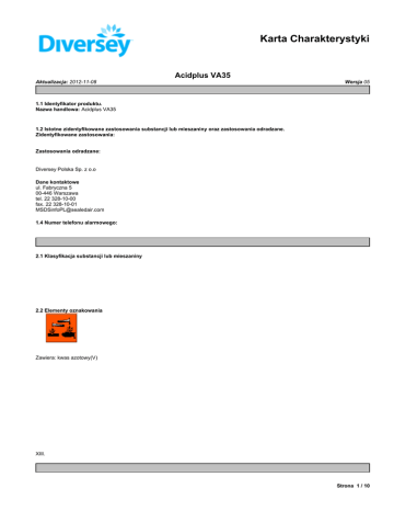 Karta Charakterystyki Acidplus VA35 Aktualizacja: 2012-11-08 Wersja 05 1.1 Identyfikator produktu. Nazwa handlowa: Acidplus VA35 1.2 Istotne zidentyfikowane zastosowania substancji lub mieszaniny oraz zastosowania odradzane. Zidentyfikowane zastosowania: Zastosowania odradzane: Diversey Polska Sp. z o.o Dane kontaktowe ul. Fabryczna 5 00-446 Warszawa tel. 22 328-10-00 fax. 22 328-10-01 [email protected] 1.4 Numer telefonu alarmowego: 2.1 Klasyfikacja substancji lub mieszaniny 2.2 Elementy oznakowania Zawiera: kwas azotowy(V) XIII. Strona 1 / 10 KARTA CHARAKTERYSTYKI Acidplus VA35 3.2 Mieszaniny kwas azotowy(V) Numer WE Numer CAS Numer REACH Klasyfikacja 231-714-2 7697-37-2 01-2119487297-23 C,O; R8-35 Klasyfikacja zgodna z Uwagi (WE) 1272/2008 Skin Corr. 1A (H314) Met. Corr. 1 (H290) Ox. Liq. 3 (H272) (EUH071) Procent wagowy 30-50 * Polimer. Informacje ogólne Wdychanie Kontakt z oczami pierwszej pomocy: Wdychanie Kontakt z oczami substancji, patrz sekcja 11. alkoholu. 6.4 Odniesienia do innych sekcji Strona 2 / 10 KARTA CHARAKTERYSTYKI Acidplus VA35 Zgodnie z przepisami lokalnymi i krajowymi. siarczyny. Podstawowe warunki przechowywania 10.4. kwas azotowy(V) dopuszczalne dopuszczalne 1.4 mg/m3 (NDSCh) 2.6 mg/m3 Zalecane procedury monitorowania: krótkoterminowe skutki miejscowe krótkoterminowe skutki ogólnoustrojowe skutki miejscowe skutki ogólnoustrojowe danych danych danych danych krótkoterminowe skutki miejscowe krótkoterminowe skutki ogólnoustrojowe (mg / kg mc) skutki miejscowe skutki ogólnoustrojowe (mg / kg mc) danych danych danych danych krótkoterminowe skutki miejscowe krótkoterminowe skutki ogólnoustrojowe (mg / kg mc) skutki miejscowe skutki ogólnoustrojowe (mg / kg mc) danych danych danych danych krótkoterminowe skutki miejscowe krótkoterminowe skutki ogólnoustrojowe skutki miejscowe skutki ogólnoustrojowe kwas azotowy(V) kwas azotowy(V) kwas azotowy(V) 3) kwas azotowy(V) 2.6 1.3 danych danych Strona 3 / 10 KARTA CHARAKTERYSTYKI Acidplus VA35 3) krótkoterminowe skutki miejscowe kwas azotowy(V) krótkoterminowe skutki ogólnoustrojowe 1.3 skutki miejscowe skutki ogólnoustrojowe 0.65 danych Wody powierzchniowe, (mg / l) danych danych Okresowe (mg / l) Oczyszczalnia danych danych danych Osady morskie (mg / kg) Gleba (mg / kg) W powietrzu (mg/m3) (mg / kg) danych danych danych danych kwas azotowy(V) kwas azotowy(V) produktu: Okulary ochronne lub gogle (EN166). Ochrona oczu / twarzy: Czas przebicia >= 480 min Czas przebicia >= 30 min skóry i/ lub rozbryzgi. Ochrona dróg oddechowych: wód powierzchniowych i wód gruntowych. roztworem roboczym produktu: 4 . Ochrona oczu / twarzy: Strona 4 / 10 KARTA CHARAKTERYSTYKI Acidplus VA35 Czas przebicia >= 480 min Czas przebicia >= 30 min Ochrona dróg oddechowych: Metoda/ uwaga Barwa Przejrzysty Bezbarwny Zapach Charakterystyczny Próg zapachu Nie dotyczy. pH: Nie dotyczy. Podtrzymuje palenie: Nie dotyczy. 1.29 g/cm³ (20°C) 9.2. Inne informacje Korozja metali (zgodnie z IMDG/ADR): Strona 5 / 10 KARTA CHARAKTERYSTYKI Acidplus VA35 metalami. SEKCJA 11: Informacje toksykologiczne Mieszaniny Punkt Gatunek: Metoda Czas ekspozycji (h) Gatunek: Metoda Czas ekspozycji (h) Gatunek: Metoda Czas ekspozycji (h) Szczur OECD 403 (EU B.2) (mg / kg) kwas azotowy(V) Brak danych Punkt (mg / kg) kwas azotowy(V) Brak danych Punkt (mg / l) kwas azotowy(V) LC 50 1562.5 Wynik Gatunek Królik Metoda Metody nie podano Czas ekspozycji Wynik Gatunek Metoda Metody nie podano Czas ekspozycji Wynik Gatunek Metoda Czas ekspozycji Gatunek Metoda Czas ekspozycji (h) Gatunek Metoda Czas ekspozycji kwas azotowy(V) kwas azotowy(V) kwas azotowy(V) danych. Wynik kwas azotowy(V) danych Wynik kwas azotowy(V) danych Strona 6 / 10 KARTA CHARAKTERYSTYKI Acidplus VA35 Punkt Gatunek Metoda Szczur OECD 422, oral Gatunek Metoda Czas ekspozycji (dni) Gatunek Metoda Czas ekspozycji (dni) (mg/kg bw/d) kwas azotowy(V) NOAEL 1500 Punkt (mg/kg bw/d) kwas azotowy(V) Czas ekspozycji (dni) 28 Brak danych Punkt (mg/kg bw/d) kwas azotowy(V) Brak danych Drogi Punkt Gatunek Metoda Czas ekspozycji (dni) (mg/kg bw/d) kwas azotowy(V) Komentarze docelowe Brak danych Dane mieszaniny: Zmiana kwas azotowy(V) Wynik (in vitro) Metoda (in vitro) Wynik (in vivo) Metoda (in vivo) kwas azotowy(V) Punkt kwas azotowy(V) Specyficzny efekt NOAEL Gatunek (mg / kg mc / d) 1500 Metoda Szczur Czas ekspozycji inne skutki OECD 422, oral Potencjalne szkodliwe skutki dla zdrowia i objawy SEKCJA 12: Informacje ekologiczne Mieszaniny Brak danych dla mieszaniny. Punkt Gatunek Metoda Gambusia affinis Metody nie podano Gatunek Metoda Daphnia magna Straus Brak wytycznych do badania (mg / l) kwas azotowy(V) LC 50 72 Punkt (mg / l) kwas azotowy(V) EC 50 8609 Czas ekspozycji (h) 96 Czas ekspozycji (h) 24 Strona 7 / 10 KARTA CHARAKTERYSTYKI Acidplus VA35 Punkt Gatunek Metoda badawcza Czas ekspozycji (h) Gatunek Metoda Czas ekspozycji (dni) Inokulum Metoda Czas ekspozycji (mg / l) kwas azotowy(V) Brak danych Punkt (mg / l) kwas azotowy(V) Brak danych Punkt (mg / l) Brak kwas azotowy(V) danych Punkt kwas azotowy(V) LD (mg / l) 8226 50 Punkt Gatunek Metoda Oncorhynchus mykiss Metody nie podano Gatunek Metoda (mg / l) Brak kwas azotowy(V) Czas ekspozycji 96 godzin (a) (y) Zaobserwowano efekty Czas ekspozycji Zaobserwowane skutki danych Biodegradacja Inokulum Metoda analityczna DT50 kwas azotowy(V) Metoda Ocena Nie dotyczy (substancji nieorganicznej) Metoda Ocena Komentarz Strona 8 / 10 KARTA CHARAKTERYSTYKI Acidplus VA35 kwas azotowy(V) Nie dotyczy, nie ulega bioakumulacji danych Gatunek Metoda Ocena Komentarz kwas azotowy(V) danych Adsorpcja / desorpcja w glebie lub osadzie adsorpcji Log Koc desorpcji Log Koc(des) Metoda badawcza Gleba / typ osadu Ocena kwas azotowy(V) danych wodnym 13.1. Metody unieszkodliwiania odpadów 20 01 14* - Kwasy. Katalog odpadów: Puste opakowanie Zalecenie: ADR, RID, ADN, IMO / IMDG, ICAO / IATA 14.1 Numer UN (numer ONZ): 2031 Kwas azotowy , roztwór Nitric acid , solution Klasa: 8 Nalepk