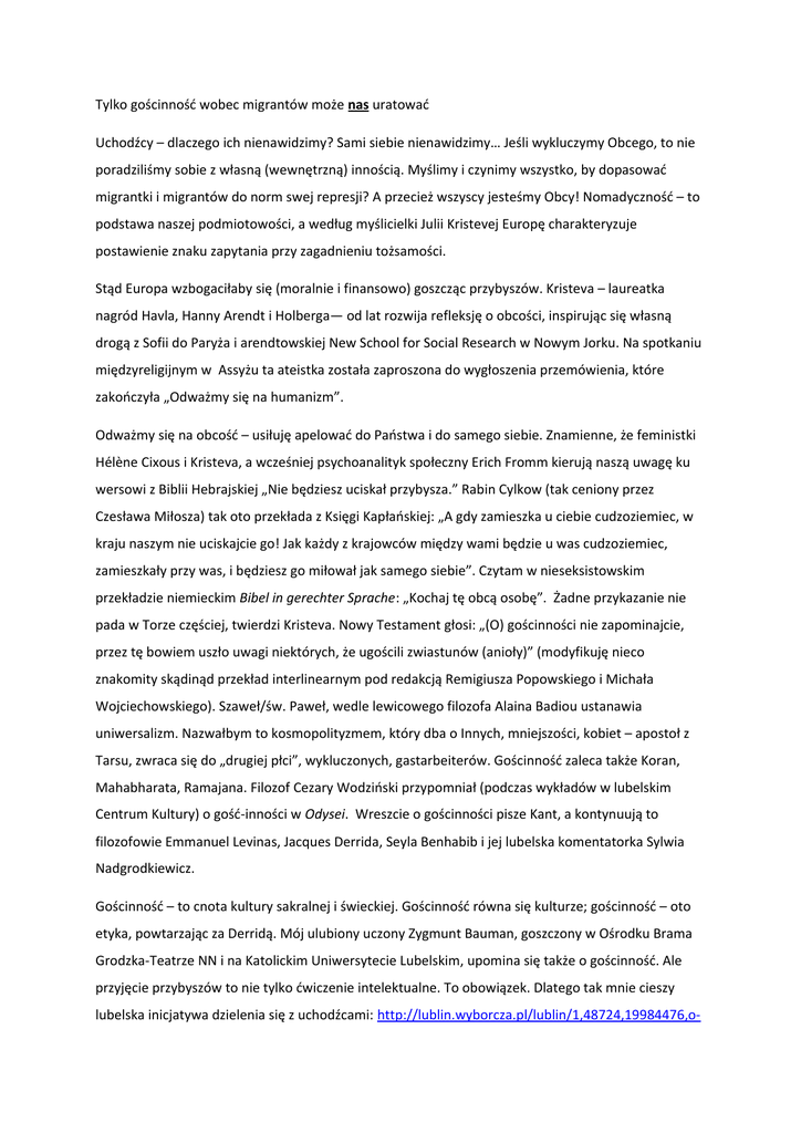 Tylko gościnność wobec migrantów może nas uratować Uchodźcy – dlaczego ich nienawidzimy? Sami siebie nienawidzimy… Jeśli wykluczymy Obcego, to nie poradziliśmy sobie z własną (wewnętrzną) innością. Myślimy i czynimy wszystko, by dopasować migrantki i migrantów do norm swej represji? A przecież wszyscy jesteśmy Obcy! Nomadyczność – to podstawa naszej podmiotowości, a według myślicielki Julii Kristevej Europę charakteryzuje postawienie znaku zapytania przy zagadnieniu tożsamości. Stąd Europa wzbogaciłaby się (moralnie i finansowo) goszcząc przybyszów. Kristeva – laureatka nagród Havla, Hanny Arendt i Holberga— od lat rozwija refleksję o obcości, inspirując się własną drogą z Sofii do Paryża i arendtowskiej New School for Social Research w Nowym Jorku. Na spotkaniu międzyreligijnym w Assyżu ta ateistka została zaproszona do wygłoszenia przemówienia, które zakończyła „Odważmy się na humanizm”. Odważmy się na obcość – usiłuję apelować do Państwa i do samego siebie. Znamienne, że feministki Hélène Cixous i Kristeva, a wcześniej psychoanalityk społeczny Erich Fromm kierują naszą uwagę ku wersowi z Biblii Hebrajskiej „Nie będziesz uciskał przybysza.” Rabin Cylkow (tak ceniony przez Czesława Miłosza) tak oto przekłada z Księgi Kapłańskiej: „A gdy zamieszka u ciebie cudzoziemiec, w kraju naszym nie uciskajcie go! Jak każdy z krajowców między wami będzie u was cudzoziemiec, zamieszkały przy was, i będziesz go miłował jak samego siebie”. Czytam w nieseksistowskim przekładzie niemieckim Bibel in gerechter Sprache: „Kochaj tę obcą osobę”. Żadne przykazanie nie pada w Torze częściej, twierdzi Kristeva. Nowy Testament głosi: „(O) gościnności nie zapominajcie, przez tę bowiem uszło uwagi niektórych, że ugościli zwiastunów (anioły)” (modyfikuję nieco znakomity skądinąd przekład interlinearnym pod redakcją Remigiusza Popowskiego i Michała Wojciechowskiego). Szaweł/św. Paweł, wedle lewicowego filozofa Alaina Badiou ustanawia uniwersalizm. Nazwałbym to kosmopolityzmem, który dba o Innych, mniejszości, kobiet – apostoł z Tarsu, zwraca się do „drugiej płci”, wykluczonych, gastarbeiterów. Gościnność zaleca także Koran, Mahabharata, Ramajana. Filozof Cezary Wodziński przypomniał (podczas wykładów w lubelskim Centrum Kultury) o gość-inności w Odysei. Wreszcie o gościnności pisze Kant, a kontynuują to filozofowie Emmanuel Levinas, Jacques Derrida, Seyla Benhabib i jej lubelska komentatorka Sylwia Nadgrodkiewicz. Gościnność – to cnota kultury sakralnej i świeckiej. Gościnność równa się kulturze; gościnność – oto etyka, powtarzając za Derridą. Mój ulubiony uczony Zygmunt Bauman, goszczony w Ośrodku Brama Grodzka-Teatrze NN i na Katolickim Uniwersytecie Lubelskim, upomina się także o gościnność. Ale przyjęcie przybyszów to nie tylko ćwiczenie intelektualne. To obowiązek. Dlatego tak mnie cieszy lubelska inicjatywa dzielenia się z uchodźcami: http://lublin.wyborcza.pl/lublin/1,48724,19984476,o- wisniewski-nie-mozemy-bronic-chrzescijanstwa-zamykajac.html#ixzz47gBKLBKL Homo Faber, adwokaci i anarchiści, dziennikarze, festiwal Transeuropa i Paweł Anansi przyjaźnią się z migrantami; Pracownia Sztuki Zaangażowanej Społecznie nagrała nazwy przystanków w Lublinie, czytane przez Czeczenów; Dom Kultury na Węglinie zaprasza znakomity spektakl przeciw ksenofobii Pobyt tolerowany Weroniki Fibich i Ewy Łukasiewicz z teatru Kana; Centrum Spotkania Kultur rozpoczyna działalność nie tylko przewidywalnym bel canto, ale także koncertem muzyki świata, prowadzonym przez czarnoskórych didżejów; z Piotrem Brożkiem nakręciłem filmik zapraszający uchodźców: https://vimeo.com/138445588 I, co najważniejsze, Centrum Wolontariatu pomaga uchodźcom w sposób konkretny i efektywny. A teraz z inspiracji zawsze o. Ludwika Wiśniewskiego, profesorowie (internowani w stanie wojennym) Jerzy Bartmiński i Wojciech Samoliński proponują otwierać serca na uchodźców. Wzorem gościnności była dla mnie zawsze prof. Irena Sławińska, wykładowczyni KULu, Brown, Lowanium i Toronto, którą „Gazeta Wyborcza” nazwała „wielką humanistką”. Ta wilniuczka już w szkole miała przyjaciółki Żydówki i Tatarki; Jej mentor Manfred Kridl (który według mnie wywarł także wpływ na kompana Sławińskiej, Czesława Miłosza) wprowadzał innowacyjne idee Szkoły Praskiej; Irena Sławińska broniła kolegów przed antysemickimi pałkarzami. I dziś trzeba sprzeciwu wobec szowinistów. Narodowcy cierpią bowiem nie tylko na fobie, ale i zakochanie się w śmierci, nekrofilię (posiłkuje się tu Frommem). Wybitny historyk Jan Tomasz Gross znowu trafia w punkt: to nieprzypadkowo nasza część Europy odrzuca uchodźców –http://www.tokfm.pl/blogi/zmiana/2015/09/gross__znow__ma_racje/1 Kulturoznawczyni Agata Araszkiewicz analizuje sprawę Gorgonowej: ta „obca” została oskarżona o wszelkie zło. Ultranacjonaliści głoszą śmierć zdrajcom ojczyzny. Rządzi nimi popęd śmierci. Nienawistnicy (jak ich trafnie nazywa red. Małgorzata Bielecka-Hołda) nie maja prawa zawłaszczyć naszej sfery publicznej. Sprzeciwmy się temu: idźmy za miłością egzystencji. W trakcie wizyty w naszym kraju, kulturę gościnności proponował Polsce Franciszek: http://www.tokfm.pl/blogi/zmiana/2016/08/papiezdemokrata_w_antydemokratycznym_kraju_prop ozycja_franciszka_dla_polski_to_goscinnosc_wobec_wszelkich_obcych/1 Odważmy się przyjmować Przybyszki i Przybyszów! Odważmy się być ludźmi… Altruistycznie, a zarazem w naszym własnym interesie. Tomasz Kitliński PIERWODRUK W „3maj” – PODZIĘKOWANIA DLA O. TOMASZA DOSTATNIEGO Dr Tomasz Kitliński jest autorem książki przeciw ksenofobii „Obcy jest w nas” i przeciw homofobii „Miłość i demokracja” (współautor: Paweł Leszkowicz, kurator wystawy „Ars Homo Erotica” w w