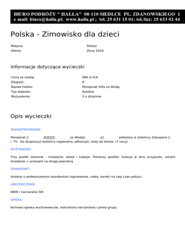 Polska - Zimowisko dla dzieci Miejsce: Polska Oferta: Zima 2016 Informacje dotyczące wycieczki Cena za osobę: 990 zł PLN Długość: 8 Nazwa hotelu: Pensjonat Villa za Wodą Typ dojazdu: Autokar Wyżywienie: 3 x dziennie Opis wycieczki ZAKWATEROWANIE: Pensjonat Ḁ圀椀氀氀愀 za Woda ᴀ położony w dzielnicy Zakopane i TV. Do dyspozycji świetlica regionalna, piłkarzyki, stoły do tenisa. (7 nocy) WYŻYWIENIE: Trzy posiłki dziennie - śniadanie, obiad i kolacja. Pierwszy posiłek: kolacja w dniu przyjazdu, ostatni śniadanie + prowiant na drogę powrotną TRANSPORT: Autokar o podwyższonym standardzie (ogrzewanie, video, barek) na cały czas pobytu. UBEZPIECZENIE: NNW i narciarskie SKI OPIEKA: fachowa opieka wychowawców, instruktora narciarstwa i pilota grupy. PROGRAM: narty, narty – doskonalenie umiejętności narciarskich podopieką wychowawców i instruktora na stokach narciarskich w Zakopanem, Bukowinie Tatrzańskiej (ok. 4 godz. dziennie), Wycieczka po Zakopanem-Kaplica na Jaszczurówce, skocznia narciarska, najdłuższa ulica miasta – Krupówki, Udział w pokazie słowno-muzycznym u gawędziarza wMurzasichlu, zajęcia świetlicowe + ognisko w zimowej scenerii, kulig góralski na saniach w okolicy ośrodka, dyskoteka w karczmie góralskiej przy muzyce. CENA OBEJMUJE: Transport autokarowy, ubezpieczenie NNW, 7 noclegów z wyżywieniem FB (3 z dziennie) , opieka wychowawców, pilota i instruktora narciarskiego, zajęcia programowe. CENA NIE OBEJMUJE: Wypożyczenie kompletu nart ok. 20-25 zł / osoba/dzień Karnety narciarskie płatne dodatkowo w zależności od wykorzystania tras - sugerujemy ok. 40 50 zł. dziennie. Dopłata do nauki jazdy na snowboardzie ጀꀀ (realizowane 140 przy zł./os. grupie min. 4 osobowej). ZABIERZ ZE SOBĄ: Narty, obuwie zimowe, rękawiczki + 2 pary grubych skarpet, zimowa kurtka, ciepły sweter lub polar, ciepłe czapki, szalik, krem ochronny zimowy, bielizna osobista na zmianę, przybory toaletowe, ręczniki, obuwie sportowe, strój kąpielowy, klapki, mały plecak. Proponowane kieszonkowe - ok. 100 zł (na własne wydatki). Zalecane jest posiadanie kasku ochronnego (dla osób jeżdżących na nartach) WYCIECZKI FAKULTATYWNE: (dla chętnych) Wycieczka do Parku Wodnego w Zakopanem (ok. 19 zł/ osoba – wejście na 2 godz.) Termy Wodne w Szaflarach (27 zł/os wejście na 2,5 godz.) MIASTA WYJAZDOWE: Wyjazd: Siedlce - godz 7:00 (przed Dworzec PKP) Warszawa - godz. 9:00 (PKiN przed Muzeum Techniki) Przyjazd: Warszawa - ok. godz. 20:00 (PKiN przed Muzeum Techniki) Siedlce - ok godz. 22:00 (przed Dworzec PKP)