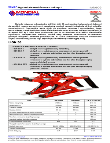 KATALOG WIMAD Wyposażanie serwisów samochodowych MONDIAL Dźwigniki nożycowe jednosekcyjne MONDIAL LION 50 są dźwignikami uniwersalnymi służącymi do wszelkich napraw mechanicznych, przeglądów, regulacji geometrii ustawienia kół i osi pojazdów samochodowych. Poszczególne wersje różnią się sposobem zabudowy i wyposażeniem. Wersje naposadzkowe posiadają od strony tylnej dźwignika długie rampy wjazdowe. Udźwig dźwigników LION 50 wynosi 5000 kg i dzięki temu przeznaczony jest on do unoszenia także lekkich samochodów ciężarowych. Zabezpieczenie stanowią stalowe listwy metalowe zamocowane na siłownikach głównych dźwignika i zwalniane pneumatycznie. W LION-ie zastosowano wyłącznie bezdotykowe czujniki elektroindukcyjne oraz ślizgi, zapewniające komfortową i bezawaryjną pracę. LION 50 Dźwigniki LION 50 występują w następujących wersjach: • LION 50-50 S • LION 50-50 A • LION 50-50 GT • LION 50-50 GTPD - dźwignik nożycowy jednosekcyjny standardowy, - dźwignik nożycowy jednosekcyjny przeznaczony do pomiaru geometrii, wyposażony w wybranie pod obrotnice oraz dwie tylne, dwuczęściowe płyty przesuwne, - dźwignik nożycowy jednosekcyjny przeznaczony do pomiaru geometrii, wyposażony w wybranie pod obrotnice oraz dwie tylne, dwuczęściowe płyty przesuwne i dźwignik progowy, - dźwignik nożycowy jednosekcyjny przeznaczony do pomiaru geometrii, wyposażony w wybranie pod obrotnice oraz dwie tylne, dwuczęściowe płyty przesuwne + "szarpak". Dane LION 50-50 S LION 50-50 A LION 50-50 GT/GTPD Wznios maksymalny 2150 mm 2150 mm 2150 mm Długość platform 5000 mm 5000 mm 5000 mm Szerokość platform 660 mm 660 mm 660 mm Rozstaw platform 800 mm 800 mm 800 mm Minimalna długość platform dźwignika progowego – – 1530 mm Maksymalna długość platform dźwignika progowego – – 1850 mm Wysokość podnoszenia dźwignika progowego – – 450 mm – – 500 mm 45 s 45 s 45 s Szerokość platform dźwignika progowego Czas podnoszenia / opuszczania Czas podnoszenia / opuszczania dźwignika progowego Zasilanie elektryczne Zasilanie pneumatyczne Silnik elektryczny – – 15 s 230/400 V/50 Hz 230/400 V/50 Hz 230/400 V/50 Hz 4-8 bar 4-8 bar 4-8bar 3 kW 3 kW 3 kW Tel./Fax: +48 71 346 66 26 http://www.wimad.com.pl Publikacja ta nie stanowi oferty w rozumieniu prawa i ma charakter informacyjny. Zastrzegamy sobie prawo do zmian w zakresie modyfikacji produktów. Kolory przedstawione mogą różnić się od oryginałów. Za ewentualne błędy w druku firma nie ponosi odpowiedzialności.