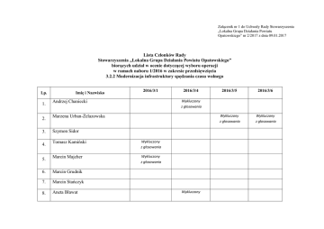 Załącznik nr 1 do Uchwały Rady Stowarzyszenia „Lokalna Grupa Działania Powiatu Opatowskiego” nr 2/2017 z dnia 09.01.2017 Lista Członków Rady Stowarzyszenia „Lokalna Grupa Działania Powiatu Opatowskiego” biorących udział w ocenie dotyczącej wyboru operacji w ramach naboru 1/2016 w zakresie przedsięwzięcia 3.2.2 Modernizacja infrastruktury spędzania czasu wolnego Lp. 1. 2. 3. 4. 5. Imię i Nazwisko 2016/3/1 2016/3/4 Marzena Urban-Żelazowska Szymon Sidor Tomasz Kamiński Wykluczony z głosowania Marcin Majcher Wykluczony z głosowania Marcin Grudnik 7. Marcin Stańczyk 8. Aneta Bławat 2016/3/6 Wykluczony z głosowania Wykluczony z głosowania Wykluczony z głosowania Andrzej Chaniecki 6. 2016/3/5 Wykluczony z głosowania 9. 10. Jarosław Basak Maciej Dwojak 11. Tomasz Sadak 12. Roman Golek Wykluczony z głosowania Wykluczony z głosowania Wykluczony z głosowania
