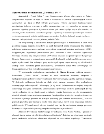 Sprawozdanie z seminarium „Co dalej z 1%?” Kwartalnik „Trzeci Sektor” oraz Stowarzyszenie Forum Darczyńców w Polsce zorganizowali wspólnie 21 maja 2012 roku w Warszawie w Centrum Konferencyjnym Wilcza seminarium Co dalej z 1%? Obrady poświęcono różnym aspektom funkcjonowania mechanizmu jednego procentu, a także zastanawiano się, czy potrzebne są zmiany na poziomie regulacji prawnych. Pytanie o zakres tych zmian wydaje się o tyle zasadne, że chociaż jest to mechanizm stosunkowo prosty – wystarczy w zeznaniu podatkowym wskazać wybraną organizację pożytku publicznego, a transferu środków dokonuje urząd skarbowy – korzysta z niego jedynie co trzeci płacący podatki Polak. Na mocy ustawy o działalności pożytku publicznego i o wolontariacie z 2003 roku podatnik płacący podatek dochodowy od osób fizycznych może przeznaczyć 1% podatku należnego państwu na rzecz wybranej przez siebie organizacji pożytku publicznego (OPP). Przypomnijmy, organizacje pozarządowe (oraz zrównane z nimi kościelne organizacje trzeciego sektora), aby otrzymać status OPP (status uzyskuje się przez wpis do Krajowego Rejestru Sądowego), organizacja musi prowadzić działalność pożytku publicznego na rzecz ogółu społeczności lub słabszych grup społecznych (przy czym obszary tej działalności zostały ściśle określone przez ustawodawcę). Dodatkowo status OPP zobowiązuje do transparentności, w tym rozbudowanej sprawozdawczości. W wystąpieniu otwierającym seminarium dr Marek Rymsza, redaktor naczelny kwartalnika „Trzeci Sektor”, wskazał na dwa zasadnicze problemy związane z funkcjonowaniem jednoprocentowych alokacji. Pierwszy dotyczy aspektu legitymizacyjnego. W dyskursie publicznym ścierają się dwie wizje jednego procentu: jako mechanizmu wspierającego dobroczynność i filantropię (w tej wersji jednoprocentowe odpisy to quasidarowizny) oraz jako instrumentu uspołecznienia dystrybucji środków publicznych (w tej wersji podatnicy nie są filantropami, a jedynie wydają dyspozycje co do przeznaczenia niewielkiej części odprowadzonego podatku). Drugi problem wiąże się z wątpliwościami, na ile środki z jednego procentu to pieniądz publiczny (jak zakładał ustawodawca), a na ile pieniądz prywatny (jak traktuje te środki wielu obywateli, a nawet część organizacji pożytku publicznego). W konsekwencji nie ma jasności, czy i na ile mechanizm jednego procentu kształtuje w obywatelach postawy prospołeczne i społeczną wrażliwość. Zdaniem dr Tomasza Perkowskiego z Fundacji na rzecz Nauki Polskiej, 1 procent w obecnej formie można określić jako „fałszywą filantropię”. Państwo ma obowiązek wspierać, przez zwolnienia podatkowe, aktywność obywateli na rzecz dobra wspólnego. Tymczasem odnotowujemy spadek darowizn przekazywanych na rzecz organizacji pozarządowych z wykorzystaniem ulgi podatkowej; podatnicy za wystarczający przejaw wrażliwości społecznej uznają bowiem przekazanie OPP 1% podatku. Polacy nie rozumieją idei jednego procenta, ale ta, paradoksalnie, święci tryumfy, o czym świadczy wydłużająca się lista potencjalnych beneficjentów alokacji podatkowych. Rząd przedstawił propozycję, aby podobnym mechanizmem objąć kościoły i związki wyznaniowe, zgłaszane są też pomysły analogicznych rozwiązań dla wyższych uczelni i partii politycznych. Prelegent uznał też, że warto byłoby niezagospodarowaną część jednego procentu (a więc środki, których obywatele nie zadysponowali na rzecz konkretnych OPP) przekazać niezależnym funduszom żelaznym. Te finansowałyby innowacyjne działania organizacji pozarządowych, korzystnie odróżniając się od Funduszu Inicjatyw Obywatelskich, wspierającego przedsięwzięcia standardowe. Z kolei Magdalena Pękacka z Forum Darczyńców w Polsce przedstawiła wyniki zrealizowanego na zamówienie Forum badania „losów” jednoprocentowych alokacji oraz ich beneficjentów – organizacji pożytku publicznego. Badanie jednoznacznie potwierdziło, że Polacy przekazują środki z jednego procenta w pierwszej kolejności organizacjom charytatywnym. Przy tym w jednoprocentowym „rozdaniu” zauważalna jest dominacja niewielkiej liczby dużych, silnych organizacji z tej grupy. Z prezentacją Magdaleny Pękackiej korespondowało wystąpienie Rafała Załęskiego, który wskazał na ogromne dysproporcję w dostępie do mediów wśród organizacji pożytku publicznego, a także omówił różne strategie przekazy wykorzystywane przez poszczególne OPP w reklamach zachęcających do przekazywania jednego procentu na ich konto. Większość organizacji preferuje odwoływanie się do emocji, np. litości (epatowanie zdjęciami chorych dzieci), ale są też kampanie w większym stopniu stawiające na przekaz informacyjny. Można przy tym mówić o kształtowaniu się swoistego rynku jednoprocentowych reklam, który, niestety, generuje koszty. Praktyczne aspekty funkcjonowania mechanizmu jednego procentu były przedmiotem ożywionej dyskusji przedstawicieli OPP w drugiej części spotkania, którą prowadziła Ewa Kulik-Bielińska z Fundacji im. Stefana Batorego. Maja Jaworska z Fundacji Anny Dymnej „Mimo wszystko” (należącej do grona największych beneficjentów jednoprocentowych alokacji) wskazała, że subkonta, zakładane w celu gromadzenia jednoprocentowych odpisów z przeznaczeniem dla konkretnych beneficjentów choć praktykowane przez cześć OPP (w tym fundację „Mimo wszystko”), stanowią problem w zarządzaniu organizacjami i zgromadzonymi przez nie zasobami. Podała konkretne przykłady sytuacji niejasnych i spornych. Irena Gadaj z Biłgorajskiego Funduszu Lokalnego zaznaczyła, jak ważne są jednoprocentowe alokacje dla lokalnych organizacji pozarządowych. Nie prowadzą one ogólnopolskich kampanii i nie pozyskują tak dużych środków jak organizacje dobroczynne o zasięgu ogólnopolskim, ale dla wielu z nich jednoprocentowe alokacje to is