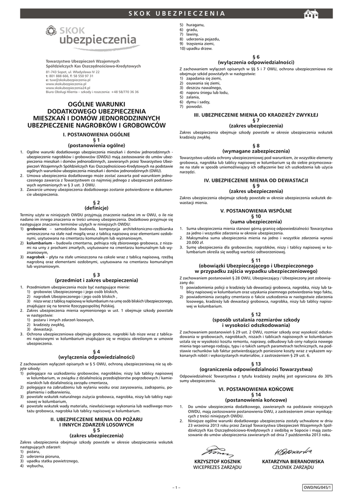 SKOK UBEZPIECZENIA 5) huraganu, 6) gradu, 7) lawiny, 8) uderzenia pojazdu, 9) trzęsienia ziemi, 10)upadku drzew. §6 (wyłączenia odpowiedzialności) Towarzystwo Ubezpieczeń Wzajemnych Spółdzielczych Kas Oszczędnościowo-Kredytowych Z zachowaniem wyłączeń opisanych w §§ 5 i 7 OWU, ochrona ubezpieczeniowa nie obejmuje szkód powstałych w następstwie: 1) zapadania się ziemi, 2) osuwania się ziemi, 3) deszczu nawalnego, 4) naporu śniegu lub lodu, 5) zalania, 6) dymu i sadzy, 7) powodzi. 81-743 Sopot, ul. Władysława IV 22 t: 801 888 666, f: 58 550 97 31 e: [email protected] www.skokubezpieczenia.pl www.skokubezpieczenia24.pl Biuro Obsługi Klienta – szkody i roszczenia: +48 58/770 36 36 OGÓLNE WARUNKI DODATKOWEGO UBEZPIECZENIA MIESZKAŃ I DOMÓW JEDNORODZINNYCH UBEZPIECZENIE NAGROBKÓW I GROBOWCÓW III. UBEZPIECZENIE MIENIA OD KRADZIEŻY ZWYKŁEJ §7 (zakres ubezpieczenia) Zakres ubezpieczenia obejmuje szkody powstałe w okresie ubezpieczenia wskutek kradzieży zwykłej. I. POSTANOWIENIA OGÓLNE §1 (postanowienia ogólne) 1. Ogólne warunki dodatkowego ubezpieczenia mieszkań i domów jednorodzinnych ubezpieczenie nagrobków i grobowców (OWDU) mają zastosowanie do umów ubezpieczenia mieszkań i domów jednorodzinnych, zawieranych przez Towarzystwo Ubezpieczeń Wzajemnych Spółdzielczych Kas Oszczędnościowo-Kredytowych na podstawie ogólnych warunków ubezpieczenia mieszkań i domów jednorodzinnych (OWU). 2. Umowa ubezpieczenia dodatkowego może zostać zawarta pod warunkiem jednoczesnego zawarcia z Towarzystwem co najmniej jednego z ubezpieczeń podstawowych wymienionych w § 3 ust. 3 OWU. 3. Zawarcie umowy ubezpieczenia dodatkowego zostanie potwierdzone w dokumencie ubezpieczenia. §2 (definicje) Terminy użyte w niniejszych OWDU przyjmują znaczenie nadane im w OWU, o ile nie nadano im innego znaczenia w treści umowy ubezpieczenia. Dodatkowo przyjmuje się następujące znaczenia terminów użytych w niniejszych OWDU: 1) grobowiec – samodzielna budowla, kompozycja architektoniczno-rzeźbiarska umieszczona na stałe nad mogiłą wraz z tablicą napisową oraz elementami ozdobnymi, usytuowana na cmentarzu komunalnym lub wyznaniowym, 2) kolumbarium – budowla cmentarna, pełniąca rolę zbiorowego grobowca, z niszami na urny z prochami zmarłych, usytuowane na cmentarzu komunalnym lub wyznaniowym, 3) nagrobek – płyta na stałe umieszczona na cokole wraz z tablicą napisową, rzeźbą nagrobną oraz elementami ozdobnymi, usytuowana na cmentarzu komunalnym lub wyznaniowym. §3 (przedmiot i zakres ubezpieczenia) 1. Przedmiotem ubezpieczenia może być następujące mienie: 1) grobowiec Ubezpieczonego i jego osób bliskich, 2) nagrobek Ubezpieczonego i jego osób bliskich , 3) nisza wraz z tablicą napisową w kolumbarium na urnę osób bliskich Ubezpieczonego, znajdujące się na terenie Rzeczypospolitej Polskiej. 2. Zakres ubezpieczenia mienia wymienionego w ust. 1 obejmuje szkody powstałe w następstwie: 1) pożaru i innych zdarzeń losowych, 2) kradzieży zwykłej, 3) dewastacji. 3. Ochrona ubezpieczeniowa obejmuje grobowce, nagrobki lub nisze wraz z tablicami napisowymi w kolumbarium znajdujące się w miejscu określonym w umowie ubezpieczenia. §4 (wyłączenia odpowiedzialności) Z zachowaniem wyłączeń opisanych w § 5 OWU, ochroną ubezpieczeniową nie są objęte szkody: 1) polegające na uszkodzeniu grobowców, nagrobków, niszy lub tablicy napisowej w kolumbarium, w związku z działalnością przedsiębiorstw pogrzebowych / kamieniarskich lub działalnością zarządu cmentarza, 2) polegające na zabrudzeniu lub wylaniu wosku oraz zarysowaniu, zadrapaniu, poplamieniu i odbarwieniu, 3) powstałe wskutek naturalnego zużycia grobowca, nagrobka, niszy lub tablicy napisowej w kolumbarium, 4) powstałe wskutek wady materiału, niewłaściwego wykonania lub wadliwego montażu grobowca, nagrobka lub tablicy napisowej w kolumbarium. II. UBEZPIECZENIE MIENIA OD POŻARU I INNYCH ZDARZEŃ LOSOWYCH §5 (zakres ubezpieczenia) §8 (wymagane zabezpieczenia) Towarzystwo udziela ochrony ubezpieczeniowej pod warunkiem, że wszystkie elementy grobowca, nagrobka lub tablicy napisowej w kolumbarium są do siebie przymocowane na stałe w sposób uniemożliwiający ich odłączenie bez ich uszkodzenia lub użycia narzędzi. IV. UBEZPIECZENIE MIENIA OD DEWASTACJI §9 (zakres ubezpieczenia) Zakres ubezpieczenia obejmuje szkody powstałe w okresie ubezpieczenia wskutek dewastacji mienia. V. POSTANOWIENIA WSPÓLNE § 10 (suma ubezpieczenia) 1. Suma ubezpieczenia mienia stanowi górną granicę odpowiedzialności Towarzystwa za jedno i wszystkie zdarzenia w okresie ubezpieczenia. 2. Maksymalna suma ubezpieczenia mienia na jedno i wszystkie zdarzenia wynosi 20.000 zł. 3. Sumę ubezpieczenia dla grobowców, nagrobków, niszy i tablicy napisowej w kolumbarium określa się według wartości odtworzeniowej. § 11 (obowiązki Ubezpieczającego i Ubezpieczonego w przypadku zajścia wypadku ubezpieczeniowego) Z zachowaniem postanowień § 28 OWU, Ubezpieczający / Ubezpieczony jest zobowiązany do: 1) powiadomienia policji o kradzieży lub dewastacji grobowca, nagrobka, niszy lub tablicy napisowej w kolumbarium oraz uzyskania pisemnego potwierdzenia tego faktu, 2) powiadomienia zarządcy cmentarza o fakcie uszkodzenia w następstwie zdarzenia losowego, kradzieży lub dewastacji grobowca, nagrobka, niszy lub tablicy napisowej w kolumbarium. § 12 (sposób ustalania rozmiarów szkody i wysokości odszkodowania) Z zachowaniem postanowień § 29 ust. 2 OWU, rozmiar szkody oraz wysokość odszkodowania w grobowcach, nagrobkach, niszach i tablicach napisowych w kolumbarium ustala się w wysokości kosztu remontu, naprawy, odbudowy lub ceny nabycia nowego mienia tego samego rodzaju, typu i o takich samych parametrach technicznych, na podstawie rachunków lub faktur potwierdzających poniesione koszty wraz z wykazem wykonanych robót i wykorzystanych materiałów, z zastrzeżeniem § 2