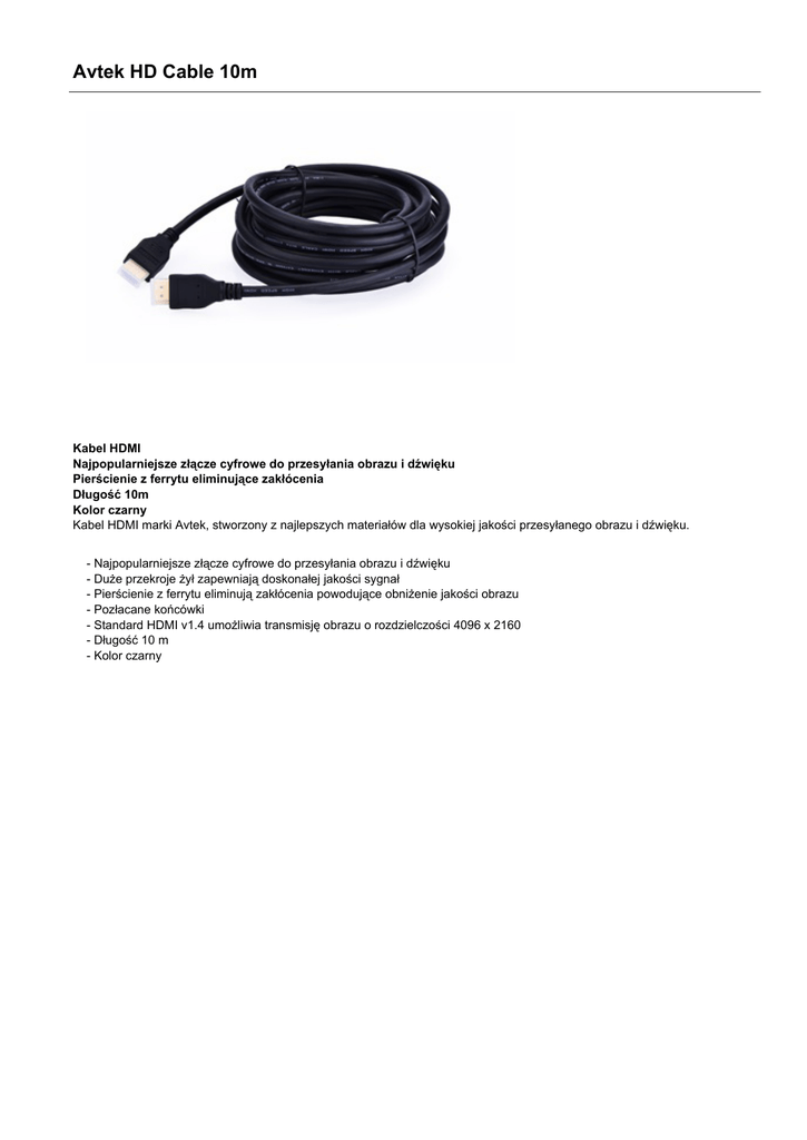 Avtek HD Cable 10m Kabel HDMI Najpopularniejsze złącze cyfrowe do przesyłania obrazu i dźwięku Pierścienie z ferrytu eliminujące zakłócenia Długość 10m Kolor czarny Kabel HDMI marki Avtek, stworzony z najlepszych materiałów dla wysokiej jakości przesyłanego obrazu i dźwięku. - Najpopularniejsze złącze cyfrowe do przesyłania obrazu i dźwięku - Duże przekroje żył zapewniają doskonałej jakości sygnał - Pierścienie z ferrytu eliminują zakłócenia powodujące obniżenie jakości obrazu - Pozłacane końcówki - Standard HDMI v1.4 umożliwia transmisję obrazu o rozdzielczości 4096 x 2160 - Długość 10 m - Kolor czarny