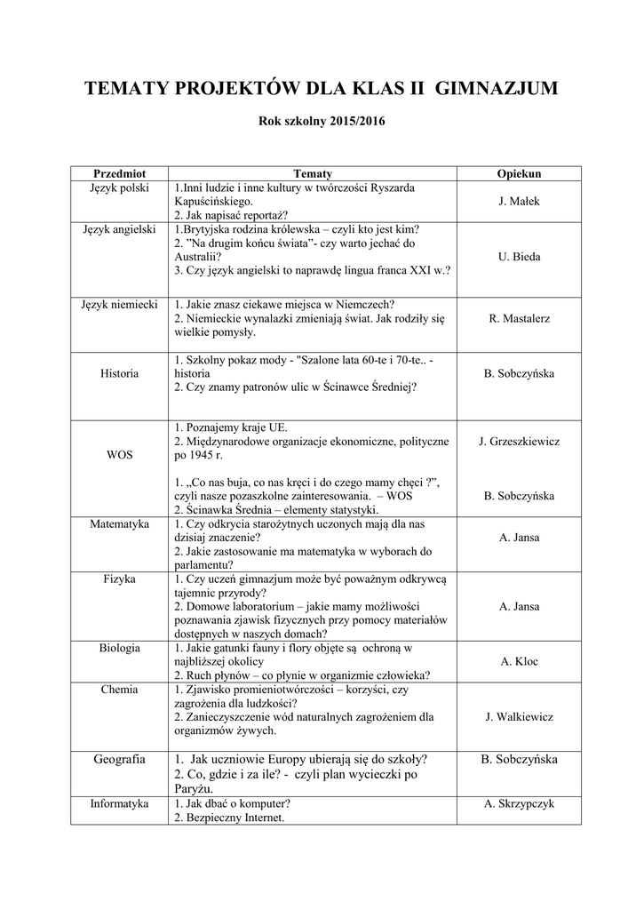 TEMATY PROJEKTÓW DLA KLAS II GIMNAZJUM Rok szkolny 2015/2016 Przedmiot Język polski Język angielski Język niemiecki Historia WOS Matematyka Fizyka Biologia Chemia Tematy 1.Inni ludzie i inne kultury w twórczości Ryszarda Kapuścińskiego. 2. Jak napisać reportaż? 1.Brytyjska rodzina królewska – czyli kto jest kim? 2. ”Na drugim końcu świata”- czy warto jechać do Australii? 3. Czy język angielski to naprawdę lingua franca XXI w.? 1. Jakie znasz ciekawe miejsca w Niemczech? 2. Niemieckie wynalazki zmieniają świat. Jak rodziły się wielkie pomysły. 1. Szkolny pokaz mody - "Szalone lata 60-te i 70-te.. historia 2. Czy znamy patronów ulic w Ścinawce Średniej? 1. Poznajemy kraje UE. 2. Międzynarodowe organizacje ekonomiczne, polityczne po 1945 r. 1. „Co nas buja, co nas kręci i do czego mamy chęci ?”, czyli nasze pozaszkolne zainteresowania. – WOS 2. Ścinawka Średnia – elementy statystyki. 1. Czy odkrycia starożytnych uczonych mają dla nas dzisiaj znaczenie? 2. Jakie zastosowanie ma matematyka w wyborach do parlamentu? 1. Czy uczeń gimnazjum może być poważnym odkrywcą tajemnic przyrody? 2. Domowe laboratorium – jakie mamy możliwości poznawania zjawisk fizycznych przy pomocy materiałów dostępnych w naszych domach? 1. Jakie gatunki fauny i flory objęte są ochroną w najbliższej okolicy 2. Ruch płynów – co płynie w organizmie człowieka? 1. Zjawisko promieniotwórczości – korzyści, czy zagrożenia dla ludzkości? 2. Zanieczyszczenie wód naturalnych zagrożeniem dla organizmów żywych. Opiekun J. Małek U. Bieda R. Mastalerz B. Sobczyńska J. Grzeszkiewicz B. Sobczyńska A. Jansa A. Jansa A. Kloc J. Walkiewicz Geografia 1. Jak uczniowie Europy ubierają się do szkoły? 2. Co, gdzie i za ile? - czyli plan wycieczki po Paryżu. B. Sobczyńska Informatyka 1. Jak dbać o komputer? 2. Bezpieczny Internet. A. Skrzypczyk Religia Technika Wf Edukacja dla bezpieczeństwa 1.Znaczenie pielgrzymek bł. Jana Pawła II dla Polski 2.Dekalog – ograniczenia czy wolność? 1.Jak zachować się w miejscu wypadku drogowego? 2.Fotografia – moja pasja. Jak zrobić dobre zdjęcie? 1. Piłka ręczna w Polsce. 2. Największe osiągnięcia polskiej L-A w latach 19302015. 1.Jak udzielić pierwszej pomocy w wypadku drogowym? I. Chyc R. Borkowski J. Kochniarczyk J. Grzeszkiewicz M. Antosik