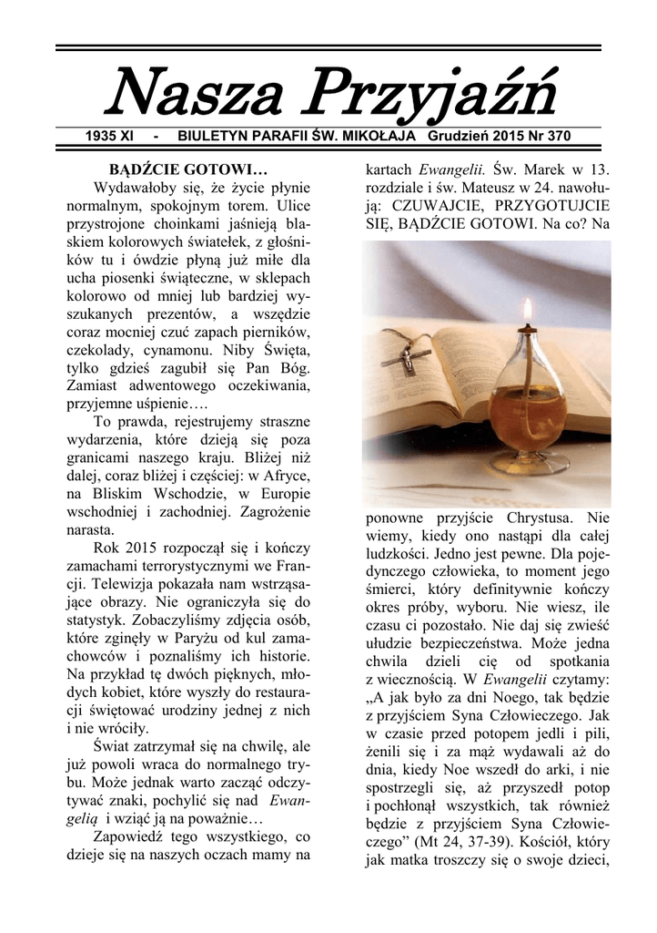 Nasza Przyjaźń 1935 XI - BIULETYN PARAFII ŚW. MIKOŁAJA Grudzień 2015 Nr 370 BĄDŹCIE GOTOWI… Wydawałoby się, że życie płynie normalnym, spokojnym torem. Ulice przystrojone choinkami jaśnieją blaskiem kolorowych światełek, z głośników tu i ówdzie płyną już miłe dla ucha piosenki świąteczne, w sklepach kolorowo od mniej lub bardziej wyszukanych prezentów, a wszędzie coraz mocniej czuć zapach pierników, czekolady, cynamonu. Niby Święta, tylko gdzieś zagubił się Pan Bóg. Zamiast adwentowego oczekiwania, przyjemne uśpienie…. To prawda, rejestrujemy straszne wydarzenia, które dzieją się poza granicami naszego kraju. Bliżej niż dalej, coraz bliżej i częściej: w Afryce, na Bliskim Wschodzie, w Europie wschodniej i zachodniej. Zagrożenie narasta. Rok 2015 rozpoczął się i kończy zamachami terrorystycznymi we Francji. Telewizja pokazała nam wstrząsające obrazy. Nie ograniczyła się do statystyk. Zobaczyliśmy zdjęcia osób, które zginęły w Paryżu od kul zamachowców i poznaliśmy ich historie. Na przykład tę dwóch pięknych, młodych kobiet, które wyszły do restauracji świętować urodziny jednej z nich i nie wróciły. Świat zatrzymał się na chwilę, ale już powoli wraca do normalnego trybu. Może jednak warto zacząć odczytywać znaki, pochylić się nad Ewangelią i wziąć ją na poważnie… Zapowiedź tego wszystkiego, co dzieje się na naszych oczach mamy na kartach Ewangelii. Św. Marek w 13. rozdziale i św. Mateusz w 24. nawołują: CZUWAJCIE, PRZYGOTUJCIE SIĘ, BĄDŹCIE GOTOWI. Na co? Na ponowne przyjście Chrystusa. Nie wiemy, kiedy ono nastąpi dla całej ludzkości. Jedno jest pewne. Dla pojedynczego człowieka, to moment jego śmierci, który definitywnie kończy okres próby, wyboru. Nie wiesz, ile czasu ci pozostało. Nie daj się zwieść ułudzie bezpieczeństwa. Może jedna chwila dzieli cię od spotkania z wiecznością. W Ewangelii czytamy: „A jak było za dni Noego, tak będzie z przyjściem Syna Człowieczego. Jak w czasie przed potopem jedli i pili, żenili się i za mąż wydawali aż do dnia, kiedy Noe wszedł do arki, i nie spostrzegli się, aż przyszedł potop i pochłonął wszystkich, tak również będzie z przyjściem Syna Człowieczego” (Mt 24, 37-39). Kościół, który jak matka troszczy się o swoje dzieci, prosi: NIE ZWLEKAJ! NIE DAJ SIĘ UŚPIĆ, ANI WYSTRASZYĆ! WYBIERZ BOGA I BEZ LĘKU PATRZ W PRZYSZŁOŚĆ! *** Przed nami Adwent, czas radosnego oczekiwania na przyjście Pana. Obyśmy go nie przespali, oby nie umknął naszej uwagi. Warto uczynić mały wysiłek i wyjść na spotkanie Tego, który przychodzi. To nasz Bóg, hojny Dawca, Światło wschodzące w ciemnościach, Słońce rozpraszające mrok. To Ten, który każdego z nas stworzył z miłością, a teraz przychodzi nam z pomocą. Od Niego wyszliśmy, do Niego zmierzamy, u Niego jest nasz dom. UROCZYSTOŚCI ODPUSTOWE KU CZCI ŚW. MIKOŁAJA Nasz Patron to Święty, którego na nowo warto odkryć. Przez całe stulecia był jednym z najczęściej przyzywanych wspomożycieli. Z uwagi na ilość łask i cudów wyproszonych za jego wstawiennictwem, nadano mu przydomek taumaturg – cudotwórca. Na przełomie pierwszego i drugiego tysiąclecia nazywano go nawet allos soter – drugim zbawcą. Darzono go tak wielką miłością, że każdy chciał go mieć u siebie. W 1087 roku mieszkańcy Bari w południowych Włoszech zorganizowali wyprawę do Miry, by w brawurowy sposób wykraść szczątki Świętego. Następnie umieścili je w okazałej bazylice w Bari, wzniesionej na tę okazję. Tam spoczywają po dziś dzień. Źródła historyczne niewiele mówią o św. Mikołaju. Żył w pierwszej połowie IV wieku na terenie dzisiejszej Turcji. Już jako młodzieniec został wybrany na biskupa Miry. Pochodził z bogatego domu, ale nie szukał zaszczytów ani rozgłosu. Przejęty Ewangelią, zapatrzony w Boga, ukochał ludzi. Znał ich problemy i każdemu starał się zaradzić, ufając w Bożą pomoc. Nic dziwnego, że już za jego życia działy się cuda. Najwięcej informacji o nich czerpiemy ze Złotej legendy, popularnego w wiekach średnich zbioru żywotów świętych, opracowanego przez dominikanina Jakuba de Voragine. To właśnie tam znajdujemy wzmiankę o tym, że po śmierci biskupa z jego ciała zaczął wydobywać się święty olej, który uzdrawiał wiele osób. Co ciekawe, wieki mijały a olej nadal płynął. Kiedy RORATY w naszym kościele parafialnym są odprawiane od poniedziałku do soboty o godz. 630 rano. Dzieci zapraszamy na roraty we wtorki, czwartki i soboty na godz. 1800. KURS BIBLIJNY: Wydział Pedagogiczny Akademii Ignatianum w Krakowie organizuje Korespondencyjny Kurs Biblijny. Jego celem jest ułatwienie poznania i rozumienia ksiąg Pisma Świętego. W kursie może brać udział każdy zainteresowany. Więcej informacji można uzyskać na stronie internetowej: www.kursbiblijny.deon.pl lub pod podanym adresem: ks. Zbigniew Marek SJ ul. Zaskale 1 30-250 Kraków [email protected] 2 mieszkańcy Bari w XI w. otworzyli grobowiec Mikołaja, ich oczom ukazały się kości skąpane w oleistej cieczy, zwanej „manną św. Mikołaja” od hebrajskiego słowa man – substancja żywiczna. Manna wydobywa się aż do dziś! *** Ufając potężnemu wstawiennictwu naszego Patrona w każdy poniedziałek zanosimy do niego nasze prośby. Można je składać do puszki przy ołtarzu bocznym w prezbiterium. *** Porządek Mszy św. w niedzielę 6 grudnia pozostaje bez zmian: 630, 8, 930, 1130 (dla dzieci), 13 (suma odpustowa) 15, 19 Rzymu, a także do katedr i kościołów wyznaczonych przez każdego biskupa diecezjalnego. W Krakowie są to: katedra na Wawelu, Sanktuarium Miłosierdzia Bożego w Łagiewnikach, Sanktuarium św. Jana Pawła II, Bazylika Mariacka, Bazylika Krzyża Świętego w Mogile. Mottem tego Świętego Roku są słowa „Miłosierni jak Ojciec”. Działająca przy naszej Parafii Pracownia Artystyczna Mali