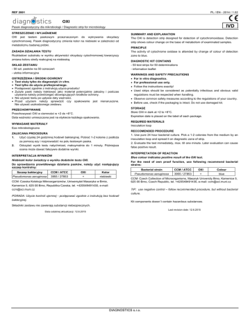 REF 2001 PL / EN - 2014 / 1.02 OXI IVD Pasek diagnostyczny dla mikrobiologii / Diagnostic strip for microbiology STRESZCZENIE I WYJAŚNIENIE OXI jest testem paskowym przeznaczonym do wykrywania oksydazy cytochromowej. Pasek diagnostyczny zmienia kolor na niebieski w zależności od metabolizmu badanej próbki. ZASADA DZIAŁANIA TESTU Rozkładowi substratu w wyniku aktywności oksydazy cytochromowej towarzyszy zmiana koloru strefy reakcyjnej na niebieską. strip shows colour change on the base of metabolism of examinated samples. PRINCIPLE The activity of cytochrome oxidase is attended by change of colour of detection zone to blue. DIAGNOSTIC KIT CONTAINS - 50 test strips for 50 determinations SKŁAD ZESTAWU - 50 szt. pasków na 50 oznaczeń - information leaflet - ulotka informacyjna OSTRZEŻENIA I ŚRODKI OCHRONY Test służy tylko do diagnostyki in vitro. Test tylko do użycia profesjonalnego. Postępować zgodnie z instrukcją użycia produktu! Zużyte paski należy traktować jako materiał potencjalnie zakaźny i podczas używania należy przestrzegać obowiązujących środków ochrony. Nie używać testu po upływie daty ważności. Przed użyciem należy sprawdzić czy opakowanie jest nienaruszone. Nie używać uszkodzonego zestawu. WARNINGS AND SAFETY PRECAUTIONS For in vitro diagnostics. For professional use only. Follow the instructions exactly! Used strips should be considered as potentially infectious and obvious valid regulations must be respected when handling. Observe common safety measures according to the regulations of your country. Before use, check if the packaging is intact. Do not use damaged kit. STORAGE Store OXI in dark at +2 to +8°C. PRZECHOWYWANIE Przechowywać OXI w ciemności w +2 do +8°C. Data ważności umieszczona jest na etykiecie każdego opakowania. Expiration date is placed on the label of each package. REQUIRED MATERIALS Inoculation loop WYMAGANE MATERIAŁY Eza mikrobiologiczna ZALECANA PROCEDURA 1. Użyć czystej 24 godzinnej hodowli bakteryjnej. Pobrać 1-2 kolonie z podłoża za pomocą ezy i rozprowadzić na polu testowym paska. 2. SUMMARY AND EXPLANATION The OXI is detection strip designed for detection of cytochromoxidase. Detection Odczytać wynik testu natychmiast, maksymalnie do 1 minuty. Późniejsza ocena może dawać fałszywie dodatnie wyniki. RECCOMENDED PROCEDURE 1. Use pure 24 hour bacterial culture. Pick a 1-2 colonies from the medium by an inoculation loop and spread it on diagnostic zone of strip. 2. Evaluate the test immediately, max. till one minute. Later evaluation can cause false positive result. INTERPRETATION OF REACTION Blue colour indicates positive result of the OXI test. INTERPRETACJA WYNIKÓW Niebieski kolor świadczy o wyniku dodatnim testu OXI. Do sprawdzenia prawidłowego działania pasków, należy użyć następujący szczep kontrolny: Szczep bakteryjny CCM / ATCC OXI Kolor Pseudomonas aeruginosa 3955 / 27853 + niebieski CCM: Czeska Kolekcja Mikroorganizmów, Uniwersytet Masaryka w Brnie, Kamenice 5, 625 00 Brno, Republika Czeska, tel. +420549491430, e-mail: [email protected] PORADA: Użycie kontroli ujemnej - postępować zgodnie z instrukcją bez hodowli bakteryjnej. For the need of own proof function, use following recommend bacterial strains: Bacterial strain CCM / ATCC OXI Colour Pseudomonas aeruginosa 3955 / 27853 + blue CCM: Czech Collection of Microorganisms, Masaryk University Brno, Kamenice 5, 625 00 Brno, Czech Republic, tel. +420549491430, e-mail: [email protected] TIP: use negative control – follow recommended procedure, but without bacterial culture. Kit components doesn´t contain hazardous substances. Składniki zestawu nie zawierają substancji niebezpiecznych. Last revision date: 12.6.2015 Data ostatniej aktualizacji: 12.6.2015 DIAGNOSTICS s.r.o.