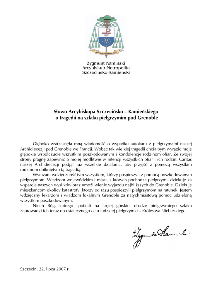 Zygmunt Kamiński Arcybiskup Metropolita Szczecińsko-Kamieński Słowo Arcybiskupa Szczecińsko – Kamieńskiego o tragedii na szlaku pielgrzymim pod Grenoble Głęboko wstrząsnęła mną wiadomość o wypadku autokaru z pielgrzymami naszej Archidiecezji pod Grenoble we Francji. Wobec tak wielkiej tragedii chciałbym wyrazić moje głębokie współczucie wszystkim poszkodowanym i kondolencje rodzinom ofiar. Ze swojej strony pragnę zapewnić o mojej modlitwie w intencji wszystkich ofiar i ich rodzin. Caritas naszej Archidiecezji podjął już wszelkie działania, aby przyjść z pomocą wszystkim rodzinom dotkniętym tą tragedią. Wyrażam wdzięczność tym wszystkim, którzy pospieszyli z pomocą poszkodowanym pielgrzymom. Władzom wojewódzkim i miast, z których pochodzą pielgrzymi, dziękuję za wsparcie naszych wysiłków oraz umożliwienie wyjazdu najbliższych do Grenoble. Dziękuję mieszkańcom okolicy katastrofy, którzy od razu pospieszyli pielgrzymom na ratunek. Jestem wdzięczny lekarzom i władzom lokalnym Grenoble za natychmiastową pomoc udzieloną wszystkim poszkodowanym. Niech Bóg, którego spotkali na krętej górskiej drodze pielgrzymiego szlaku zaprowadzi ich teraz do ostatecznego celu ludzkiej pielgrzymki – Królestwa Niebieskiego. Szczecin, 22. lipca 2007 r.
