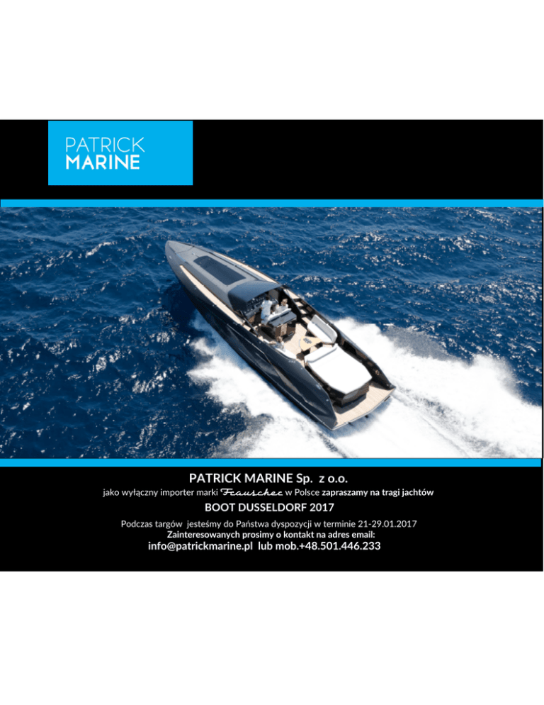 PATRICK MARINE Sp. z o.o. jako wyłączny importer marki F w Polsce zapraszamy na tragi jachtów BOOT DUSSELDORF 2017 Podczas targów jesteśmy do Państwa dyspozycji w terminie 21-29.01.2017C ZZainteresowanych prosimy o kontakt na adres email: [email protected] llub mob.+48.501.446.233ub tel kom. 501446233