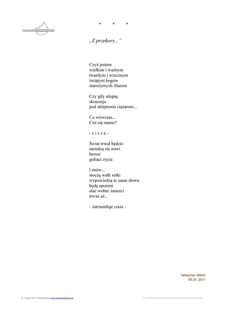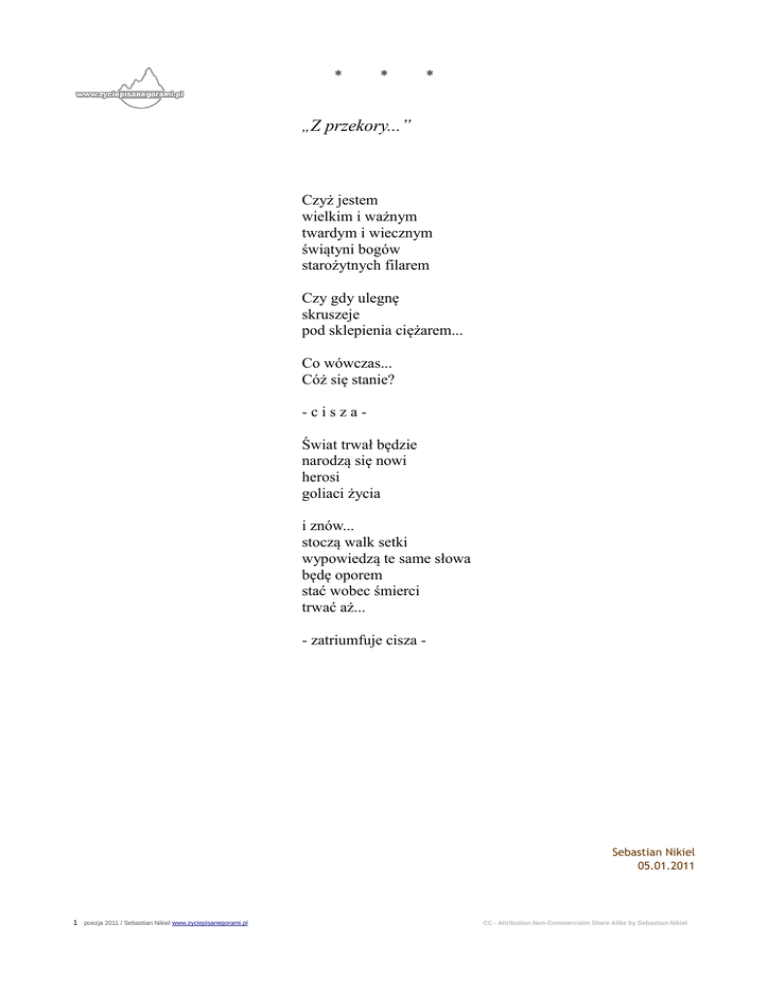 * * * „Z przekory...” Czyż jestem wielkim i ważnym twardym i wiecznym świątyni bogów starożytnych filarem Czy gdy ulegnę skruszeje pod sklepienia ciężarem... Co wówczas... Cóż się stanie? -ciszaŚwiat trwał będzie narodzą się nowi herosi goliaci życia i znów... stoczą walk setki wypowiedzą te same słowa będę oporem stać wobec śmierci trwać aż... - zatriumfuje cisza - Sebastian Nikiel 05.01.2011 1 poezja 2011 / Sebastian Nikiel www.zyciepisanegorami.pl CC - Attribution Non-Commercialm Share Alike by Sebastian Nikiel * * * Teraz już wiem Teraz rozumiem Góra Synaj, Horeb Tabor, Ararat i Golgota Tyś przecież Panie pierwszy je uczynił i pierwszy umiłował - Góry Teraz już wiem czemu i me serce wciąż pragnie i chce w nich przebywać W nich skruszony tak mały wobec potęgi turni nieba sięgających ścian na nowo wciąż miłość i sens odnajdywać. Sebastian Nikiel 03.01.2011 2 poezja 2011 / Sebastian Nikiel www.zyciepisanegorami.pl CC - Attribution Non-Commercialm Share Alike by Sebastian Nikiel * * * I ochroń mnie Panie przed potokiem pustych słów przed zbyt wielka gibkością języka sadzącego bliźnich swych przed myślą próżną i w sercu nienawiścią I uczyń mnie Panie głuchym na kłamstwa ślepym na pokusy mądrym na co dzień sprawiedliwym i pokornym abym mężnie zniósł to czego zmienić nie mogę i miał odwagę zmieniać co dzień złe na dobre. Sebastian Nikiel 07.01.2011 3 poezja 2011 / Sebastian Nikiel www.zyciepisanegorami.pl CC - Attribution Non-Commercialm Share Alike by Sebastian Nikiel * * * Minęło tyle lat zatracił się w nich zapach, obraz i smak Pozostały jedynie rozmyte w wartkim czasu strumieniu uczucia niejasne i... tęsknota Muszę jechać muszę w nie wrócić Bym mógł zapamiętać by znów mieć siły bez nich tutaj trwać - bez Tatr - Sebastian Nikiel 16.02.2011 4 poezja 2011 / Sebastian Nikiel www.zyciepisanegorami.pl CC - Attribution Non-Commercialm Share Alike by Sebastian Nikiel * * * I choćby nie wiem jak by nie było Ci ciężko I choćby wszystko co czynisz nie przynosiło zamierzonego efektu I choćby świat cały niebo, ziemia i piekło stanęły przeciw Tobie Ty nigdy nie ulegaj nie cofaj się w pół kroku Idź mężnie i pewnie na przód – wciąż naprzód I choćby ostatnią miała być ta droga pamiętaj... Może poddać się Twój organizm lecz nie Twoje serce i dusza. Sebastian Nikiel 24.01.2011 5 poezja 2011 / Sebastian Nikiel www.zyciepisanegorami.pl CC - Attribution Non-Commercialm Share Alike by Sebastian Nikiel * * * I lubię ten czas gdy choroba się cofa przegrywa i czmycha Czuję wówczas radość i ciepło znów świecącego w duszy słońca I lubię ten czas gdy zmywam z siebie cały ten pot i brud kurz z bitwy pola I... Nie lubię tej chwili gdy słońce tonie pod czarnymi i ciężkimi chmurami burzowymi Gdy ona triumfalnie znów nadchodzi nadciąga by objąć me ciało w swe posiadanie... Znów czekam na chwilę słońca Sebastian Nikiel 26.01.2011 6 poezja 2011 / Sebastian Nikiel www.zyciepisanegorami.pl CC - Attribution Non-Commercialm Share Alike by Sebastian Nikiel * * * I choćby nie wiem jak by nie było Ci ciężko I choćby wszystko co czynisz nie przynosiło zamierzonego efektu I choćby świat cały niebo, ziemia i piekło stanęły przeciw Tobie Ty nigdy nie ulegaj nie cofaj się w pół kroku Idź mężnie i pewnie na przód – wciąż naprzód I choćby ostatnią miała być ta droga pamiętaj... Może poddać się Twój organizm lecz nie Twoje serce i dusza. Sebastian Nikiel 24.01.2011 7 poezja 2011 / Sebastian Nikiel www.zyciepisanegorami.pl CC - Attribution Non-Commercialm Share Alike by Sebastian Nikiel * * * Minęło tyle lat zatracił się w nich zapach, obraz i smak Pozostały jedynie rozmyte w wartkim czasu strumieniu uczucia niejasne i... tęsknota Muszę jechać muszę w nie wrócić Bym mógł zapamiętać by znów mieć siły bez nich tutaj trwać - bez Tatr - Sebastian Nikiel 16.02.2011 8 poezja 2011 / Sebastian Nikiel www.zyciepisanegorami.pl CC - Attribution Non-Commercialm Share Alike by Sebastian Nikiel * * * Kiedyś był czas gdy strumień syty słów cały wartko płynął przelewając treść na papier Teraz jest czas gdy strumień syty piaskiem Pozostało w nim głęboko na dnie kropli słów jedynie parę Zgrzyta na wpół zaschnięta pióra stalówka o pożółkły papier Więc kreślę te słowa ostatnie Dopuść Panie! Pozwól mi w nie powrócić zasilić znów w wody życiodajne strumienie wyobraźni by życie nową myślą zakwitło by członki zmęczone walką bez wiary na nowo siły odzyskały Dopuść Bym mógł powrócić i się nimi nacieszyć pozwól powrócić w skalne baszty Tatr... Sebastian Nikiel 24.02.2011 9 poezja 2011 / Sebastian Nikiel www.zyciepisanegorami.pl CC - Attribution Non-Commercialm Share Alike by Sebastian Nikiel * * * Dawniej magowie wiedźmy wróżki Dziś cyberprzestrzeń współczesna kula kryształowa Odpowie na każde Twe pytanie wróżbę i kabałę postawi powie co dobre a co złe co leczy a co zabija jak jeść co i kiedy Elektroniczna papka gotowej codzienności spożywamy ją co dzień my wszyscy cybernauci Tylko do prawdziwego człowieczeństwa coraz nam dalej i coraz mniej po drodze... Sebastian Nikiel 28.02.2011 10 poezja 2011 / Sebastian Nikiel www.zyciepisanegorami.pl CC - Attribution Non-Commercialm Share Alike by Sebastian Nikiel * * * Czekam – na co? - Na szansę – której nie ma - Czy będzie... pragnę jej nie wiem... Wiem jedynie że w sercu stoję zwarty gotowy zmienić wszystko zrzucić kajdany okowy choroby – czekam - Sebastian Nikiel 24.05.2011 11 poezja 2011 / Sebastian Nikiel www.zyciepisanegorami.pl CC - Attribution Non-Commercialm Share Alike by Sebastian Nikiel * * * Oszacowali Zmierzyli Zważyli i... Do lamusa utopijnego marzenia o wolności z grzecznym uśmiechem odesłali Po raz kolejny - umarłem i nikt tego nie zauważył. Sebastian Nikiel 04.06.2011 12 poezja 2011 / 