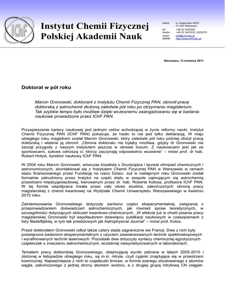 Instytut Chemii Fizycznej Polskiej Akademii Nauk adres: tel.: fax/tel.: email: WWW: ul. Kasprzaka 44/52 01-224 Warszawa +48 22 3432000 +48 22 3433333, 6325276 [email protected] http://www.ichf.edu.pl/ Warszawa, 13 kwietnia 2011 Doktorat w pół roku Marcin Gronowski, doktorant z Instytutu Chemii Fizycznej PAN, obronił pracę doktorską z astrochemii złożoną zaledwie pół roku po otrzymaniu magisterium. Tak szybkie tempo było możliwe dzięki wczesnemu zaangażowaniu się w badania naukowe prowadzone przez IChF PAN. Przyspieszanie kariery naukowej jest jednym celów wchodzącej w życie reformy nauki. Instytut Chemii Fizycznej PAN (IChF PAN) pokazuje, że hasło to nie jest tylko deklaracją. W maju ubiegłego roku magistrem został Marcin Gronowski, który zaledwie pół roku później złożył pracę doktorską i właśnie ją obronił. „Obrona doktoratu nie byłaby możliwa, gdyby dr Gronowski nie zaczął przygody z naszym instytutem jeszcze w okresie liceum. Z naukowcami jest jak ze sportowcami, sukces odnoszą ci, którzy zaczynają odpowiednio wcześnie” – mówi prof. dr hab. Robert Hołyst, dyrektor naukowy IChF PAN. W 2004 roku Marcin Gronowski, wówczas licealista z Grudziądza i laureat olimpiad chemicznych i astronomicznych, skontaktował się z Instytutem Chemii Fizycznej PAN w Warszawie w ramach stażu finansowanego przez Fundację na rzecz Dzieci. Już w następnym roku Gronowski został formalnie zatrudniony przez Instytut na część etatu w zespole zajmującym się astrochemią przestrzeni międzygwiazdowej, kierowanym przez dr. hab. Roberta Kołosa, profesora IChF PAN. W tej formie współpraca trwała przez cały okres studiów, zakończonych obroną pracy magisterskiej z chemii kwantowej na Wydziale Chemii Uniwersytetu Warszawskiego w kwietniu 2010 roku. Zainteresowania Gronowskiego dotyczyły zarówno części eksperymentalnej, związanej z przeprowadzaniem doświadczeń astrochemicznych, jak również spraw teoretycznych, w szczególności dotyczących obliczeń kwantowo-chemicznych. „W efekcie już w chwili pisania pracy magisterskiej Gronowski był współautorem dziewięciu publikacji naukowych w czasopismach z listy filadelfijskiej, w tym tak prestiżowych jak Astrophysical Journal” – mówi prof. Kołos. Przed doktoratem Gronowski odbył także cztery staże zagraniczne we Francji. Dwa z nich były poświęcone badaniom eksperymentalnym z użyciem zaawansowanych technik spektroskopowych i wyrafinowanych technik laserowych. Pozostałe dwa dotyczyły syntezy chemicznej egzotycznych cząsteczek o znaczeniu astrochemicznym, wcześniej niesyntetyzowanych w laboratoriach. Tematem pracy doktorskiej Gronowskiego, obejmującej wyniki zebrane w latach 2005-2010 i złożonej w listopadzie ubiegłego roku, są m.in. nitryle, czyli cyjanki znajdujące się w przestrzeni kosmicznej. Najważniejsze z nich to cząsteczki liniowe, w formie szeregu zbudowanego z atomów węgla, zakończonego z jednej strony atomem wodoru, a z drugiej grupą nitrylową CN (węgiel- azot). „Cząsteczki tego typu oddziałują z promieniowaniem mikrofalowym. Można je badać metodami radioastronomicznymi, poznając w ten sposób zjawiska chemiczne zachodzące w przestrzeni międzygwiazdowej” – mówi dr Gronowski. Nitryle są składnikiem lodów kometarnych, występują także na Tytanie, księżycu Saturna, gdzie ich polimery odpowiadają za charakterystyczne, pomarańczowe zabarwienie atmosfery. Cząsteczki te mają również znaczenie prebiotyczne. Gdy znajdą się w odpowiednim środowisku, mogą prowadzić do powstania bardziej złożonych cząsteczek organicznych, takich jak puryny czy pirymidyny, których struktura jest zbliżona do nukleotydów tworzących DNA. W pracy doktorskiej Gronowski szczególnie interesował się cząsteczkami pokrewnymi do cyjanopoliacetylenów, powstającymi w wyniku innego uporządkowania tego samego zestawu atomów. „Badane przeze mnie cząsteczki mogą mieć odwróconą grupę nitrylową (NC zamiast CN), a znajdujący się na końcu łańcucha atomów wodór może przemigrować w inne miejsce” – wyjaśnia Gronowski. Sposób oddziaływania tych nietrwałych cząsteczek z promieniowaniem wciąż jest stosunkowo słabo poznany. Gronowski zaprezentował badania teoretyczne, za pomocą których można przewidzieć oddziaływanie opisanych cząsteczek zarówno z promieniowaniem mikrofalowym, podczerwonym, widzialnym, jak i ultrafioletowym. Dodatkowo przedstawił też powiązane tematycznie wyniki z eksperymentów laboratoryjnych, w których egzotyczne, nietrwałe cząsteczki astrochemiczne były w warunkach kriogenicznych izolowane od siebie atomami gazu szlachetnego. Izolacja zapewniała cząsteczkom trwałość pozwalającą na pomiary, zwłaszcza analizę widm w podczerwieni. „Przykład dr. Gronowskiego pokazuje, że przygodę z nauką warto rozpoczynać tak wcześnie, jak to tylko możliwe. Nie ma się czego bać. Dobre instytucje naukowe są naprawdę zainteresowane młodymi, zdolnymi ludźmi” – podsumowuje prof. Hołyst. Instytut Chemii Fizycznej Polskiej Akademii Nauk (http://www.ichf.edu.pl/) został powołany w 1955 roku jako jeden z pierwszych instytutów chemicznych PAN. Profil naukowy Instytutu jest silnie powiązany z najnowszymi światowymi kierunkami rozwoju chemii fizycznej i fizyki chemicznej. Badania naukowe są prowadzone w 9 zakładach naukowych. Działający w ramach Instytutu Zakład Doświadczalny CHEMIPAN wdraża, produkuje i komercjalizuje specjalistyczne związki chemiczne do zastosowań m.in. w rolnictwie i farmacji. Instytut publikuje około 200 oryginalnych prac badawczych rocznie. KONTAKTY DO NAUKOWCÓW: prof. dr hab. Robert Hołyst Dyrektor naukowy Instytutu Chemii Fizycznej Polskiej Akademii Nauk tel. +48 22 3433123 email: [email protected] dr Marcin Gronowski Instytut Chemii Fizycznej Polskiej Akademii Nauk tel. +48 22 3433214 email: [email protected] POWIĄZANE STRONY WWW: http://www.ichf.edu.pl/ Str