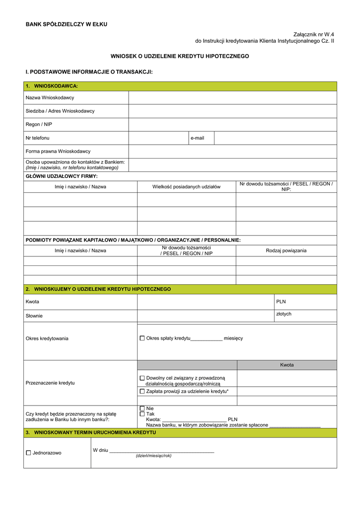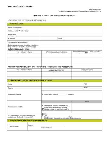 BANK SPÓŁDZIELCZY W EŁKU Załącznik nr W.4 do Instrukcji kredytowania Klienta Instytucjonalnego Cz. II WNIOSEK O UDZIELENIE KREDYTU HIPOTECZNEGO I. PODSTAWOWE INFORMACJIE O TRANSAKCJI: 1. WNIOSKODAWCA: Nazwa Wnioskodawcy Siedziba / Adres Wnioskodawcy Regon / NIP Nr telefonu e-mail Forma prawna Wnioskodawcy Osoba upoważniona do kontaktów z Bankiem: (Imię i nazwisko, nr telefonu kontaktowego) GŁÓWNI UDZIAŁOWCY FIRMY: Imię i nazwisko / Nazwa Wielkość posiadanych udziałów Nr dowodu tożsamości / PESEL / REGON / NIP: PODMIOTY POWIĄZANE KAPITAŁOWO / MAJĄTKOWO / ORGANIZACYJNIE / PERSONALNIE: Nr dowodu tożsamości / PESEL / REGON / NIP Imię i nazwisko / Nazwa Rodzaj powiązania 2. WNIOSKUJEMY O UDZIELENIE KREDYTU HIPOTECZNEGO Kwota PLN Słownie złotych Okres spłaty kredytu____________ miesięcy Okres kredytowania Kwota Dowolny cel związany z prowadzoną działalnością gospodarczą/rolniczą Przeznaczenie kredytu Zapłata prowizji za udzielenie kredytu* Czy kredyt będzie przeznaczony na spłatę zadłużenia w Banku lub innym banku?: Nie Tak Kwota: ________________________ PLN Nazwa banku, w którym zobowiązanie zostanie spłacone ___________________ 3. WNIOSKOWANY TERMIN URUCHOMIENIA KREDYTU Jednorazowo W dniu _______________________________________ (dzień/miesiąc/rok) z W dniu _____________________________________ (dzień/miesiąc/rok) Do wysokości ___________________________ PLN W transzach W dniu _____________________________________ (dzień/miesiąc/rok) Do wysokości ___________________________ PLN 4. FORMA I TERMINY SPŁATY KAPITAŁU: KH w formie kredytu w rachunku kredytowym miesięcznie Dnia ___________________________________ każdego miesiąca 5. FORMA I TERMINY SPŁATY ODSETEK: KH w formie kredytu w rachunku kredytowym miesięcznie Dnia ___________________________________ każdego miesiąca 6. ZABEZPIECZENIA: Właściciel przedmiotu zabezpieczenia Rodzaj zabezpieczenia Wartość zabezpieczenia Oszacowanie wartości na podstawie 1. Hipoteka na nieruchomości 2. Cesja z praw polisy ubezpieczenia od ognia i innych zdarzeń losowych* 3. Pełnomocnictwo do rachunku prowadzonym w Banku 4. Weksel własny in blanco wraz z deklaracją wekslową II. INFORMACJE O WNIOSKODAWCY 1. INFORMACJE O PROWADZONEJ DZIAŁALNOŚCI GOSPODARCZEJ: Okres prowadzenia gospodarcze/rolniczej: /w miesiącach/ działalności krócej niż 24 miesięcy powyżej 24 miesięcy Podstawowy przedmiot działalności: 2. INFORMACJE FINANSOWE: _______________________________________________________________________ (nazwa Banku) Oświadczam że posiadam rachunek bieżący w Bankach _______________________________________________________________________ (nazwa Banku) _______________________________________________________________________ (nazwa Banku) Forma prowadzonej księgowości: PEŁNA KSIĘGOWOŚĆ KSIĘGA PRZYCHODÓW I ROZCHODÓW RYCZAŁT OD PRZYCHODÓW EWIDENCJONOWANYCH KARTA PODATKOWA INNE Dane dotyczące roku poprzedzającego ostatni rok fiskalny Dane dotyczące ostatniego roku fiskalnego Przychody ze sprzedaży (w złotych) Kwota podatku: Amortyzacja: Zysk / strata netto: ZADŁUŻENIE kredytowe Aktualne zadłużenie kredytowe w Banku Spółdzielczym w Ełku PLN Strona 2 z 5 Aktualne zadłużenie w Banku Spółdzielczym w Ełku wraz z podmiotami powiązanymi PLN Aktualne zadłużenie kredytowe w innych bankach: Bank kredytujący Kwota do spłaty Rodzaj kredytu Okres kredytowania Zabezpieczenie Aktualne zadłużenie kredytowe w innych bankach wraz z podmiotami powiązanymi: Inne zobowiązania: Kwota rocznej spłaty zobowiązań długoterminowych: Inne istotne informacje III. Oświadczenia Wnioskodawcy 1) Oświadczam/y, że posiadam/y nie posiadam/y* zaległości wobec Zakładu Ubezpieczeń Społecznych i Urzędu Skarbowego, Kasy Rolniczego Ubezpieczenia Społecznego i Urzędu Gminy objętych / nie objętych ugodą*. 2) Oświadczam/y, że posiadamy/ nie posiadamy* zaległości wobec innych banków lub towarzystw leasingowych. 3) Oświadczam/y, że wobec nas toczą się/ nie toczą się* lub grożą / nie grożą* nam postępowania sądowe, administracyjne i inne mogące mieć wpływ na prowadzoną działalność lub zdolność do spłaty zaciągniętych zobowiązań. 4) Oświadczam/y, że została/ nie została* ogłoszona upadłość lub został / nie został* rozpoczęty proces likwidacji lub naprawczego lub zawieszenia działalności firmy. 5) Oświadczamy, że w okresie ostatnich 12 m-cy zostały / nie zostały* wystawione lub wygasły / nie wygasły* przekraczającej 1.000 PLN. postępowania tytuły egzekucyjne w kwocie 6) Oświadczam, że pozostaję / nie pozostaję* we wspólności majątkowej ze współmałżonkiem/współmałżonką** 7) Oświadczam/y, że jesteśmy/ nie jesteśmy* udziałowcami Banku Spółdzielczego w Ełku 8) Oświadczam/y, że następujące podmioty lub osoby powiązane, organizacyjnie, personalnie są / nie są* udziałowcami Banku Spółdzielczego w Ełku lub osobami zajmującymi w Banku kierownicze stanowiska lub funkcje w radzie nadzorczej lub w zarządzie Banku. 9) Oświadczam/y pod rygorem odpowiedzialności karnej przewidzianej w art. 297 § 1 Kodeksu karnego, że informacje podane w tym wniosku są zgodne ze stanem faktycznym. IV. Zgody Wnioskodawcy § 1. (stosuje się w przypadku Klientów nie będących os. fiz.)* 1. Oświadczam, że dobrowolnie wyrażam zgodę/nie wyrażam zgody* na przesyłanie informacji handlowej za pomocą środków komunikacji elektronicznej w rozumieniu ustawy o świadczeniu usług drogą elektroniczną z dnia 18 lipca 2002 r. (tj. Dz. U. 2014r. poz. 1422) w tym celu wskazuje adres poczty elektronicznej:……………………..………… 2. Oświadczam, że dobrowolnie wyrażam zgodę/ nie wyrażam zgody* na wykorzystanie podanych we wniosku kredytowym danych teleadresowych w celu marketingu bezpośredniego Banku przy użyciu telekomunikacyjnych urządzeń końcowych (telefon, sms, Internet) oraz automatycznych systemów wywo