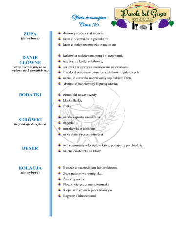 Oferta komunijna Cena 95 ZUPA (do wyboru) domowy rosół z makaronem krem z borowików z grzankami krem z zielonego groszku z melonem DANIE GŁÓWNE (trzy rodzaje mięsa do wyboru po 2 kawałki/ os.) karkówka nadziewana porą i pieczarkami, tradycyjny kotlet schabowy, sakiewka wieprzowa nadziewana pieczarkami, fileciki drobiowy w panierce z płatków migdałowych udziec z kurczaka nadziewany szpinakiem i fetą, dramstiki nadziewany kapustą włoską DODATKI ziemniaki nowe z wody kluski śląskie frytki SURÓWKI (trzy rodzaje do wyboru) młoda kapusta zasmażana mizeria marchewka z jabłkiem mix sałata z sosem winegret DESER KOLACJA (do wyboru) tort komunijny w kształcie księgi podajemy po obiedzie kruche ciasteczka na klosz Barszcz z pasztecikiem lub krokietem, Zupa gulaszowa węgierska, Żurek żywiecki Flaczki cielęce z nutą pietruszki Klopsiki z kremem pieczarkowym Bogracz z kluseczkami ZIMNA PŁYTA Do wyboru dwie pieczenie: schab po sztygarsku, rolada z kurczaka, schab nadziewany żurawiną i świeżym chrzanem, rolada z kurczaka z pomidorami suszonymi, pierś z indyka nadziewana morelami, karkówka nadziewana musem drobiowym, rolada drobiowa z szpinakiem, pasztet po staropolsku kompozycja wędlin deska serów Do wyboru dwa rodzaje galantyny: galantyna w galarecie, ruloniki z szynki z chrzanem, ozorki w galarecie, karczek peklowany w galarecie, galaretki wieprzowe Do wyboru dwa rodzaje sałatek: tradycyjna sałatka jarzynowa, sałatka z selera konserwowego z szynką, sałatka grecka z serem feta, sałatka makaronowa z suszonymi pomidorami, sałatka z selera naciowego z ananasem i kurczakiem wędzonym, sałatka z pierożków tortelini z kukurydzą i ogórkiem z nutą sosu czosnkowego, sałatka wiejska, sałatka ziemniaczana pieczywo mieszane NAPOJE Kawa/ herbata Soki Napoje: coca- cola. sprite, fanta Woda mineralna (bez ograniczeń)