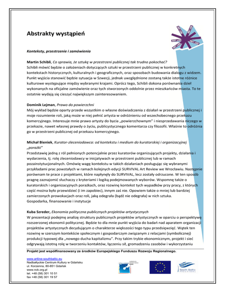 Abstrakty wystąpień Konteksty, przestrzenie i zamówienia Martin Schibli, Co sprawia, że sztukę w przestrzeni publicznej tak trudno pokochać? Schibli mówić będzie o założeniach dotyczących sztuki w przestrzeni publicznej w konkretnych kontekstach historycznych, kulturalnych i geograficznych, oraz sposobach budowania dialogu z widzem. Punkt wyjścia stanowić będzie sytuacja w Szwecji, jednak uwzględnione zostaną także istotne różnice kulturowe występujące między wybranymi krajami. Oprócz tego, Schibli dokona porównania dzieł wykonanych na oficjalne zamówienie oraz tych stworzonych oddolnie przez mieszkańców miasta. To te ostatnie wydają się cieszyć największym zainteresowaniem. Dominik Lejman, Prawo do powierzchni Mój wykład będzie oparty przede wszystkim o własne doświadczenia z działań w przestrzeni publicznej i moje rozumienie roli, jaką może w niej pełnić artysta w odróżnieniu od wszechobecnego przekazu komercyjnego. Interesuje mnie prawo artysty do bycia „powierzchownym” i niesprzedawania niczego w przekazie, nawet własnej prawdy o życiu, publicystycznego komentarza czy filozofii. Właśnie to odróżnia go w przestrzeni publicznej od przekazu komercyjnego. Michał Bieniek, Kurator-zleceniodawca: od kontekstu i medium do kuratorskiej i organizacyjnej „porażki” Przedstawię jedną z ról pełnionych potencjalnie przez kuratorów organizujących projekty, działania i wydarzenia, tj. rolę zleceniodawcy w inicjatywach w przestrzeni publicznej lub w ramach pozainstytucjonalnych. Omówię wagę kontekstu w takich działaniach posługując się wybranymi przykładami prac powstałych w ramach kolejnych edycji SURVIVAL Art Review we Wrocławiu. Następnie porównam te prace z projektami, które napłynęły do SURVIVAL, lecz zostały odrzucone. W ten sposób pragnę zaznajomić słuchaczy z kryteriami i logiką podejmowanych wyborów. Wspomnę także o kuratorskich i organizacyjnych porażkach, oraz rozwinę kontekst tych wypadków przy pracy, z których część można było przewidzieć (i im zapobiec), innym zaś nie. Opowiem także o mniej lub bardziej zamierzonych prowokacjach oraz roli, jaką odegrała (bądź nie odegrała) w nich sztuka. Gospodarka, finansowanie i instytucje Kuba Szreder, Ekonomia polityczna publicznych projektów artystycznych W prezentacji podejmę analizę struktury publicznych projektów artystycznych w oparciu o perspektywę rozszerzonej ekonomii politycznej. Będzie to dla mnie punkt wyjścia do badań nad aparatem organizacji projektów artystycznych decydującym o charakterze większości tego typu przedsięwzięć. Wątek ten rozwinę w szerszym kontekście społecznym i gospodarczym związanym z relacjami (symbolicznej) produkcji typowej dla „nowego ducha kapitalizmu”. Przy takim trybie ekonomicznym, projekt i sieć odgrywają istotną rolę w tworzeniu kontaktów, łączeniu sił, gromadzeniu zasobów i wykorzystaniu Projekt jest współfinansowany ze środków Europejskiego Funduszu Rozwoju Regionalnego. www.artline-southbaltic.eu Nadbałtyckie Centrum Kultury w Gdańsku ul. Korzenna, 80-851 Gdańsk www.nck.org.pl tel. +48 (58) 301 10 51 fax +48 (58) 301 19 57 istniejących możliwości. Zamierzam poddać krytyce relacje między globalnym obiegiem sztuki, instytucjami zamawiającymi projekty artystyczne, zapraszanymi do nich artystami, lokalnymi scenami artystycznymi, najbardziej zaangażowaną publicznością i innymi grupami odbiorców. Oprócz tego przyjrzę się uważnie podziałowi pracy (symbolicznej, technicznej, administracyjnej, emocjonalnej), prześledzę przepływ zasobów i hierarchie decydujące o dokonywanych zamówieniach. Skoncentruję się zwłaszcza na rozdziale między mobilnymi i niemobilnymi (ludźmi, społecznościami, wytwórcami) jako na istocie powielania niesprawiedliwości społecznej w sieciach produkcji artystycznej. Poświęcę także szczególną uwagę osobliwościom, ryzyku i wyzwaniom towarzyszącym zamówieniom dotyczącym dzieł w przestrzeni publicznej (niemal) na peryferiach światowego kapitalizmu. Michaela Crimmin, Sztuka dla wszystkich? Obserwacja, partycypacja, współdziałanie i sprzeciw we współczesnej praktyce artystycznej Hasło „sztuka dla wszystkich” stało się okrzykiem bojowym na całym świecie. Na przykład slogan Arts Council Engand brzmi „Great Art for Everyone” [„Dobra sztuka dla wszystkich”]. Na pierwszy rzut oka jest to godna pochwały misja głównego dysponenta funduszy rządu brytyjskiego przeznaczonych na sztukę, jednak jakie naprawdę ma ona znaczenie w świetle kulturowej różnorodności oraz ogromnego zróżnicowania ekonomicznego, edukacyjnego, itp. między ludźmi przemierzającymi obszar, który nazywamy przestrzenia publiczną? W oparciu o kilka przykładów prestiżowych realizacji – takich jak tzw. czwarty filar na Trafalgar Square w Londynie; projekt Jeremy’ego Dellera It Is What It Is, Conversations about Iraq; praca Joanny Rajkowskiej na zamówienie brytyjskiego miasta Peterborough; oraz festiwal „48 Degrees Celcius” w New Delhi – prezentacja podejmie wątek praktyk artystycznych bazujących na różnorodnych sposobach zwiększania poziomu uczestnictwa w działaniach w przestrzeni publicznej. Każda z wymienionych inicjatyw korzystała ze wsparcia instytucjonalnego. Czy artyści mogli swobodnie podążać własną drogą stymulując dialog i zaangażowanie? Do jakiego stopnia doświadczenie to okazało się istotne dla „publiczności”? Sukces, a także jakikolwiek kompromis dają się oceniać tylko w konkretnych przypadkach, jednak zebranie odmiennych przykładów ma tu na celu zobrazowanie szeregu wartości, jakie sztuka w przestrzeni publicznej wnosi, jeśli nawet nie w życie wszystkich, to przynajmniej konkretnych odbiorców. Dialog, konflikt, kontekst miejsca i rola artysty Julia Draganović, Uwagi o sztuce w przestrzeni publicznej w kontekście czasu Biorąc za punkt wyjścia własne d