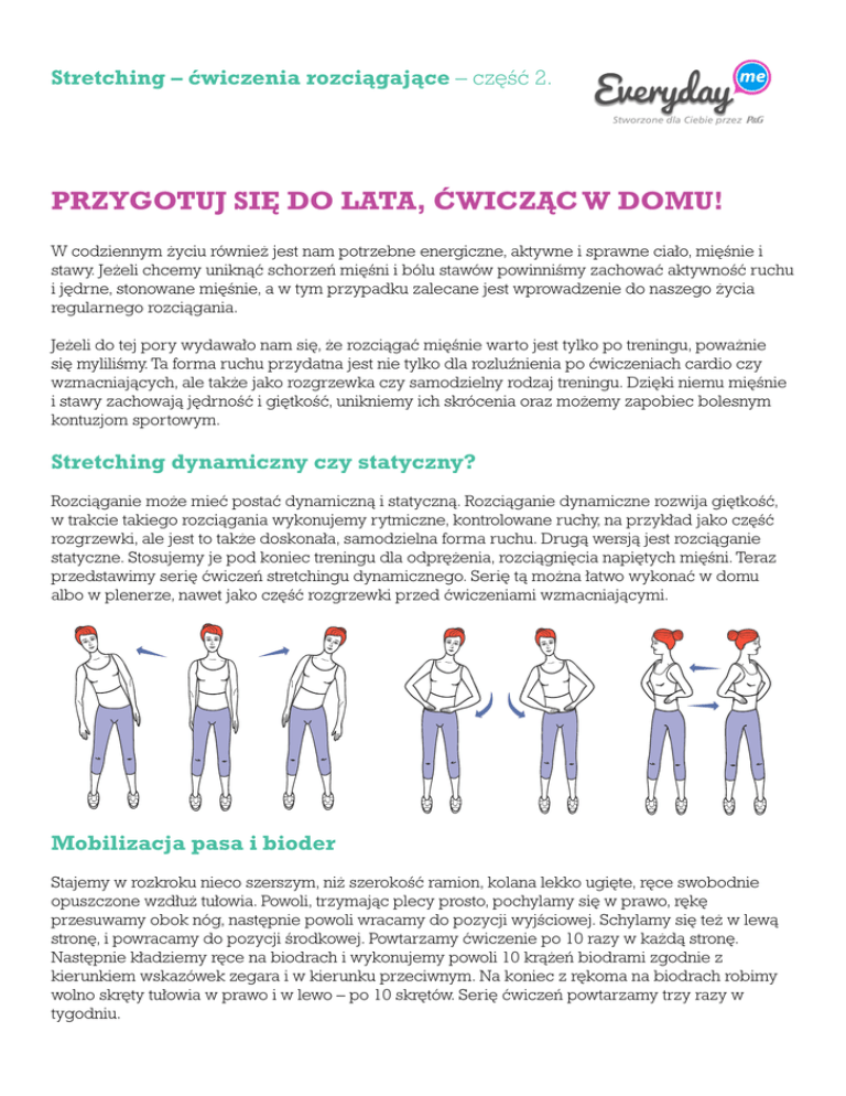 me Stretching – ćwiczenia rozciągające – część 2. Stworzone dla Ciebie przez PRZYGOTUJ SIĘ DO LATA, ĆWICZĄC W DOMU! W codziennym życiu również jest nam potrzebne energiczne, aktywne i sprawne ciało, mięśnie i stawy. Jeżeli chcemy uniknąć schorzeń mięśni i bólu stawów powinniśmy zachować aktywność ruchu i jędrne, stonowane mięśnie, a w tym przypadku zalecane jest wprowadzenie do naszego życia regularnego rozciągania. Jeżeli do tej pory wydawało nam się, że rozciągać mięśnie warto jest tylko po treningu, poważnie się myliliśmy. Ta forma ruchu przydatna jest nie tylko dla rozluźnienia po ćwiczeniach cardio czy wzmacniających, ale także jako rozgrzewka czy samodzielny rodzaj treningu. Dzięki niemu mięśnie i stawy zachowają jędrność i giętkość, unikniemy ich skrócenia oraz możemy zapobiec bolesnym kontuzjom sportowym. Stretching dynamiczny czy statyczny? Rozciąganie może mieć postać dynamiczną i statyczną. Rozciąganie dynamiczne rozwija giętkość, w trakcie takiego rozciągania wykonujemy rytmiczne, kontrolowane ruchy, na przykład jako część rozgrzewki, ale jest to także doskonała, samodzielna forma ruchu. Drugą wersją jest rozciąganie statyczne. Stosujemy je pod koniec treningu dla odprężenia, rozciągnięcia napiętych mięśni. Teraz przedstawimy serię ćwiczeń stretchingu dynamicznego. Serię tą można łatwo wykonać w domu albo w plenerze, nawet jako część rozgrzewki przed ćwiczeniami wzmacniającymi. Mobilizacja pasa i bioder Stajemy w rozkroku nieco szerszym, niż szerokość ramion, kolana lekko ugięte, ręce swobodnie opuszczone wzdłuż tułowia. Powoli, trzymając plecy prosto, pochylamy się w prawo, rękę przesuwamy obok nóg, następnie powoli wracamy do pozycji wyjściowej. Schylamy się też w lewą stronę, i powracamy do pozycji środkowej. Powtarzamy ćwiczenie po 10 razy w każdą stronę. Następnie kładziemy ręce na biodrach i wykonujemy powoli 10 krążeń biodrami zgodnie z kierunkiem wskazówek zegara i w kierunku przeciwnym. Na koniec z rękoma na biodrach robimy wolno skręty tułowia w prawo i w lewo – po 10 skrętów. Serię ćwiczeń powtarzamy trzy razy w tygodniu.