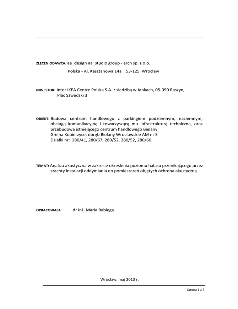 ZLECENIODAWCA: aa_design aa_studio group - arch sp. z o.o. Polska - Al. Kasztanowa 14a 53-125 Wrocław INWESTOR: Inter IKEA Centre Polska S.A. z siedzibą w Jankach, 05-090 Raszyn, Plac Szwedzki 3 OBIEKT: Budowa centrum handlowego z parkingiem podziemnym, naziemnym, obsługą komunikacyjną i towarzyszącą mu infrastrukturą techniczną, oraz przebudowa istniejącego centrum handlowego Bielany Gmina Kobierzyce, obręb Bielany Wrocławskie AM nr 5 Działki nr: 280/41, 280/67, 280/52, 280/52, 280/66. TEMAT: Analiza akustyczna w zakresie określenia poziomu hałasu przenikającego przez szachty instalacji oddymiania do pomieszczeń objętych ochrona akustyczną OPRACOWAŁA: dr inż. Maria Rabiega Wrocław, maj 2013 r. Strona 1 z 7 Poziom hałasu przenikającego przez szachty instalacji oddymiania do pomieszczeń chronionych – IKEA Bielany Spis treści 1. CEL I ZAKRES OPRACOWANIA...................................................................................................................... 3 2. CHARAKTERYSTYKA OBIEKTU ...................................................................................................................... 3 3. DOPUSZCZALNY POZIOM HAŁASU W POMIESZCZENIACH ............................................................................ 4 4. OSZACOWANIE IZOLACYJNOŚCI AKUSTYCZNEJ ŚCIAN SZACHTÓW ............................................................... 4 5. OBLICZENIE POZIOMU CIŚNIENIA AKUSTYCZNEGO W SZACHTACH WENTYLACYJNYCH ................................. 5 6. OBLICZENIE POZIOMU HAŁASU W POMIESZCZENIACH SKLEPOWYCH PRZY SZACHTACH WENTYLACYJNYCH. 6 7. OSZACOWANIE POZIOMU MOCY AKUSTYCZNEJ SZUMÓW W SZACHTACH POWSTAJĄCYCH NA SKUTEK PRZEPŁYWU POWIETRZA. ........................................................................................................................... 7 8. PODSUMOWANIE ....................................................................................................................................... 7 9. ANEKS A ..................................................................................................................................................... 8 Strona 2 z 7 Poziom hałasu przenikającego przez szachty instalacji oddymiania do pomieszczeń chronionych – IKEA Bielany CEL I ZAKRES OPRACOWANIA 1. Niniejsze opracowanie dotyczy określenia poziomu hałasu przenikającego do pomieszczeń sklepowych poprzez ściany szachtów wentylacji oddymiającej. Zakres opracowania: • • • • • określenie wymagań w zakresie poziomu dźwięków zakłócających w pomieszczeniach sklepowych oszacowanie izolacyjności akustycznej ścian szachtów obliczenie poziomu ciśnienia akustycznego w szachtach wentylacyjnych obliczenie poziomu hałasu w pomieszczeniach sklepowych przy szachtach wentylacyjnych. oszacowanie poziomu mocy akustycznej szumów w szachtach powstających na skutek przepływu powietrza. 2. CHARAKTERYSTYKA OBIEKTU Projektowane centrum handlowo-usługowe zlokalizowane będzie przy ulicy Czekoladowej na Bielanach Wrocławskich. Inwestycja obejmuje działki położone w obrębie geodezyjnym am NR 5, o numerach ewidencyjnych 280/41, 280/67, 280/52, 280/52, 280/66. Teren inwestycji stanowi obecnie funkcjonujące Centrum Handlowe Bielany, które składa się z trzech funkcjonujących obiektów: Budynku galerii handlowej „Tesco”, połączonego z nią budynku sklepu Ikea i stojącego odrębnie budynku marketu budowlanego OBI. Budynki zlokalizowane są w północnej części terenu inwestycji, część południową zajmuje rozległy terenowy parking dla klientów. Projektowany obiekt jest rozbudową istniejącej galerii handlowej w miejscu istniejącego sklepu IKEA. Między ulicą Czekoladową a centrum handlowym znajduje się parking zewnętrzny. Zostanie on poddany modernizacji i przebudowie. Po stronie północnej w odległości około 70 m od budynków Centrum Handlowego przebiega autostrada A4. Lokalizację przewidzianego do rozbudowy obiektu i autostrady A4 pokazano na mapie 1. Budynek posiada zasadniczo dwie kondygnacje nadziemne, za wyjątkiem segmentu w którym zlokalizowane są kina – jako trzecia kondygnacja, oraz jedną kondygnację podziemną stanowiącą garaż. Kina zaprojektowano w północno-zachodnim narożniku nad częścią drugiej kondygnacji jako multipleks składający się z 8 sal i foyer dla 1580 widzów. Na kondygnacji podziemnej przewidziano parking, którego obrys w części południowej znacznie wykracza poza obrys części naziemnej. Na tym poziomie przewidziano również pomieszczenia techniczne. Na podstawie analizy materiałów otrzymanych od projektantów instalacji wentylacji oraz analizy projektu architektury, stwierdzono że: • W analizowanym obiekcie będzie pracowało 20 wentylatorów oddymiających zlokalizowanych na dachu i cztery w garażu podziemnym, przy czym tylko 10 będzie działało w trybie bytowym. • Szacht wentylatorów stojących w garażu znajduje się poza bryłą budynku ze sklepami. • Sklepy zlokalizowane są na poziomie L01 i przylegają do szachtów, do których doprowadzone są wentylatory: NW3a i NW3b NW4a i NW4b NW6a i NW6b Strona 3 z 7 Poziom hałasu przenikającego przez szachty instalacji oddymiania do pomieszczeń chronionych – IKEA Bielany 3. DOPUSZCZALNY POZIOM HAŁASU W POMIESZCZENIACH Na wypadkowy poziom hałasu wewnątrz pomieszczeń w budynku ma wpływ hałas zewnętrzny przechodzący przez ściany i okna, hałas wewnętrzny od instalacji i urządzeń technicznych oraz hałas z lokali usługowych. W normie PN-B-02151-02:1987 Akustyka budowlana: Ochrona przed hałasem pomieszczeń w budynkach. Dopuszczalne wartości poziomu dźwięku w pomieszczeniach, określono wartości dopuszczalne równoważnego poziomu dźwięku A przenikającego do pomieszczenia łącznie od wszystkich źródeł hałasu usytuowanych poza tym pomieszczeniem oraz od wyposażenia technicznego budynku oraz innych urządzeń w budynku i poza budynkiem. Dopuszczal