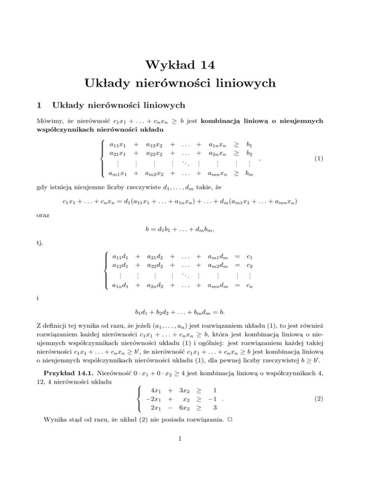 Wyklad 14 Uklady nierówności liniowych 1 Uklady nierówności liniowych Mówimy, że nierówność c1 x1 + . . . + cn xn wspólczynnikach nierówności ukladu a11 x1 + a12 x2 a21 x1 + a22 x2 .. .. .. . . . a x + a x m1 1 m2 2 ≥ b jest kombinacja, liniowa, o nieujemnych + . . . + a1n xn ≥ b1 + . . . + a2n xn ≥ b2 .. . . . .. .. .. , . .. . . . . + . . . + amn xn ≥ bm (1) gdy istnieja, nieujemne liczby rzeczywiste d1 , . . . , dm takie, że c1 x1 + . . . + cn xn = d1 (a11 x1 + . . . + a1n xn ) + . . . + dm (am1 x1 + . . . + amn xn ) oraz b = d1 b1 + . . . + dm bm , tj. a11 d1 a12 d1 .. . a d 1n 1 + a21 d2 + . . . + am1 dm = c1 + a22 d2 + . . . + am2 dm = c2 .. .. .. . . . .. .. .. . .. . . . . . . + a2n d2 + . . . + amn dm = cn i b1 d1 + b2 d2 + . . . + bm dm = b. Z definicji tej wynika od razu, że jeżeli (a1 , . . . , an ) jest rozwiazaniem ukladu (1), to jest również , rozwiazaniem każdej nierówności c1 x1 + . . . + cn xn ≥ b, która jest kombinacja, liniowa, o nie, ujemnych wspólczynnikach nierówności ukladu (1) i ogólniej: jest rozwiazaniem każdej takiej , 0 nierówności c1 x1 + . . . + cn xn ≥ b , że nierówność c1 x1 + . . . + cn xn ≥ b jest kombinacja, liniowa, o nieujemnych wspólczynnikach nierówności ukladu (1), dla pewnej liczby rzeczywistej b ≥ b0 . Przyklad 14.1. Nierówność 0 · x1 + 0 · x2 ≥ 4 jest kombinacja, liniowa, o wspólczynnikach 4, 12, 4 nierówności ukladu 1 4x1 + 3x2 ≥ (2) −2x1 + x2 ≥ −1 . 2x − 6x ≥ 3 1 2 Wynika stad 2 , od razu, że uklad (2) nie posiada rozwiazania. , 1 Twierdzenie 14.2. Niech a11 x1 a21 x1 .. . a x m1 1 + + .. . a12 x2 a22 x2 .. . + am2 x2 + . . . + a1n xn ≥ b1 + . . . + a2n xn ≥ b2 .. . . . .. .. .. . .. . . . . + . . . + amn xn ≥ bm (3) bedzie rozwiazalnym (tzn. posiadajacym rozwiazanie) ukladem nierówności i niech , , , , c1 x1 + . . . + cn xn ≥ b0 (4) bedzie dowolna, nierównościa. ukladu (3) jest rozwiazaniem nierówności (4) , Każde rozwiazanie , , , wtedy, i tylko wtedy, gdy istnieje taka liczba rzeczywista b ≥ b0 , że nierówność c1 x1 + . . . + cn xn ≥ b (5) jest kombinacja, liniowa, o nieujemnych wspólczynnikach nierówności ukladu (3). Przyklad 14.3. Korzystajac acy uklad równań , z twierdzenia 14.2 uzasadnimy, że nastepuj , , ( x1 + 3x2 − 5x3 = 2 (6) x1 − 4x2 − 7x3 = 3 nie posiada rozwiazania nieujemnego. W tym celu zalóżmy, że nasz uklad posiada rozwiazanie , , nieujemne (a1 , a2 , a3 ) (tzn. takie, że a1 ≥ 0, a2 ≥ 0 i a3 ≥ 0). Ponieważ uklad nierówności y1 + y2 ≥ 0 (7) 3y1 − 4y2 ≥ 0 −5y − 7y ≥ 0 1 2 jest rozwiazalny (np. y1 = y2 = y3 = 0) oraz nierówność , 2y1 + 3y2 ≥ 0 (8) jest kombinacja, liniowa, nierówności ukladu (7) o wspólczynnikach nieujemnych a1 , a2 , a3 , wiec , na mocy twierdzenia 14.2, każde rozwiaza-nie uk ladu (7) jest rozwi azaniem nierówności (8). , , Ale (1, −1) jest rozwiazaniem ukladu (7) i nie jest rozwiazaniem nierówności (8), wiec , , , mamy sprzeczność. Przypuszczenie, że uklad (6) posiada rozwiazanie nieujemne doprowadzi lo nas , zatem do sprzeczności. Stad nieujemnego.2 , uklad (6) nie posiada rozwiazania , 2 Sprzeczne uklady nierówności liniowych Uklad nierówności z niewiadomymi x1 , x2 , . . . , xn nazywamy sprzecznym, gdy nierówność 0 · x1 + . . . + 0 · xn ≥ 1 jest kombinacja, liniowa, o nieujemnych wspólczynnikach nierówności tego ukladu. 2 Twierdzenie 14.4. Uklad nierówności liniowych jest rozwiazalny wtedy, i tylko wtedy, gdy , nie jest sprzeczny. Przyklad 14.5. Korzystajac acy uklad nierówności , z twierdzenia 14.4 udowodnimy, że nastepuj , , x1 + x2 + x3 ≥ 2 x − x + x ≥ 1 1 2 3 (9) −x1 + x2 − 2x3 ≥ −1 −x1 − x2 + x3 ≥ −1 nie ma rozwiazania. W tym celu wystarczy wykazać, że , y1 + y2 − y3 − y − y + y − 1 2 3 y + y − 2y 1 2 3 + 2y1 + y2 − y3 − uklad równań y4 y4 y4 y4 = = = = 0 0 0 1 (10) posiada rozwiazanie nieujemne. Uklad (10) rozwiazujemy metoda, eliminacji Gaussa. Po zasto, , sowaniu operacji elementarnych: r2 − r1 , r3 − r1 , r4 − 2 · r1 , (− 21 ) · r2 , (−1) · r3 uzyskamy uklad równoważny postaci y1 + y2 − y3 − y4 = 0 y2 − y3 = 0 . (11) y3 − 2y4 = 0 − y2 + y3 + y4 = 1 Nastepnie wykonujemy kolejno operacje: r4 + r2 , r1 + r4 , r3 + 2 · r4 , r1 + r3 , r2 + r3 , r1 − r2 i , uzyskujemy, że y1 = 1, y2 = 2, y3 = 2, y4 = 1. Zatem uklad (2) posiada rozwiazanie nieujemne, , wiec , , z twierdzenia 14.4 uklad nierówności (1) nie posiada rozwiazania.2 Podzbiór A przestrzeni afinicznej En nazywamy ograniczonym, gdy podzbiór A jest zawarty w pewnym równoleglościanie. Można wykazać, że podzbiór A przestrzeni afinicznej En jest ograniczony wtedy i tylko wtedy, gdy istnieje taka dodatnia liczba rzeczywista a, że dla każdego punktu (x1 , . . . , xn ) ∈ A mamy, że |x1 | ≤ a,...,|xn | ≤ a. Twierdzenie 14.6. Zbiór wszystkich rozwiazań , a11 x1 + a12 x2 + . . . a21 x1 + a22 x2 + . . . .. .. .. .. . . . . . . . a x + a x + ... m1 1 m2 2 jest ograniczony wtedy, i tylko wtedy, gdy uklad a11 x1 + a12 x2 + a21 x1 + a22 x2 + .. .. .. .. . . . . a x + a x + m1 1 m2 2 3 ukladu nierówności + + .. . a1n xn a2n xn .. . ≥ ≥ .. . b1 b2 .. , . (12) + amn xn ≥ bm nierówności . . . + a1n xn ≥ 0 . . . + a2n xn ≥ 0 . .. .. .. .. . .. . . . . . . + amn xn ≥ 0 (13) nie ma rozwiazania różnego od rozwiazania (0, . . . , 0). , , Przyklad 14.7. W oparciu o twierdzenia 14.4 i 14.6 zbadamy, czy nastepuj acy uklad nierów, , ności: 2 2x1 − 3x2 ≥ −x1 + 2x2 ≥ −1 3x − 5x ≥ 7 1 2 ma rozwiazanie i czy zbiór wszystkich jego rozwiazań jest ograniczony. Gdyby nasz uklad , , nierówności byl sprzeczny, to zgodnie z twierdzeniem 14.4 istnialyby nieujemne liczby rzeczywiste y1 , y2 , y3 takie, że 2y1 − y2 + 3y3 = 0 −3y1 + 2y2 − 5y3 = 0 . 2y − y + 7y = 1 1 2 3 Ale jedynym rozwiazaniem tego ukladu równań jest y1 = − 41 , y2 = y3 = 14 , wiec , , mamy sprzeczność. Wobec te