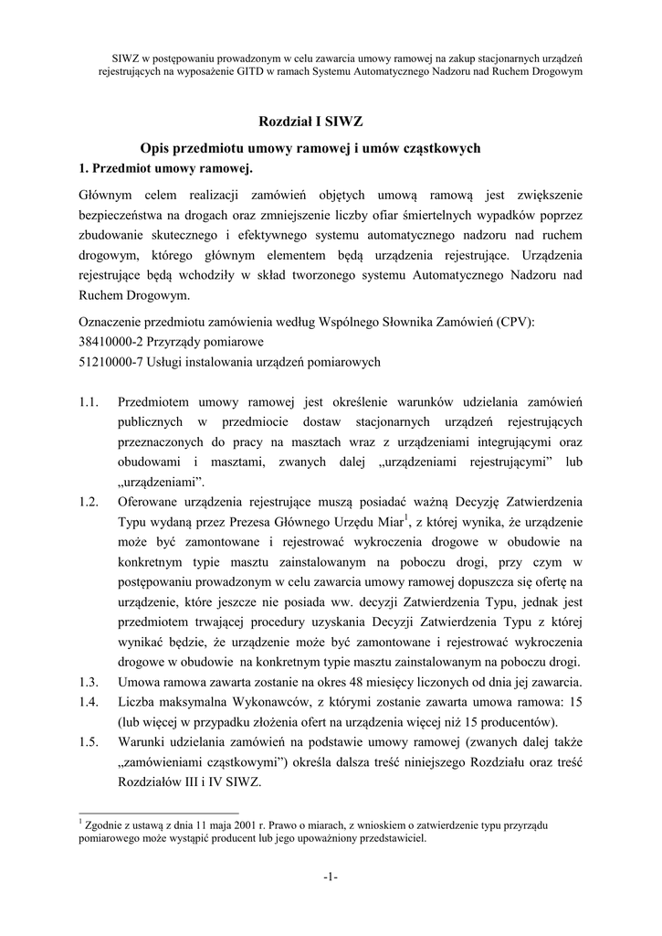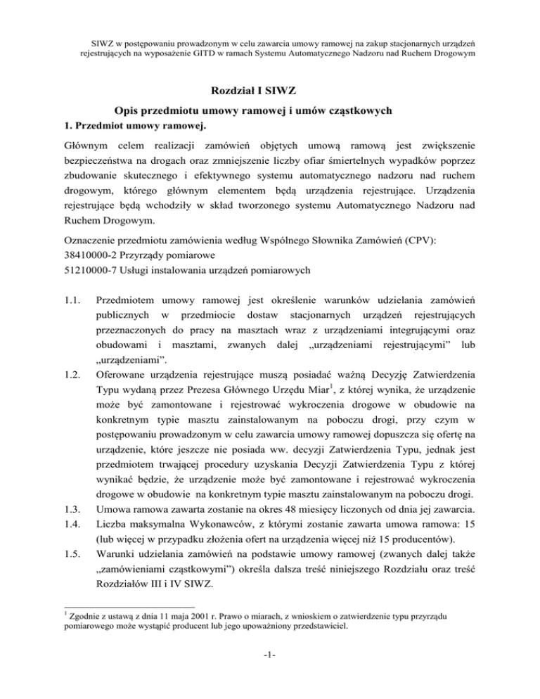 SIWZ w postępowaniu prowadzonym w celu zawarcia umowy ramowej na zakup stacjonarnych urządzeń rejestrujących na wyposażenie GITD w ramach Systemu Automatycznego Nadzoru nad Ruchem Drogowym Rozdział I SIWZ Opis przedmiotu umowy ramowej i umów cząstkowych 1. Przedmiot umowy ramowej. Głównym celem realizacji zamówień objętych umową ramową jest zwiększenie bezpieczeństwa na drogach oraz zmniejszenie liczby ofiar śmiertelnych wypadków poprzez zbudowanie skutecznego i efektywnego systemu automatycznego nadzoru nad ruchem drogowym, którego głównym elementem będą urządzenia rejestrujące. Urządzenia rejestrujące będą wchodziły w skład tworzonego systemu Automatycznego Nadzoru nad Ruchem Drogowym. Oznaczenie przedmiotu zamówienia według Wspólnego Słownika Zamówień (CPV): 38410000-2 Przyrządy pomiarowe 51210000-7 Usługi instalowania urządzeń pomiarowych 1.1. 1.2. 1.3. 1.4. 1.5. Przedmiotem umowy ramowej jest określenie warunków udzielania zamówień publicznych w przedmiocie dostaw stacjonarnych urządzeń rejestrujących przeznaczonych do pracy na masztach wraz z urządzeniami integrującymi oraz obudowami i masztami, zwanych dalej „urządzeniami rejestrującymi” lub „urządzeniami”. Oferowane urządzenia rejestrujące muszą posiadać ważną Decyzję Zatwierdzenia Typu wydaną przez Prezesa Głównego Urzędu Miar1, z której wynika, że urządzenie może być zamontowane i rejestrować wykroczenia drogowe w obudowie na konkretnym typie masztu zainstalowanym na poboczu drogi, przy czym w postępowaniu prowadzonym w celu zawarcia umowy ramowej dopuszcza się ofertę na urządzenie, które jeszcze nie posiada ww. decyzji Zatwierdzenia Typu, jednak jest przedmiotem trwającej procedury uzyskania Decyzji Zatwierdzenia Typu z której wynikać będzie, że urządzenie może być zamontowane i rejestrować wykroczenia drogowe w obudowie na konkretnym typie masztu zainstalowanym na poboczu drogi. Umowa ramowa zawarta zostanie na okres 48 miesięcy liczonych od dnia jej zawarcia. Liczba maksymalna Wykonawców, z którymi zostanie zawarta umowa ramowa: 15 (lub więcej w przypadku złożenia ofert na urządzenia więcej niż 15 producentów). Warunki udzielania zamówień na podstawie umowy ramowej (zwanych dalej także „zamówieniami cząstkowymi”) określa dalsza treść niniejszego Rozdziału oraz treść Rozdziałów III i IV SIWZ. 1 Zgodnie z ustawą z dnia 11 maja 2001 r. Prawo o miarach, z wnioskiem o zatwierdzenie typu przyrządu pomiarowego może wystąpić producent lub jego upoważniony przedstawiciel. -1- SIWZ w postępowaniu prowadzonym w celu zawarcia umowy ramowej na zakup stacjonarnych urządzeń rejestrujących na wyposażenie GITD w ramach Systemu Automatycznego Nadzoru nad Ruchem Drogowym 1.6. 1.7. 1.8. 1.9. Opis koniecznych do zachowania wymagań technicznych i funkcjonalnych zawiera dalsza treść niniejszej SIWZ. Opis przedmiotu umowy ramowej sporządzono z zachowaniem należytej staranności, z uwagi jednak na dłuższą perspektywę czasową umowy ramowej, ma on jedynie ogólny charakter. Zamawiający będzie miał prawo wprowadzania nieistotnych zmian w trakcie trwania umowy ramowej. W postępowaniu prowadzonym w celu zawarcia umowy ramowej: 1.8.1. nie dopuszcza się składania ofert częściowych ani ofert wariantowych. 1.8.2. dopuszcza się złożenie oferty obejmującej urządzenie posiadające na dzień składania ofert ważne zatwierdzenie typu, jak też i urządzenie będące przedmiotem trwającej na dzień składania ofert procedury uzyskania zatwierdzenia typu. W postępowaniach prowadzonych w celu udzielenia zamówień cząstkowych: 1.9.1. przewiduje się dopuszczenie (a) składania ofert częściowych, odpowiednio do postanowień specyfikacji dotyczącej danego zamówienia cząstkowego, a także (b) składania ofert wariantowych, zgodnie z opisem zawartym w specyfikacji dotyczącej danego zamówienia cząstkowego. 1.9.2. dopuszcza się złożenie oferty obejmującej jedynie urządzenie posiadające na dzień składania ofert ważne zatwierdzenie typu. 1.10. Umowa ramowa zostanie zawarta wyłącznie z jednym producentem albo jednym przedstawicielem producenta tego samego urządzenia (dotyczy to także przypadku oferowania przez nich różnych urządzeń tego samego producenta). W przypadku złożenia, w postępowaniu prowadzonym w celu zawarcia umowy ramowej, ofert przez więcej niż jednego producenta lub przedstawiciela producenta tego samego urządzenia, do zawarcia umowy zaproszony zostanie jeden wykonawca (producent albo przedstawiciel producenta) uzyskujący najwyższą punktację według kryteriów opisanych w Rozdziale II SIWZ. 1.11. Przy dokonywaniu wyboru najkorzystniejszej oferty cząstkowej Zamawiający stosować będzie kryteria i ich wagi określone w umowie ramowej (Rozdział III SIWZ). 1.12. Sposób oceny ofert w każdym z powyższych kryteriów zostanie każdorazowo szczegółowo określony w specyfikacji dotyczącej danego zamówienia cząstkowego. 2. Realizacja umowy ramowej. 2.1. Zamawiający, w miarę zapotrzebowania i możliwości finansowych, będzie udzielał zamówień cząstkowych każdorazowo uszczegóławiających przedmiot danego zamówienia i stosując zasady określone w SIWZ i zawartej umowie ramowej. -2- SIWZ w postępowaniu prowadzonym w celu zawarcia umowy ramowej na zakup stacjonarnych urządzeń rejestrujących na wyposażenie GITD w ramach Systemu Automatycznego Nadzoru nad Ruchem Drogowym 2.2. 2.3. 2.4. Zamawiający zaprosi do składania ofert na realizację zamówienia cząstkowego, zgodnie z art. 101 ust. 1 pkt. 2 ustawy Pzp, wszystkich wykonawców, z którymi zawrze umowę ramową. Zamawiający w każdorazowym zaproszeniu do złożenia ofert (specyfikacji) określi dokładnie niezbędne do sporządzenia oferty informacje, w szczególności: przedmiot zamówienia, termin i sposób realizacji, miejsce dostawy, możliwość składania ofert częściowych lub wariantowych, wadium