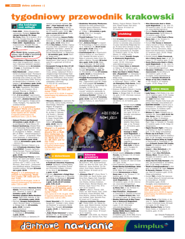dobra zabawa :-) tygodniowy przewodnik krakowski dla każdego coś miłego • PaKA 2006 – Wielka bitwa/gonitwa warszawska. Wystàpià: Kabaret Moralnego Niepokoju VS. Grupa Mo Carta. Bilety: 30 z∏ studenci, 40 z∏ pozostali. Poczàtek Rotunda, ul. Oleandry 1, 21 kwietnia o godz. 21.00. • PaKA 2006 – Spadkobiercy – serial improwizowany. Poczàtek Rotunda, ul. Oleandry 1, 21 kwietnia o godz. 23.59. New Model Army, brytyjska grupa rockowa, zagra 6 maja w warszawskim klubie Stodo∏a, więcej str. VI • LOMOściana w Filmowej Cafe. Wystawa zdj´ç lomograficznych, stworzonych z fascynacji radzieckim aparatem LOMO. Wystawa czynna 21 kwietnia – 4 maja, al. Krasiƒskiego 34. Informacje: 12 433 00 33. • Kuba Kisielewski – „kiedyÊ umia∏em kochaç od prawej do lewej”. Promocja tomu poetyckiego Kuby Kisielewskiego, ilustrowanego przez Jurian´ Jur, wyd. ÂOK i OK CK Norwida Kraków 2006. Âródmiejski OÊrodek Kultury w Krakowie, ul. Miko∏ajska 2, 21 kwietnia o godz. 19.00. • PaKA 2006 – Koncert Laureatów 22. PaKI. Prowadzenie: Piotr Ba∏troczyk. Bilety: 40 z∏ studenci, 60 z∏ pozostali. Rotunda, ul. Oleandry 1, 22 kwietnia o godz. 21.00. • Cykl „5 zł za sztukę” organizowany przez Krakowskie Centrum Kinowe ARS pod has∏em „Szalona fabryka wiosny”. W tym tygodniu: Gnijàca panna m∏oda, Hooligans, Trzy pogrzeby Melquiadesa Estrady. Wygraj! 1 z 5 podwójnych zaproszeƒ! WyÊlij sms z has∏em DK 1631 pod numer 7193. Linia czynna od 21–23.04. O wygranej poinformujemy Ci´ telefoniczne (cena: 1,22 z∏ z VAT). • Kabaret Piwnica pod Baranami 22 kwietnia o godz. 21.00 w Piwnicy pod Baranami, Rynek G∏ówny 25. • Koncert Symfoniczny. Orkiestra Filharmonii Krakowskiej, Roland Zollman (Belgia) – dyrygent. Bart∏omiej Nizio∏ – skrzypce. W programie: A. Webern – „Passacaglia”, B. Britten – „Koncert skrzypcowy d-moll”, J. Brahms – „IV Symfonia”. Filharmonia Krakowska, ul. Zwierzyniecka 1. Bilety: 21 kwietnia o godz. 19.00 – 20/15 z∏, 22 kwietnia o godz. 18.00 – 20/15/12 z∏. • Spotkanie z Michelem Faberem w ramach II Festiwalu Literatury Popularnej POPLIT. Prowadzi: Agnieszka Wolny-Hamka∏o. Piwnica pod Baranami, Rynek G∏ówny 27, 22 kwietnia, godz. 17.00. • Nocny Happening Filmowy w kinie Sfinks. Tym razem pod has∏em „Horror Show!”. W programie: „Nosferatu – symfonia cieni” z 1922 r. w re˝. F.W. Murnaua, „Stra˝ nocna”, „Underworld” oraz dodatkowe atrakcje. Przewidziany bezp∏atny autobus. Poczàtek 22 kwietnia o godz. 20.00. Wygraj! 1 z 2 podwójnych zaproszeƒ na happening. WyÊlij sms o treÊci: DK 1622 pod numer 7193. Linia czynna 21.04 do godz. 14.00. O wygranej poinformujemy Ci´ telefoniczne (cena: 1,22 z∏ z VAT). • Spotkanie autorskie z Marcinem Świetlickim. Promocja thrillera pt. „DwanaÊcie”. Alchemia, ul. Estery 5, 23 kwietnia o godz. 17.00. • Wernisaż rysunków Marka Raczkowskiego, PaKA 2006. Rotunda, ul. Oleandry 1, 23 kwietnia o godz. 19.00. • Wernisa˝: Grzegorz Banaszkiewicz „Merci, Monsieur Marey” w Pozytywce, ul. Bo˝ego Cia∏a 12, 23 kwietnia, godz. 18.00. Szczegó∏y: www.pozytywka.pl • Ireneusz Krosny w Grotesce, ul. Skarbowa 2, 23 kwietnia o godz. 20.00. • Galeria BB Kraków, ul. Garbarska 24 zaprasza na wernisa˝ wystawy „Lustra” – Piotr Sakowski oraz „Kolekcja” – Paweł Sulej w ramach Miesiàca Fotografii w Krakowie. Poczàtek 22 kwietnia o godz. 18.00. Wystawa czynna 24.04–25.05. Szczegó∏y: www.galeriabb.com • Wieczór Koncertowy Janusza Radka „Królowa nocy”. Widowisko muzyczne. Alchemia, ul. Estery 5, 25, 26 kwietnia o godz. 19.00. Bilety 30 z∏. • Recital Ewy Kołacz „Kobieta i m´˝czyzna przez strofy i przestrzenie” z cyklu Nagliska∏ki. Ewa Ko∏acz – aktorka Teatru Muzycznego „Nowa Akademia”. Dworek Bia∏opràdnicki, ul. Papiernicza 2, 24 kwietnia, godz. 18.00. Piwnice. Wst´p wolny. • III Targi Pracy 25 kwietnia w Klubie Akademickim „Arka” przy al. 29 Listopada 50, w godzinach od 9.00 do 16.00. • Europejski Pociąg do Kina 27–29 kwietnia w kinie Kijów, al. Krasiƒskiego 34. Europejska twórczoÊç filmowa, pokazy: najlepszych filmów z ubieg∏orocznego Krakowskiego Festiwalu Filmowego, filmów z irlandzkiego Festiwalu DARKLIGHT, etiud studenckich z Uniwersytetu Âlàskiego, pokaz wideoartów. Informacje: 12 433 00 33, www.kijow.pl Wygraj! 1 z 8 podwójnych zaproszeƒ! WyÊlij sms z has∏em DK 1623 pod numer 7193. Linia czynna od 21–23.04. O wygranej poinformujemy Ci´ telefoniczne (cena: 1,22 z∏ z VAT). • Wieczory Gitarowe w wykonaniu Natalii Czubaj, Joanny Czubaj, Andrzeja Olewiƒskiego, Aleksandra Wilgosa. W programie: J. Dowland, J.S. Bach, J.Ph. Rameau, J.K. Mertz, M. de Falla, C. Debussy, J.W. Duarte, L. Brouwer, E. Gismonti, R. Dyens, S. Assad. Dworek Bia∏opràdnicki, ul. Papiernicza 2, 27 kwietnia, godz. 18.00. Sala Kominkowa. Wst´p 5 z∏. • Niedzielne Warsztaty Plastyczne. Wystawa dla szkó∏ podstawowych. Stanis∏aw Ignacy Witkiewicz. Witkacy – portret. Muzeum Narodowe, al. 3 Maja 1, 23 kwietnia o godz. 12.00. Bilety 5 z∏. Szczegó∏y: 12 295 55 95. • Poranki bajkowe: Ptasie radio w Molierze, ul. Szewska 4. Poczàtek 23 kwietnia 12.15. • Baʃ „Królowa Śniegu” w re˝yserii W. Nurkowskiego w Teatrze Ludowym na os. Teatralnym 34, 25–27 kwietnia o godz. 11.00. Bilety 15 z∏. Szczegó∏y: 12 680 21 12. • Czarnoksiężnik Oz w Nowohuckim Centrum Kultury, al. Jana Paw∏a II 232. Spektakl dla dzieci od lat 4. Bajka w wykonaniu teatru Dzieci Zag∏´bia z B´dzina. Poczàtek 26 kwietnia o godz. 9.00, 11.00. Bilety 10 z∏. Informacje: 12 644 02 66. • Zajęcia otwarte z historii sztuki w Centrum M∏odzie˝y im. Jordana. Poczàtek 25 kwietnia o godz. 17 (ul. Krowoderska 17) oraz 27 kwietnia o godz. 12.15 (ul. Krowoderska 8). Szczegó∏y: 12 430 00 25. • Przegląd Nowoczesnych Form Teatralnych – impreza dla przedszkolaków – organizowany przez 