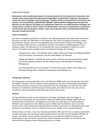 ŚWIĄTECZNE DŹWIĘKI MoneyGram und za:media präsentieren in Zusammenarbeit mit der polnischen Community in der Schweiz einen stimmungsvollen Abend mit einzigartigem musikalischen Programm. MoneyGram schickt mit seiner Kampagne „Merry Christmas“ festliche Grüße an die polnische Community in der Schweiz. Die Veranstaltung „ŚWIĄTECZNE DŹWIĘKI“ (Weihnachtliche Klänge) featured polnische Künstler aus der Schweiz und bietet ein musikalisches Spektrum von folkloristischen Gesängen und Tänzen bis hin zu Klezmer Musik. Neben der Musik können auch kurze Theaterstücke in polnischer und deutscher Sprache gesehen werden, sodass das Programm einen unterhaltsamen Abend für die ganze Familie bereit hält. Teatro Panoptikum Das Teatro Panoptikum gründete sich 2003 aus der Schauspielgruppe des Polenvereins Winterthur, die schon seit dem Jahr 2000 aktiv ist. Das Repertoire des Teatro Panoptikum besteht aus selbst geschriebenen Stücken, die sich mit zeitgenössischen und klassischen Themen beschäftigen. Von Ernst bis Heiter finden sich die verschiedenen Facetten menschlicher Gefühlsregungen in ihren Arbeiten wieder. Am Abend des 11.12. präsentiert das Teatro Panoptikum 3 Stücke aus ihrem Oeuvre. Die Stücke sind kurzweilig und mit musikalischen Einlagen durchwoben: - „Historia de un amor” mit fünf bis sechs Liedern, dazu mit Texten von Mascha Kaléko und César Keiser auf Deutsch und von Irena Müller auf Polnisch - „Magie der Zahlen” mit fünf bis sechs Liedern und mit zwei humoristischen Texten zum Thema Zahlen, verfasst von der Winterthurer Schriftstellerin Charlotte Pedergnana - „Ist Entertainment ernst zu nehmen?” mit fünf bis sechs Liedern und Texten von Christian Morgenstern, Wislawa Szymborska und Stanislaw Lec Tanzgruppe Lasowiacy Die Tanzgruppe Lasowiacy gründete sich in der Mitte der 2000er Jahre und repräsentiert die Kultur der Region Lasowiacy, die den Südosten Polens bezeichnet. Die Tänze und Gesänge dieser Region sind munter und bunt. Lasowiacy tritt auf diesem Event mit Tanzgruppe und Chor auf. Mit einem furiosen und wirbelnden Auftritt kann gerechnet werden, aber ebenso kann man sich auf eine stimmliche und stimmungsvolle Überraschung mit dem Chor freuen. MazlTov Die Band MazlTov besteht aus den Schweizern Geri Züger und Regula Julen. Geri Züger ist Musiklehrer für Klarinette und musikalischer Aktivist für folkloristische Klänge. Regula Julen ist hauptberuflich Musiklehrerin und begeistert sich schon seit vielen Jahren für osteuropäische Melodien und europäischen Folk. Beide zusammen bilden das Duo MazlTov, das sich auf den Klezmer, die in Polen beheimatete Spielart jiddischer Musik, spezialisiert hat. Mitreißend aber auch besinnlich melancholisch tönt es im Klezmer mit warmen Grüßen in die Vorweihnachtszeit. Weihnachten ist die Zeit, in der man Freunde und Familie trifft und mit ihnen zusammen gemütliche Stunden verbringt. Hat man seinen Lebensmittelpunkt fern der alten Heimat gewählt, fällt dies oft schwer. Aus diesem Grund möchten MoneyGram und za:media ein Gefühl von Heimat und Weihnachten in der polnischen Community in Zürich verbreiten und laden ein heimatliche und weihnachtliche Klänge an einem Abend gemeinsam zu erleben. Datum: 11.12. Ort: Kunsthaus Zürich, Heimplatz 1, 8001 Zürich Einlass: 19:00 Uhr Beginn: 20 Uhr Eintritt Frei