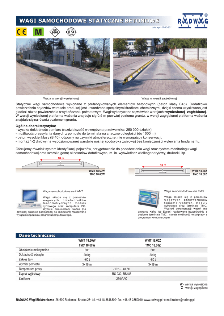 WAGI SAMOCHODOWE STATYCZNE BETONOWE data wyd. 07-10-2011 Waga w wersji wyniesionej Waga w wersji zagłębionej Statyczne wagi samochodowe wykonane z prefabrykowanych elementów betonowych (beton klasy B45). Dodatkowo powierzchnia najazdów w trakcie produkcji jest utwardzana specjalnymi środkami chemicznymi, dzięki czemu uzyskiwana jest gładka i równa powierzchnia o wykończeniu półmatowym. Wagi wykonywane są w dwóch wersjach: wyniesionej i zagłębionej. W wersji wyniesionej platforma ważenia znajduje się 0,5 m powyżej poziomu gruntu, w wersji zagłębionej platforma ważenia znajduje się na równi z poziomem gruntu. Ogólna charakterystyka: - wysoka dokładność pomiaru (rozdzielczość wewnętrzna przetwornika: 250 000 działek); - możliwość przesyłania danych z pomostu do terminala na znaczne odległości (do 1000 m); - beton wysokiej klasy (B 40), odporny na czynniki atmosferyczne, nie wymagający konserwacji; - montaż 1-2 dniowy na wypoziomowanej warstwie nośnej (podsypka żwirowa) bez konieczności wylewania fundamentu. Oferujemy również system identyfikacji pojazdów, przygotowanie do posadowienia wagi oraz system monitoringu wagi samochodowej oraz szeroką gamę akcesoriów dotatkowych, m. in. wyświetlacz wielkogabarytowy, drukarki, itp. 18 m. 18 m. WMT 18.60W TMC 18.60W WMT 18.60Z TMC 18.60Z Waga samochododowa serii TMC Waga samochododowa serii WMT Waga składa się z pomostów wagowych, przetworników tensometrycznych, modułu cyfrowego oraz terminala TMC. Wydruki dokumentacji ważeń (na drukarce Kafka lub Epson) realizowane bezpośrednio z poziomu terminala TMC. Istnieje możliwość współpracy z programem komputerowym. Waga składa się z pomostów wagowych, przetworników tensometrycznych, modułu cyfrowego oraz komputera PC. Wydruki dokumentacji ważeń (na dowolnej drukarce podłączonej do komputera) realizowane wyłącznie z poziomu programu komputerowego. Dane techniczne: Obciążenie maksymalne Dokładność odczytu Zakres tary Wymiar pomostu Temperatura pracy Sygnał wyjściowy Zasilanie WMT 18.60W TMC 18.60W 60 t 20 kg -60 t 3×18 m WMT 18.60Z TMC 18.60Z 60 t 20 kg -60 t 3×18 m -10° - +40 °C RS 232, RS485 230V AC W - wersja wyniesiona Z - wersja zagłębiona RADWAG Wagi Elektroniczne 26-600 Radom ul. Bracka 28· tel. +48 48 3848800· fax. +48 48 3850010· www.radwag.pl · e-mail:[email protected]