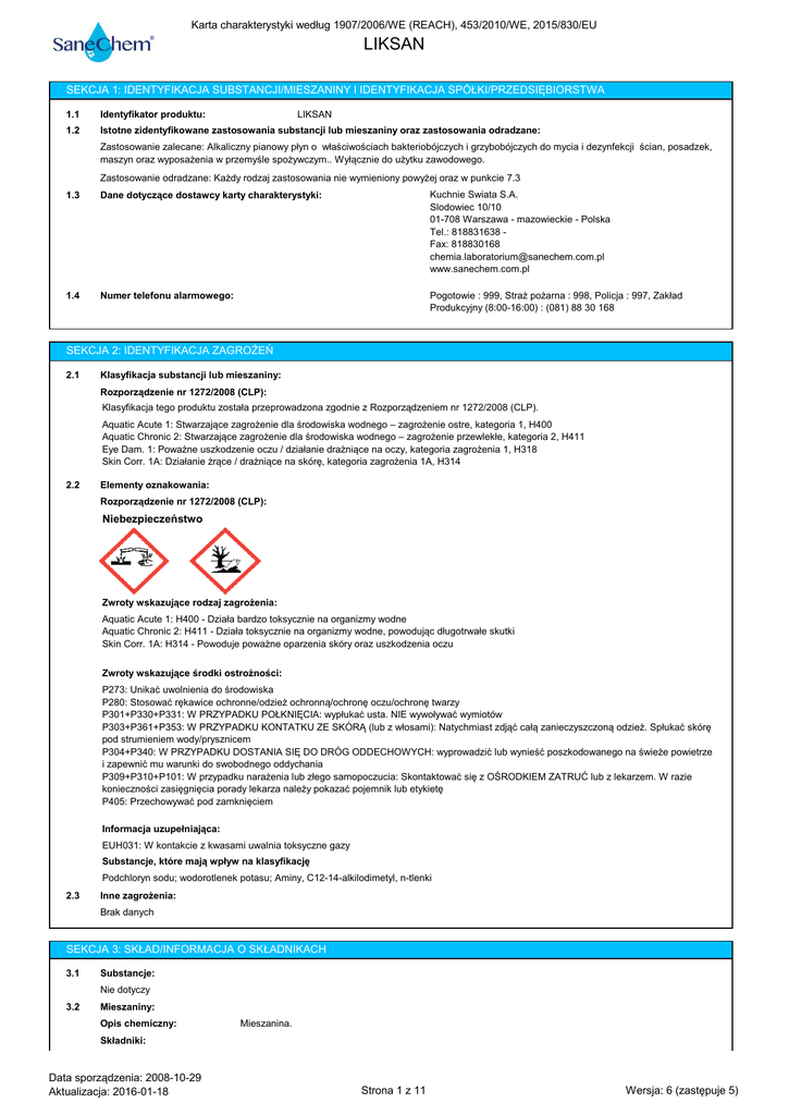 Karta charakterystyki według 1907/2006/WE (REACH), 453/2010/WE, 2015/830/EU LIKSAN SEKCJA 1: IDENTYFIKACJA SUBSTANCJI/MIESZANINY I IDENTYFIKACJA SPÓŁKI/PRZEDSIĘBIORSTWA LIKSAN 1.1 Identyfikator produktu: 1.2 Istotne zidentyfikowane zastosowania substancji lub mieszaniny oraz zastosowania odradzane: Zastosowanie zalecane: Alkaliczny pianowy płyn o właściwościach bakteriobójczych i grzybobójczych do mycia i dezynfekcji ścian, posadzek, maszyn oraz wyposażenia w przemyśle spożywczym.. Wyłącznie do użytku zawodowego. Zastosowanie odradzane: Każdy rodzaj zastosowania nie wymieniony powyżej oraz w punkcie 7.3 1.3 Dane dotyczące dostawcy karty charakterystyki: Kuchnie Swiata S.A. Slodowiec 10/10 01-708 Warszawa - mazowieckie - Polska Tel.: 818831638 Fax: 818830168 [email protected] www.sanechem.com.pl 1.4 Numer telefonu alarmowego: Pogotowie : 999, Straż pożarna : 998, Policja : 997, Zakład Produkcyjny (8:00-16:00) : (081) 88 30 168 SEKCJA 2: IDENTYFIKACJA ZAGROŻEŃ 2.1 Klasyfikacja substancji lub mieszaniny: Rozporządzenie nr 1272/2008 (CLP): Klasyfikacja tego produktu została przeprowadzona zgodnie z Rozporządzeniem nr 1272/2008 (CLP). Aquatic Acute 1: Stwarzające zagrożenie dla środowiska wodnego – zagrożenie ostre, kategoria 1, H400 Aquatic Chronic 2: Stwarzające zagrożenie dla środowiska wodnego – zagrożenie przewlekłe, kategoria 2, H411 Eye Dam. 1: Poważne uszkodzenie oczu / działanie drażniące na oczy, kategoria zagrożenia 1, H318 Skin Corr. 1A: Działanie żrące / drażniące na skórę, kategoria zagrożenia 1A, H314 2.2 Elementy oznakowania: Rozporządzenie nr 1272/2008 (CLP): Niebezpieczeństwo Zwroty wskazujące rodzaj zagrożenia: Aquatic Acute 1: H400 - Działa bardzo toksycznie na organizmy wodne Aquatic Chronic 2: H411 - Działa toksycznie na organizmy wodne, powodując długotrwałe skutki Skin Corr. 1A: H314 - Powoduje poważne oparzenia skóry oraz uszkodzenia oczu Zwroty wskazujące środki ostrożności: P273: Unikać uwolnienia do środowiska P280: Stosować rękawice ochronne/odzież ochronną/ochronę oczu/ochronę twarzy P301+P330+P331: W PRZYPADKU POŁKNIĘCIA: wypłukać usta. NIE wywoływać wymiotów P303+P361+P353: W PRZYPADKU KONTATKU ZE SKÓRĄ (lub z włosami): Natychmiast zdjąć całą zanieczyszczoną odzież. Spłukać skórę pod strumieniem wody/prysznicem P304+P340: W PRZYPADKU DOSTANIA SIĘ DO DRÓG ODDECHOWYCH: wyprowadzić lub wynieść poszkodowanego na świeże powietrze i zapewnić mu warunki do swobodnego oddychania P309+P310+P101: W przypadku narażenia lub złego samopoczucia: Skontaktować się z OŚRODKIEM ZATRUĆ lub z lekarzem. W razie konieczności zasięgnięcia porady lekarza należy pokazać pojemnik lub etykietę P405: Przechowywać pod zamknięciem Informacja uzupełniająca: EUH031: W kontakcie z kwasami uwalnia toksyczne gazy Substancje, które mają wpływ na klasyfikację Podchloryn sodu; wodorotlenek potasu; Aminy, C12-14-alkilodimetyl, n-tlenki 2.3 Inne zagrożenia: Brak danych SEKCJA 3: SKŁAD/INFORMACJA O SKŁADNIKACH 3.1 Substancje: Nie dotyczy 3.2 Mieszaniny: Opis chemiczny: Mieszanina. Składniki: Data sporządzenia: 2008-10-29 Aktualizacja: 2016-01-18 Strona 1 z 11 Wersja: 6 (zastępuje 5) Karta charakterystyki według 1907/2006/WE (REACH), 453/2010/WE, 2015/830/EU LIKSAN Zgodnie z Załącznikiem II do Rozporządzenia (WE) nr 1907/2006 (punkt 3), Produkt zawiera: Identyfikacja CAS: EC: Index: REAC CAS: EC: Index: REAC CAS: EC: Index: REAC Stężenie Nazwa chemiczna/klasyfikacja 7681-52-9 231-668-3 017-011-00-1 Podchloryn sodu 1310-58-3 215-181-3 019-002-00-8 wodorotlenek potasu Klas. dost. 34% Aquatic Acute 1: H400; Aquatic Chronic 1: H410; Eye Dam. 1: H318; Met. Corr. 1: H290; Skin Corr. 1B: Rozporządzenie 1272/2008 H314; STOT SE 3: H335 - Niebezpieczeństwo 01-2119488154-34-XXXX chlor aktywny <5% Klas. dost. 5 - <10 % Rozporządzenie 1272/2008 Acute Tox. 4: H302; Met. Corr. 1: H290; Skin Corr. 1A: H314 - Niebezpieczeństwo 01-2119487136-33-XXXX 308062-28-4 931-292-6 Nie dotyczy Aminy, C12-14-alkilodimetyl, n-tlenki Klas. dost. Acute Tox. 4: H302; Aquatic Acute 1: H400; Aquatic Chronic 2: H411; Eye Dam. 1: H318; Skin Irrit. 2: H315 Rozporządzenie 1272/2008 Niebezpieczeństwo 01-2119490061-47-XXXX 1 - <5 % Więcej informacji nt. zagrożeń stwarzanych przez substancje – patrz sekcja 8, 11, 12, 15 i 16 SEKCJA 4: ŚRODKI PIERWSZEJ POMOCY 4.1 Opis środków pierwszej pomocy: Natychmiast wezwać lekarza i pokazać mu Kartę Charakterystyki produktu. Przez wdychanie: Usunąć poszkodowanego z miejsca narażenia, zapewnić mu dostęp świeżego powietrza i odpoczynek. W ciężkich przypadkach tj. zatrzymanie krążenia i oddychania, należy zastosować sztuczne oddychanie (metoda usta-usta, masaż serca, dostarczenie tlenu, itd.) i natychmiast wezwać pomoc lekarską. Przez kontakt ze skórą: Zdjąć zanieczyszczone ubranie i buty, oczyścić skórę lub umyć poszkodowanego mydłem naturalnym , spłukując obficie zimną wodą. W przypadku poważnych dolegliwości należy się udać do lekarza. Jeżeli mieszanka spowodowała oparzenia lub odmrożenia, nie wolno zdejmować ubrania z poszkodowanego, gdyż w sytuacji, gdy ubranie jest przylepione do skóry może to spowodować jeszcze większe obrażenia. Jeśli na skórze pojawią się pęcherze, nie wolno ich przekłuwać, ponieważ może to zwiększyć ryzyko infekcji. Przez kontakt z oczami: Obficie płukać oczy wodą o temperaturze pokojowej przez 15 minut. Nie dopuścić do tego, aby poszkodowany tarł lub zamykał oczy. Jeżeli poszkodowany nosi soczewki kontaktowe, należy je usunąć o ile nie są przyklejone do oka, w przeciwnym razie można spowodować dalsze obrażenia. We wszystkich przypadkach, po umyciu poszkodowanego, należy jak najszybciej skonsultować się z lekarzem i pokazać mu Kartę Charakterystyki produktu. Przez połknięcie / aspirację: Natychmiast wezwać lekarza i pokazać mu Kartę Charakterystyki pr