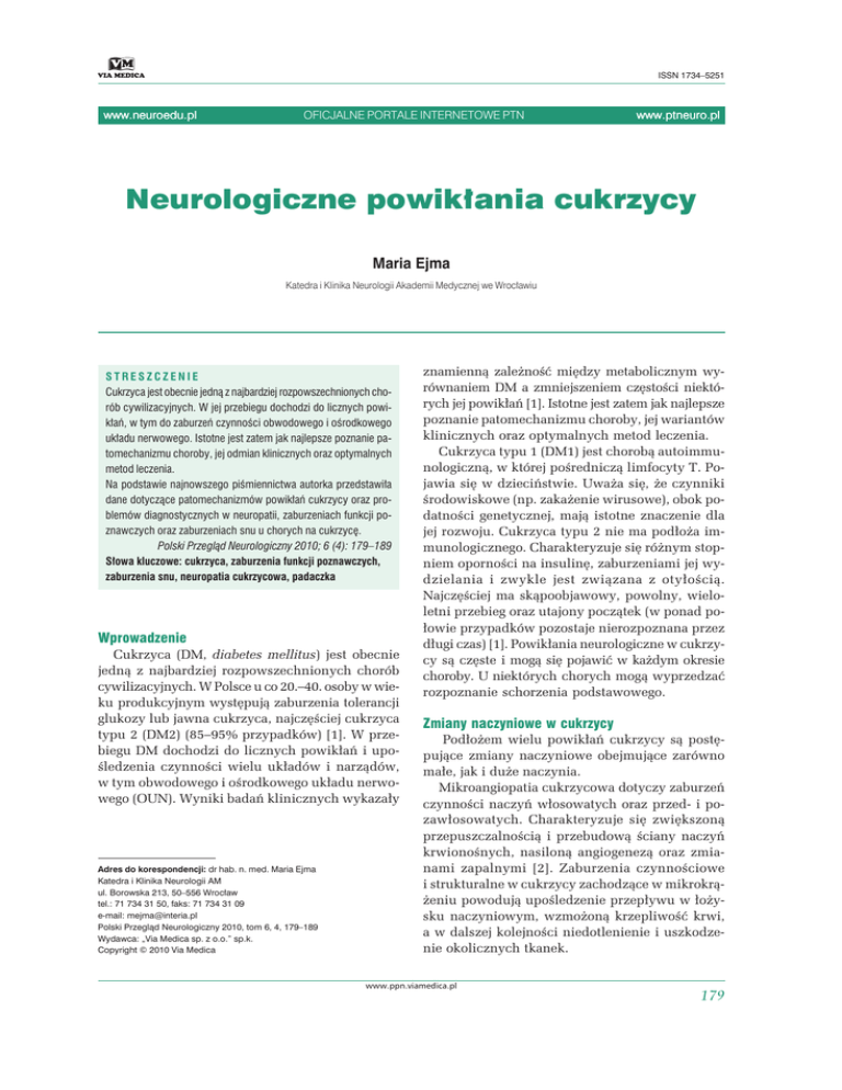 ISSN 1734–5251 www.neuroedu.pl OFICJALNE PORTALE INTERNETOWE PTN www.ptneuro.pl Neurologiczne powikłania cukrzycy Maria Ejma Katedra i Klinika Neurologii Akademii Medycznej we Wrocławiu STRESZCZENIE Cukrzyca jest obecnie jedną z najbardziej rozpowszechnionych chorób cywilizacyjnych. W jej przebiegu dochodzi do licznych powikłań, w tym do zaburzeń czynności obwodowego i ośrodkowego układu nerwowego. Istotne jest zatem jak najlepsze poznanie patomechanizmu choroby, jej odmian klinicznych oraz optymalnych metod leczenia. Na podstawie najnowszego piśmiennictwa autorka przedstawiła dane dotyczące patomechanizmów powikłań cukrzycy oraz problemów diagnostycznych w neuropatii, zaburzeniach funkcji poznawczych oraz zaburzeniach snu u chorych na cukrzycę. Polski Przegląd Neurologiczny 2010; 6 (4): 179–189 Słowa kluczowe: cukrzyca, zaburzenia funkcji poznawczych, zaburzenia snu, neuropatia cukrzycowa, padaczka Wprowadzenie Cukrzyca (DM, diabetes mellitus) jest obecnie jedną z najbardziej rozpowszechnionych chorób cywilizacyjnych. W Polsce u co 20.–40. osoby w wieku produkcyjnym występują zaburzenia tolerancji glukozy lub jawna cukrzyca, najczęściej cukrzyca typu 2 (DM2) (85–95% przypadków) [1]. W przebiegu DM dochodzi do licznych powikłań i upośledzenia czynności wielu układów i narządów, w tym obwodowego i ośrodkowego układu nerwowego (OUN). Wyniki badań klinicznych wykazały Adres do korespondencji: dr hab. n. med. Maria Ejma Katedra i Klinika Neurologii AM ul. Borowska 213, 50–556 Wrocław tel.: 71 734 31 50, faks: 71 734 31 09 e-mail: [email protected] Polski Przegląd Neurologiczny 2010, tom 6, 4, 179–189 Wydawca: „Via Medica sp. z o.o.” sp.k. Copyright © 2010 Via Medica znamienną zależność między metabolicznym wyrównaniem DM a zmniejszeniem częstości niektórych jej powikłań [1]. Istotne jest zatem jak najlepsze poznanie patomechanizmu choroby, jej wariantów klinicznych oraz optymalnych metod leczenia. Cukrzyca typu 1 (DM1) jest chorobą autoimmunologiczną, w której pośredniczą limfocyty T. Pojawia się w dzieciństwie. Uważa się, że czynniki środowiskowe (np. zakażenie wirusowe), obok podatności genetycznej, mają istotne znaczenie dla jej rozwoju. Cukrzyca typu 2 nie ma podłoża immunologicznego. Charakteryzuje się różnym stopniem oporności na insulinę, zaburzeniami jej wydzielania i zwykle jest związana z otyłością. Najczęściej ma skąpoobjawowy, powolny, wieloletni przebieg oraz utajony początek (w ponad połowie przypadków pozostaje nierozpoznana przez długi czas) [1]. Powikłania neurologiczne w cukrzycy są częste i mogą się pojawić w każdym okresie choroby. U niektórych chorych mogą wyprzedzać rozpoznanie schorzenia podstawowego. Zmiany naczyniowe w cukrzycy Podłożem wielu powikłań cukrzycy są postępujące zmiany naczyniowe obejmujące zarówno małe, jak i duże naczynia. Mikroangiopatia cukrzycowa dotyczy zaburzeń czynności naczyń włosowatych oraz przed- i pozawłosowatych. Charakteryzuje się zwiększoną przepuszczalnością i przebudową ściany naczyń krwionośnych, nasiloną angiogenezą oraz zmianami zapalnymi [2]. Zaburzenia czynnościowe i strukturalne w cukrzycy zachodzące w mikrokrążeniu powodują upośledzenie przepływu w łożysku naczyniowym, wzmożoną krzepliwość krwi, a w dalszej kolejności niedotlenienie i uszkodzenie okolicznych tkanek. www.ppn.viamedica.pl 179 Polski Przegląd Neurologiczny, 2010, tom 6, nr 4 Naczynia mikrokrążenia nie mają budowy warstwowej; składają się ze śródbłonka, błony podstawnej, pojedynczych komórek mięśni gładkich oraz pericytów, pełniących funkcje odżywcze, bardzo wrażliwych na wszelkie zmiany hemodynamiczne. W komórkach śródbłonka układ białek transportujących glukozę, GLUT2 (glucose transporter), nie podlega ujemnej regulacji zwrotnej, dlatego nawet niewielki wzrost stężenia glukozy nasila metabolizm wewnątrzkomórkowy i zaburza czynność mitochondriów [2]. W komórkach mięśni gładkich ściany naczyniowej w warunkach hiperglikemii wykorzystanie glukozy ulega zmniejszeniu, gdyż działający tam system GLUT4 podlega ujemnej regulacji zwrotnej. W wyniku braku możliwości zmetabolizowania nadmiaru glukozy w komórkach śródbłonka zostają uruchomione dodatkowe szlaki przemian — szlak glikacji białek, tor heksozaminowy oraz tor poliolowy (alkoholi wielowodorotlenowych). Prowadzą one do wzrostu produkcji wolnych rodników tlenowych, rozwoju stresu oksydacyjnego oraz apoptozy komórek śródbłonka [3]. Wykazano, że szczególnie negatywne działanie wywołują duże wahania glikemii we krwi [4]. Następstwami zmienionej przemiany glukozy są między innymi: aktywacja kinazy białkowej C (PKC, protein kinase C), spadek aktywności Na+/K+ ATP-azy, zmniejszenie biodostępności tlenku azotu i zwiększone uwalnianie endoteliny 1, która ma właściwości zwężające naczynia. Aktywacja PKC pośrednio stymuluje proliferację komórek oraz uwalnianie śródbłonkowo-naczyniowego czynnika wzrostu (VEGF, vascular endothelial growth factor), odpowiedzialnego za wzmożoną przepuszczalność naczyń i tworzenie nowych kapilar. Prawdopodobnie indukuje również ekspresję tkankowego czynnika wzrostu b (TGF-b, transforming growth factor b), fibronektyny, kolagenu IV, prozakrzepowego inhibitora aktywatora plazminogenu (PAI-1, plasminogen activator inhibitor 1) oraz prozapalnego jądrowego czynnika transkrypcyjnego kB (NFkB, nuclear factor kB), który inicjuje przewlekłą reakcję zapalną [5]. Glikozylacja (glikacja) białek jest nieenzymatycznym procesem polegającym na łączeniu grup karbonylowych cukrów z grupami aminowymi białek. Prowadzi do zmiany trzeciorzędowej struktury białek i ich krzyżowych połączeń wewnątrz- i międzycząsteczkowych. Zaburza czynność białek strukturalnych, receptorowych, transportowych i enzymatycznych. Rozwija się w przebiegu starzenia i zapaleń, jak