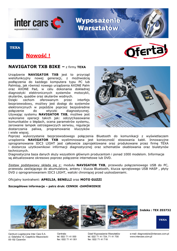 Nowość ! NAVIGATOR TXB BIKE – z firmy TEXA Urządzenie NAVIGATOR TXB jest to przyrząd wielofunkcyjny nowej generacji, z możliwością podłączenia do każdego komputera typu PC lub Palmtop, jak również nowego urządzenia AXONE Palm oraz AXONE Pad, w celu dokonania dokładnej diagnostyki elektronicznych systemów motocykli, skuterów, quadów oraz skuterów wodnych. Dzięki cechom oferowanym przez interfejs bezprzewodowy, możliwy jest dostęp do systemów elektronicznych w pojeździe poprzez bezpośrednie połączenie do wtyczki diagnostycznej. Używając systemu NAVIGATOR TXB, możliwe jest wykonanie operacji takich jak: odczyt/kasowanie komunikatów o błędach, ocena parametrów systemu, zerowanie lampek ostrzegawczych serwisu, regulacje dostarczania paliwa, programowanie kluczyków i wiele więcej. Poprzez wykorzystanie bezprzewodowego połączenia Bluetooth do komunikacji z wyświetlaczem urządzenia NAVIGATOR TXB wyeliminowana jest konieczność stosowania kabli. Innowacyjne oprogramowanie IDC3 LIGHT jest całkowicie zaprojektowane oraz produkowane przez firmę TEXA i dostarcza użytkownikowi informacji diagnostycznej oraz schematów okablowania oraz biuletynów technicznych. Diagnostyczna baza danych służy wszystkim głównym producentom i ponad 1000 modelom. Informacje są aktualizowane okresowo poprzez połączenie internetowe lub DVD. Zestaw podstawowy składa się z: modułu NAVIGATOR TXB, przewodu połączeniowego USB do PC, przewodu zasilającego do akumulatora, anteny i klucza Bluetooth, klucza sprzętowego USB HASP , płyty DVD z oprogramowaniem IDC3 LIGHT, walizki chroniącej przed uszkodzeniami. Oficjalny kontrahent: APRILIA, BENELLI oraz MOTO GUZZI Szczegółowe informacje – patrz druk: CENNIK -ZAMÓWIENIE Indeks : TEX Z03732