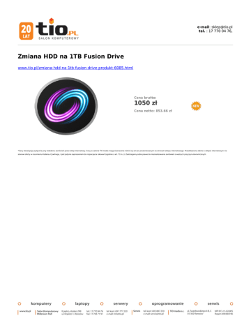 e-mail: [email protected] tel. : 17 770 04 76, Zmiana HDD na 1TB Fusion Drive www.tio.pl/zmiana-hdd-na-1tb-fusion-drive-produkt-6085.html Cena brutto: 1050 zł Cena netto: 853.66 zł *Ceny obowiązują wyłącznie przy składaniu zamówień przez sklep internetowy. Ceny w salonie TiO media mogą nieznacznie różnić się od cen prezentowanych na stronach sklepu internetowego. Przedstawiona oferta w sklepie internetowym nie stanowi oferty w rozumieniu Kodeksu Cywilnego, i jest jedynie zaproszeniem do rozpoczęcia rokowań (zgodnie z art. 71 k.c.). Zastrzegamy sobie prawo do niezrealizowania zamówień z ważnych przyczyn ekonomicznych.
