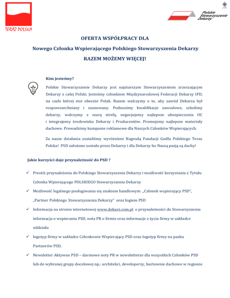 OFERTA WSPÓŁPRACY DLA Nowego Członka Wspierającego Polskiego Stowarzyszenia Dekarzy RAZEM MOŻEMY WIĘCEJ! Kim jesteśmy? Polskie Stowarzyszenie Dekarzy jest najstarszym Stowarzyszeniem zrzeszającym Dekarzy z całej Polski. Jesteśmy członkiem Międzynarodowej Federacji Dekarzy IFD, na czele której stoi obecnie Polak. Razem walczymy o to, aby zawód Dekarza był rozpowszechniany i szanowany. Podnosimy kwalifikacje zawodowe, szkolimy dekarzy, walczymy z szarą strefą, negocjujemy najlepsze ubezpieczenia OC i integrujemy środowisko Dekarzy i Producentów. Promujemy najlepsze materiały dachowe. Prowadzimy kampanie reklamowe dla Naszych Członków Wspierających. Za nasze działania zostaliśmy wyróżnieni Nagrodą Fundacji Godła Polskiego Teraz Polska! PSD założone zostało przez Dekarzy i dla Dekarzy bo Naszą pasją są dachy! Jakie korzyści daje przynależność do PSD ? Prestiż przynależenia do Polskiego Stowarzyszenia Dekarzy i możliwość korzystania z Tytułu Członka Wpierającego POLSKIEGO Stowarzyszenia Dekarzy Możliwość legalnego posługiwania się znakiem handlowym „Członek wspierający PSD”, „Partner Polskiego Stowarzyszenia Dekarzy” oraz logiem PSD Informacja na stronie internetowej www.dekarz.com.pl o przynależności do Stowarzyszenia informacja o wspieraniu PSD, nota PR o firmie oraz informacje z życia firmy w zakładce oddziału logotyp firmy w zakładce Członkowie Wspierający PSD oraz logotyp firmy na pasku Partnerów PSD, Newsletter Aktywne PSD – darmowe noty PR w newsletterze dla wszystkich Członków PSD lub do wybranej grupy docelowej np.: architekci, developerzy, hurtownie dachowe w regionie i w całej Polsce ( mailing do Dekarzy, Zarządów i Oddziałów PSD, Punktów Handlowych, Grupy Dekarskiej, Partnerów Biznesowych), Mailing dedykowany firmie, produktom, promocjom, programom lojalnościowych- 4 strony A4 informacji o Partnerze do dekarzy Możliwość wykupu reklam lub artykułów sponsorowanych na stronie internetowej (usługa możliwa tylko dla Członków PSD, Informowanie wszystkich Członków PSD oraz partnerów biznesowych o produktach Partnera, aktualnych promocjach, działaniach, wydarzeniach z życia Firmy poprzez wszystkie dostępne kanały komunikacyjne Możliwość dotarcia do dekarzy i przeprowadzenie ankiety dotyczącej firmy, produktu itp. i przedstawienie wyników w formie raportu Możliwość udziału i wykupienia pakietów sponsorskich podczas wydarzeń organizowanych przez PSD np.: Targi BUDMA, Dzień Dekarza, Gala Dekarska, Mistrzostwa Młodych Dekarzy (zgodnie z aktualną ofertą dot. wydarzenia, oferta dostępna tylko dla Członków PSD) Informacje o firmie, wydarzeniach, szkoleniach na fan page’u Polskiego Stowarzyszenia Dekarzy (Social Media /Facebook, Google +) Zaproszenia na strony www i informacja w zakładce „Te firmy zaufały PSD”, Możliwość skorzystania z rekomendacji produktu wystawionej przez PSD ( tylko dla Członków PSD), Możliwość wzięcia udziału w działaniach promocyjnych za pośrednictwem PSD, dystrybucji materiałów promocyjnych podczas wydarzeń branżowych, zaplanowanych akcji informacyjnych Możliwość przeprowadzenia szkolenia, prezentacji lub pokazu produktu w Ośrodku Kształcenia Dekarzy, należącego do Polskiego Stowarzyszenia Dekarzy (tylko dla Członków PSD) Możliwość dostarczenia materiałów promocyjnych firmy i dystrybucja ich za pomocą oddziałów PSD lub przez Biuro Zarządu Głównego PSD, Zaproszenia do udziału w inicjatywach jak wydawanie wspólnych publikacji, słownika, książki Możliwość wykupienia reklamy w prasie branżowej na preferencyjnych warunkach – dwumiesięcznik Nasz Dekarz, Współpraca z najlepszymi dekarzami w Polsce Inne – w zależności od pomysłów przekazywanych przez Członka Wspierającego Koszt uzyskania tytułu Członka Wspierającego jest ustalany indywidualnie.