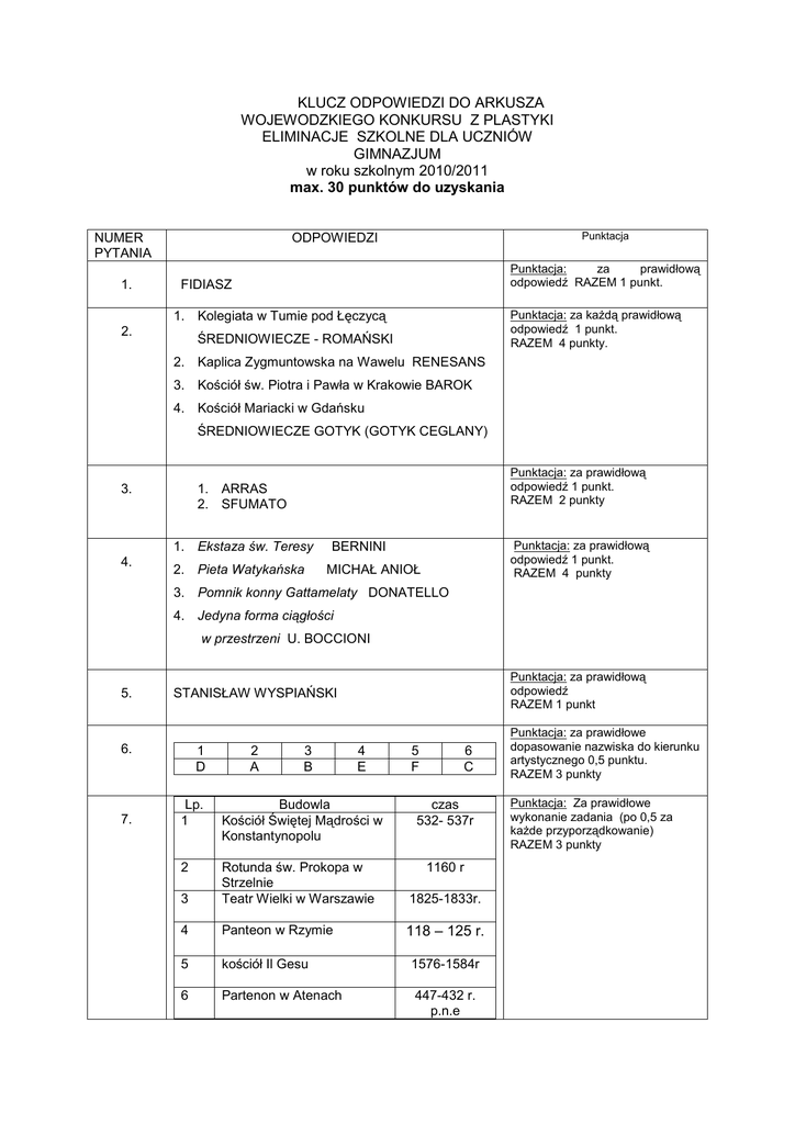 KLUCZ ODPOWIEDZI DO ARKUSZA WOJEWODZKIEGO KONKURSU Z PLASTYKI ELIMINACJE SZKOLNE DLA UCZNIÓW GIMNAZJUM w roku szkolnym 2010/2011 max. 30 punktów do uzyskania NUMER PYTANIA 1. Punktacja ODPOWIEDZI Punktacja: za prawidłową odpowiedź RAZEM 1 punkt. FIDIASZ Punktacja: za każdą prawidłową odpowiedź 1 punkt. RAZEM 4 punkty. 1. Kolegiata w Tumie pod Łęczycą 2. ŚREDNIOWIECZE - ROMAŃSKI 2. Kaplica Zygmuntowska na Wawelu RENESANS 3. Kościół św. Piotra i Pawła w Krakowie BAROK 4. Kościół Mariacki w Gdańsku ŚREDNIOWIECZE GOTYK (GOTYK CEGLANY) 3. Punktacja: za prawidłową odpowiedź 1 punkt. RAZEM 2 punkty 1. ARRAS 2. SFUMATO 1. Ekstaza św. Teresy 4. 2. Pieta Watykańska Punktacja: za prawidłową odpowiedź 1 punkt. RAZEM 4 punkty BERNINI MICHAŁ ANIOŁ 3. Pomnik konny Gattamelaty DONATELLO 4. Jedyna forma ciągłości w przestrzeni U. BOCCIONI 5. 6. 7. Punktacja: za prawidłową odpowiedź RAZEM 1 punkt STANISŁAW WYSPIAŃSKI 1 D 2 A 3 B 4 E 5 F 6 C Lp. 1 Budowla Kościół Świętej Mądrości w Konstantynopolu czas 532- 537r 2 3 Rotunda św. Prokopa w Strzelnie Teatr Wielki w Warszawie 1825-1833r. 4 Panteon w Rzymie 118 – 125 r. 5 kościół Il Gesu 1576-1584r 6 Partenon w Atenach 447-432 r. p.n.e 1160 r Punktacja: za prawidłowe dopasowanie nazwiska do kierunku artystycznego 0,5 punktu. RAZEM 3 punkty Punktacja: Za prawidłowe wykonanie zadania (po 0,5 za każde przyporządkowanie) RAZEM 3 punkty 8. 9. 10. 1. Poliklet RZEŹBIARZ 3. Andrea Palladio ARCHITEKT 2. El Greco MALARZ 4. Bertel Thorvaldsen RZEŹBIARZ 3. Gustaw Courbet MALARZ 5. Donato Bramante ARCHITEKT 1. NAWA GŁÓWNA 2. NAWY BOCZNE 3. TRANSEPT MALARSTWO RODZAJOWE gatunek malarski, który wyróżnia tematyka związana z życiem codziennym, obyczajami, obrzędami, pracą, wypoczynkiem i zabawą. Malujemy różnymi rodzajami farb. Mogą to 11. być AKWARELE- wodniste, niekryjące, przez które Punktacja: Za prawidłowe wykonanie zadania (po 0,5 za każde przyporządkowanie) RAZEM 3 punkty Punktacja: Za prawidłowe podanie nazw RAZEM 3 pkt. Punktacja: Za prawidłowe wyjaśnienie RAZEM 1 pkt. Punktacja: Za prawidłowe uzupełnienie RAZEM 3 pkt. prześwieca podłoże. Do końca XV wieku wiodącą techniką malarską była TEMPERA Obrazy malowano na desce lub płótnie, to farby kryjące, po ich wyschnięciu kolory stają się matowe. Przypomnij sobie obrazy, których powierzchnia zdaje się lśnić – malowano je farbą OLEJNĄ 1. Luwr - PARYŻ 12. 2. Prado - MADRYT Punktacja: Za prawidłowe podanie nazw miast RAZEM 2 pkt.