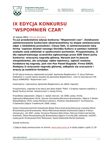 Urząd Gminy Stare Juchy Pl. 500-lecia 4, 19-330 Stare Juchy woj. warmińsko-mazurskie tel. +48(87)619-90-53 faks +48(87)619-90-53 [email protected] www.stare-juchy.pl IX EDYCJA KONKURSU "WSPOMNIEŃ CZAR" 11 marca 2011, Danuta Klimowicz To już przedostatnia edycja konkursu "Wspomnień czar". Zwiekszone zainteresowanie konkursem obserwowaliśmy na etapie zamieszczania zdjęć z niedalekiej przeszłości. Cieszy fakt, iż zainteresowanie taką formą "zapisów działań naszego Ośrodka Kultury w pamięci ludzkiej" znalazło swój oddźwięk w społeczności Juchowian. Przypominamy, iż dla najwytrwalszego uczestnika ogłoszonego przez GOK Stare Juchy konkursu- wręczymy nagrodę główną. Narazie jest to jeszcze niespodzianka, ale uchylając rąbka tajemnicy, ogłosić możemy fundatora tej nagrody. Jest nim Pan Paweł Bugieda- Firma DAOS. Dodajmy iż wręczenie nagrody głównej, odbędzie się uroczyście i wręczy ją osobiście fundator. W VIII edycji konkursu odpowiedzi przysłali: Agnieszka Bogdanowicz i P. Jerzy Polhman. Dokładnie o 1 punkt lepsza okazała się Agnieszka Bogdanowicz, i jest to zwyciężczyni VIII Edycji kONKURSU "Wspomnień czar". Gratulujemy i zapraszamy Agnieszkę Bogdanowicz po odbiór nagrody! Przypomnijmy, nagrodą w tej edycji jest płyta Kapeli "Paka" z Grajewa nagrana wspólnie z Basiąi Pauliną Gronek- dziewczynami z naszej Gminy. Prawidłowe odpowiedzi: Zdjęcie 1- babski wieczór, rok 2008, osoby; Emilia Zajkowska,Władysława Hirnik, Danuta Sosnowska,Marzanna Brzostowska. Zdjęcie 2-Świeto Niepodległości 2010, osoby;Państwo Łubowicz, Państwo Zawiślakowie,P. Suchowiecka, P.Sadowska.Zdjęcie 3-walentynki 2008, osoby; Sylwia Żukowska,Dominik Kowalewski,Beata Klaus-Gramacka,Katarzyna Lisowska,Oliwia Brzostowska,Julia Brzostowska, Marta Malinowska,Natalia Kozikowska.Zdjęcie 4-festyn rekreacyjny, rok 2007, osoby; Krystyna Pilawska-Wiercińska, Patrycja Fiedorczyk,Kamila Kuklińska, Oliwia Brzostowska,Julia Brzostowska.Zdjęcie 5-turniej piłki siatkowej, rok2007, osoby;Jacek Strzeszewski,Piotr Bobrowski, Dawid Walendzik,Marek Kozłowski. Zasady konkursu; 1.Zdjęcia będą zamieszczane na stronie: www.stare-juchy.pl w każdy piątek o godz.11.30 www.stare-juchy.pl http://www.stare-juchy.pl/aktualnosci/i,ix-edycja-konkursu-wspomnien-czar,1187.html 1/2 Urząd Gminy Stare Juchy Pl. 500-lecia 4, 19-330 Stare Juchy woj. warmińsko-mazurskie tel. +48(87)619-90-53 faks +48(87)619-90-53 [email protected] www.stare-juchy.pl 2.Edycja każdego cyklu zdjęć potrwa do czwartku następnego tygodnia, 3.W każdą środę po tygodniowej emisji zwycięzcy wręczamy nagrodę główną, 4.Przewidujemy tylko jedną nagrodę główną, 5.Przy każdej emisji ogłaszamy rodzaj nagrody, 6.Zamieszczamy w każdej emisji po 5 zdjęć. Za każde zdjęcie można zdobyć maksymalnie 3 punkty, w sumie 15 punktów za wszystkie zdjęcia w każdorazowej edycji: -za rozpoznanie osób na zamieszczonych fotografiach-1 pkt, -za rozpoznanie tylko jednej osoby na fotografii- 0.5 pkt, -za określenie rodzaju imprezy- 1 pkt , -za określenie w którym roku miało miejsce to wydarzenie-1 pkt. 7. Każdy uczestnik konkursu przysyła swoje odpowiedzi na pocztę elektroniczną GOK-u: [email protected] , z dopiskiem "Wspomnień czar" 8.Edycja zdjęć ropoczyna się 14. stycznia 2011r., a zakończy 25 marca 2011r. 9. Dla najwytrwalszego uczestnika naszego konkursu, który zbierze największą ilość punktów przewidujemy super nagrodę. NAGRODA W IX EDYCJI KONKURSU ZOSTAŁA UFUNDOWANA PRZEZ DAOS PAWEŁ BUGIEDAEKSPRESOWE POŻYCZKI GOTÓWKOWE, I JEST TO 50,00 ZŁ. DLA ZWYCIĘZCY TEJ EDYCJI. ZAPRASZAMY DO UDZIAŁU ! www.stare-juchy.pl http://www.stare-juchy.pl/aktualnosci/i,ix-edycja-konkursu-wspomnien-czar,1187.html 2/2