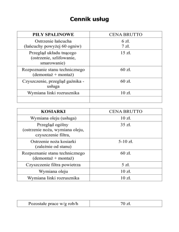 Cennik usług PIŁY SPALINOWE Ostrzenie łańcucha (łańcuchy powyżej 60 ogniw) Przegląd układu tnącego (ostrzenie, szlifowanie, smarowanie) Rozpoznanie stanu technicznego (demontaż + montaż) Czyszczenie, przegląd gaźnika usługa Wymiana linki rozrusznika CENA BRUTTO 6 zł. 7 zł. 15 zł. KOSIARKI Wymiana oleju (usługa) Przegląd ogólny (ostrzenie noża, wymiana oleju, czyszczenie filtra, Ostrzenie noża kosiarki (zależnie od stanu) Rozpoznanie stanu technicznego (demontaż + montaż) Czyszczenie filtra powietrza Wymiana oleju Wymiana linki rozrusznika CENA BRUTTO 10 zł. 35 zł. Pozostałe prace w/g rob/h 70 zł. 60 zł. 60 zł. 10 zł. 5-10 zł. 60 zł. 5 zł. 10 zł. 10 zł.
