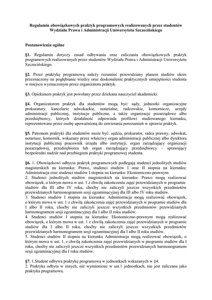 Regulamin obowiązkowych praktyk programowych realizowanych przez studentów Wydziału Prawa i Administracji Uniwersytetu Szczecińskiego Postanowienia ogólne §1. Regulamin dotyczy zasad odbywania oraz zaliczania obowiązkowych praktyk programowych realizowanych przez studentów Wydziału Prawa i Administracji Uniwersytetu Szczecińskiego. §2. Przez praktykę programową należy rozumieć przewidziany planem studiów okres przeznaczony na pogłębianie wiedzy oraz doskonalenie praktycznych umiejętności studenta w miejscu wyznaczonym przez organizatora praktyk. §3. Opiekunem praktyk jest powołany przez dziekana nauczyciel akademicki. §4. Organizatorem praktyk dla studentów mogą być: sądy, jednostki organizacyjne prokuratury, kancelarie adwokackie, notarialne, radcowskie, komornicze, urzędy administracji publicznej, instytucje publiczne, a także organizacje pozarządowe albo przedsiębiorcy, których działalność odpowiada profilowi studiowanego kierunku, reprezentowane przez osobę upoważnioną do zawierania porozumień w sprawie praktyk. §5. Patronem praktyki dla studentów może być: sędzia, prokurator, radca prawny, adwokat, notariusz, komornik, wskazany przez właściwy organ administracji publicznej albo dyrektora instytucji publicznej pracownik urzędu albo instytucji, organ zarządzający organizacji pozarządowej, przedsiębiorca lub organ zarządzający przedsiębiorcy – sprawujący bezpośredni nadzór nad przebiegiem praktyki programowej studenta. §6. 1. Obowiązkowi odbycia praktyk programowych podlegają studenci jednolitych studiów magisterskich na kierunku: Prawo, studenci studiów I oraz II stopnia na kierunku: Administracja oraz studenci studiów I stopnia na kierunku: Ekonomiczno-prawnym. 2. Studenci jednolitych studiów magisterskich na kierunku: Prawo mogą realizować obowiązek, o którym mowa w ust. 1 z chwilą zakończenia zajęć przewidzianych w programie studiów dla III albo IV roku, choćby nie zaliczyli jeszcze wszystkich przedmiotów przewidzianych harmonogramem sesji egzaminacyjnej dla III albo IV roku studiów. 3. Studenci studiów I stopnia na kierunku: Administracja mogą realizować obowiązek, o którym mowa w ust. 1 z chwilą zakończenia zajęć przewidzianych w programie studiów dla I albo II roku, choćby nie zaliczyli jeszcze wszystkich przedmiotów przewidzianych harmonogramem sesji egzaminacyjnej dla I albo II roku studiów. 4. Studenci studiów I stopnia na kierunku: Ekonomiczno-prawnym mogą realizować obowiązek, o którym mowa w ust. 1 z chwilą zakończenia zajęć przewidzianych w programie studiów dla I albo II roku, choćby nie zaliczyli jeszcze wszystkich przedmiotów przewidzianych harmonogramem sesji egzaminacyjnej dla I albo II roku studiów. 5. Studenci studiów II stopnia na kierunku Administracja mogą realizować obowiązek, o którym mowa w ust. 1, z chwilą zakończenia zajęć przewidzianych w programie studiów dla I roku, choćby nie zaliczyli jeszcze wszystkich przedmiotów przewidzianych harmonogramem sesji egzaminacyjnej dla I roku studiów. §7. 1.Student odbywa praktykę programową w jednostkach wskazanych w §4. 2. Praktyka odbyta w innych, niż wymienione w ust.1 jednostkach, nie jest zaliczana jako praktyka programowa. §8. 1. Student studiów stacjonarnych odbywa praktykę programową w okresie między 1 lipca a 31 października. 2. W uzasadnionych, odpowiednio udokumentowanych przypadkach, opiekun praktyk może wyrazić studentowi studiów stacjonarnych zgodę na odbycie praktyki programowej w innym, niż wymieniony w ust.1, terminie. 3. Student studiów niestacjonarnych na kierunku: Prawo, może odbyć praktykę programową w dowolnych terminach przypadających między zakończeniem III i zakończeniem V roku studiów. Do zaliczenia praktyki konieczne jest wykazanie, że student studiów niestacjonarnych odbył praktykę w wymiarze przewidzianym programem studiów. §9. Student jest zobowiązany do posiadania ważnego ubezpieczenia od następstw nieszczęśliwych wypadków na czas odbywania praktyki. §10. 1. Wydział nie ponosi żadnych kosztów z tytułu odbywania praktyki przez studenta. 2. Studentowi odbywającemu praktykę nie przysługują żadne roszczenia finansowe w stosunku do Wydziału. 3. Praca studenta odbywającego praktykę na rzecz organizatora praktyki ma charakter nieodpłatny, z zastrzeżeniem ust. 4. 4. W przypadku gdy organizator praktyki zdecyduje o możliwości otrzymania przez studenta wynagrodzenia z tytułu pracy wykonywanej w trakcie odbywania praktyki, stosowna umowa zawierana jest pomiędzy organizatorem praktyki a studentem, bez pośrednictwa Wydziału. §11. Student uczestniczący w praktyce programowej podlega obowiązkom wynikającym z Regulaminu studiów na Uniwersytecie Szczecińskiem oraz z aktów wewnętrznie obowiązujących u organizatora praktyk. Opiekun praktyk §12. Opiekun praktyki programowej sprawuje kierownictwo dydaktyczne oraz nadzór nad praktykami programowymi. §13. Do zakresu obowiązków opiekuna należy w szczególności: a) zawieranie porozumień z podmiotami przyjmującymi studentów na praktyki programowe, b) opracowanie ramowego programu praktyki oraz harmonogramu jej organizacji, c) uzgadnianie z organizatorem praktyki korekty programu praktyki o zagadnienia wynikające z profilu działalności organizatora praktyki, d) zapoznanie studentów z celem i programem praktyki, e) podanie do wiadomości studentów zasad oraz trybu odbywania i zaliczania praktyki, f) rozstrzyganie, wspólnie z organizatorem praktyki, spraw związanych z organizacją i przebiegiem praktyki, g) opracowanie harmonogramu pracy związanej z organizacją i przebiegiem praktyki h) wpisanie do indeksu informacji o zaliczeniu praktyki, i) prowadzenie dokumentacji organizacyjnej praktyk studenckich, j) przedkładanie do 30 listopada każdego roku władzom Wydziału i Uniwersytetu sprawozdania z przebiegu praktyki, k) informowanie dziekana o wszelkich nieprawidło
