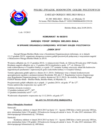 POLSKI ZWIĄZEK HODOWCÓW GOŁĘBI POCZTOWYCH ZARZĄD OKRĘGU BIELSKO BIAŁA 43-300 BIELSKO – BIAŁA , ul. Młyńska 52 Nr konta: PKO Bielsko Biała 87 102013900000640201239128 ============================================= Bielsko-Biała, dnia 24.09.2015r. L.dz. 15/2015 KOMUNIKAT Nr 06/2015 ZARZĄDU PZHGP OKRĘGU BIELSKO- BIAŁA W SPRAWIE ORGANIZACJI OKRĘGOWEJ WYSTAWY GOŁĘBI POCZTOWYCH „OSIEK 2015” Zarząd Okręgu Bielsko-Biała wraz z Komitetem Organizacyjnym informuje, że w dniach 12-13 grudnia 2015r. organizuje okręgową wystawę gołębi pocztowych połączoną z wręczeniem nagród o Mistrzostwo Okręgu Bielsko-Biała za 2015r. Wystawa odbędzie się 12-13 grudnia 2015r. w miejscowości Osiek, ul. Główna 88 (sala przy OSP Osiek). Rozdanie nagród odbędzie się w 13 grudnia 2015r.(niedziela) o godz. 1100, ul. Główna 125 (sala widowiskowa w Urzędzie Gminy), a o godz. 1300 zostanie wydany uroczysty obiad dla hodowców nagrodzonych pucharami i zaproszonych gości (sala klubu kultury w Urzędzie Gminy). Termin zgłaszania gołębi upływa z dniem 26.11.2015r. Deklaracje wraz z listami konkursowymi sporządzonymi zgodnie z postanowieniami Rozdziału XII, pkt.3-5 Regulaminu Lotowo-Zegarowego oraz Regulaminu Organizacyjnego § 4 należy dostarczyć 26.11.2015r. do siedziby Zarządu Okręgu PZHGP Bielsko-Biała - Bielsko-Biała, Bielsko-Biała, ul.Młyńska 52. Przyjmowanie gołębi odbędzie się w piątek 11 grudnia 2015r. od godz. 900 do 1200. Ocena sędziowska rozpocznie się o godz.1400. Godziny otwarcia wystawy: 12 grudnia (sobota) od 800 - 2000. 13 grudnia (niedziela) od 800 - 1500. Wydawanie eksponatów rozpocznie się 13.12.2015r. od godz.1500. KLASY NA WYSTAWĘ OKRĘGOWĄ Klasa Olimpijska Standard Samczyki: Konkursy zdobyte w latach 2014-2015 na bazie 1:5 – łącznie 2500 kkm z lotów powyżej 100 km, przy minimalnej ilości 150 gołębi i 20 hodowców biorących udział w locie. W roku 2015 minimum 30% obowiązującego kilometrażu (tj. 750 kkm). Samiczki: Konkursy zdobyte w latach 2014-2015 na bazie 1:5 – łącznie 2000 kkm z lotów powyżej 100 km, przy minimalnej ilości 150 gołębi i 20 hodowców biorących udział w locie. W roku 2015 minimum 30% obowiązującego kilometrażu (tj. 600 kkm). Klasa Olimpijska Standard - Młode Samczyki i samiczki: 3 konkursy zdobyte w 2015r. na bazie 1:5 z lotów powyżej 100 km, przy minimalnej ilości 250 gołębi i 20 hodowców biorących udział w locie. Klasa Sport A, B, C, D, E, F, G, H Gołębie sklasyfikowane wg najniższego coefficientu na bazie 1:5, kryteria – patrz tabela. Kategoria A B C D Minimum Ilość Ilość konkursów gołębi Odległość Liczba hodowców Sumy kkm Baza konkursów 2014-2015r. 100-400 km 10 250 20 1500 1:5 300-600 km 8 250 20 2800 1:5 ponad 500 km 6 150 20 3300 1:5 100-400 km 11 3-5 250 20 3500 1:5 300-600 km 2-6 250 20 1:5 ponad 500 km 1-3 150 20 1:5 250 50 E maraton ponad 700 km Kategoria Odległość Ilość konk. Ilość gołębi Liczba hodowców Sumy kkm Baza konkursów ponad 100 km 3 250 20 300 1:5 ponad 100 km 5 250 20 500 1:5 ponad 300 km 6 250 20 1800 1:5 F gołębie młode G gołębie roczne H gołębie dorosłe Kat. Wyczyn z 2 lat Kat. Wyczyn z 2015r. Samczyki Samiczki 4 2800 1:5 2015r. konkursy zdobyte w latach 2014-2015 uzyskane na bazie 1:5, decyduje najwyższy kilometraż a nie konkursy. minimum 4000 km na bazie 1:5. minimum 3500 km na bazie 1:5. ZARZĄD OKRĘGU WRAZ Z KOMITETEM ORGANIZACYJNYM SERDECZNIE ZAPRASZA WSZYSTKICH HODOWCÓW DO UDZIAŁU W WYSTAWIE. RÓWNIEŻ SYMPATYKÓW I MIŁOŚNIKÓW NASZEGO SPORTU ZAPRASZAMY DO ZWIEDZANIA NASZEJ WYSTAWY.
