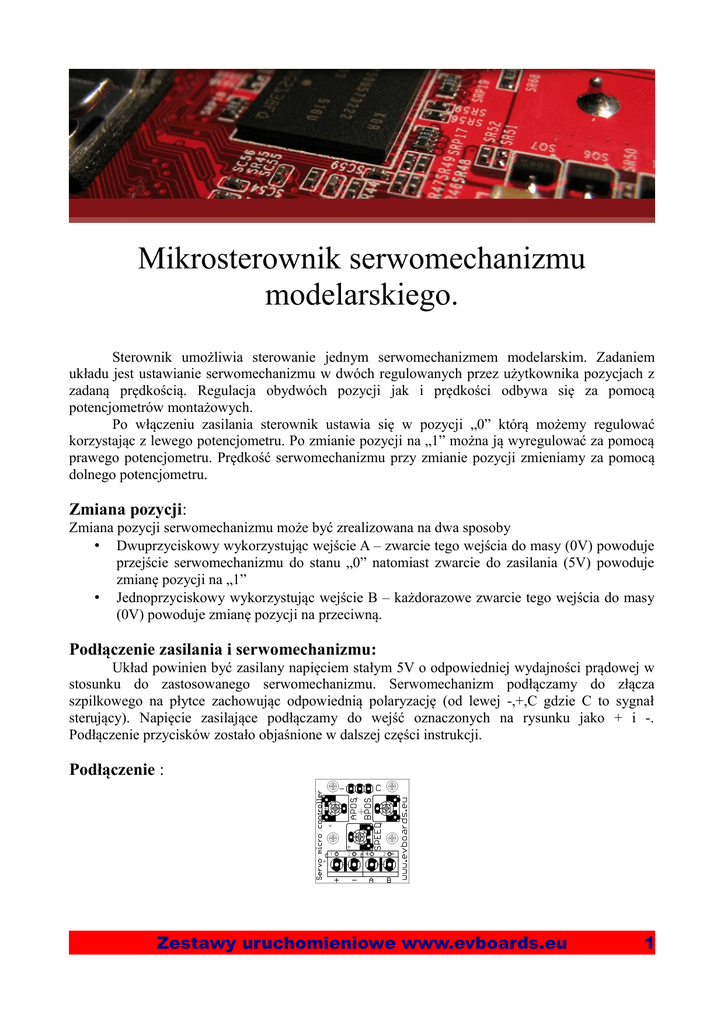 Mikrosterownik serwomechanizmu modelarskiego. Sterownik umożliwia sterowanie jednym serwomechanizmem modelarskim. Zadaniem układu jest ustawianie serwomechanizmu w dwóch regulowanych przez użytkownika pozycjach z zadaną prędkością. Regulacja obydwóch pozycji jak i prędkości odbywa się za pomocą potencjometrów montażowych. Po włączeniu zasilania sterownik ustawia się w pozycji „0” którą możemy regulować korzystając z lewego potencjometru. Po zmianie pozycji na „1” można ją wyregulować za pomocą prawego potencjometru. Prędkość serwomechanizmu przy zmianie pozycji zmieniamy za pomocą dolnego potencjometru. Zmiana pozycji: Zmiana pozycji serwomechanizmu może być zrealizowana na dwa sposoby • Dwuprzyciskowy wykorzystując wejście A – zwarcie tego wejścia do masy (0V) powoduje przejście serwomechanizmu do stanu „0” natomiast zwarcie do zasilania (5V) powoduje zmianę pozycji na „1” • Jednoprzyciskowy wykorzystując wejście B – każdorazowe zwarcie tego wejścia do masy (0V) powoduje zmianę pozycji na przeciwną. Podłączenie zasilania i serwomechanizmu: Układ powinien być zasilany napięciem stałym 5V o odpowiedniej wydajności prądowej w stosunku do zastosowanego serwomechanizmu. Serwomechanizm podłączamy do złącza szpilkowego na płytce zachowując odpowiednią polaryzację (od lewej -,+,C gdzie C to sygnał sterujący). Napięcie zasilające podłączamy do wejść oznaczonych na rysunku jako + i -. Podłączenie przycisków zostało objaśnione w dalszej części instrukcji. Podłączenie : Zestawy uruchomieniowe www.evboards.eu 1 Wygląd płytki mikrosterownika Podłączenie przycisków: Podłączenie dwu i jedno przyciskowe. Zestawy uruchomieniowe www.evboards.eu 2