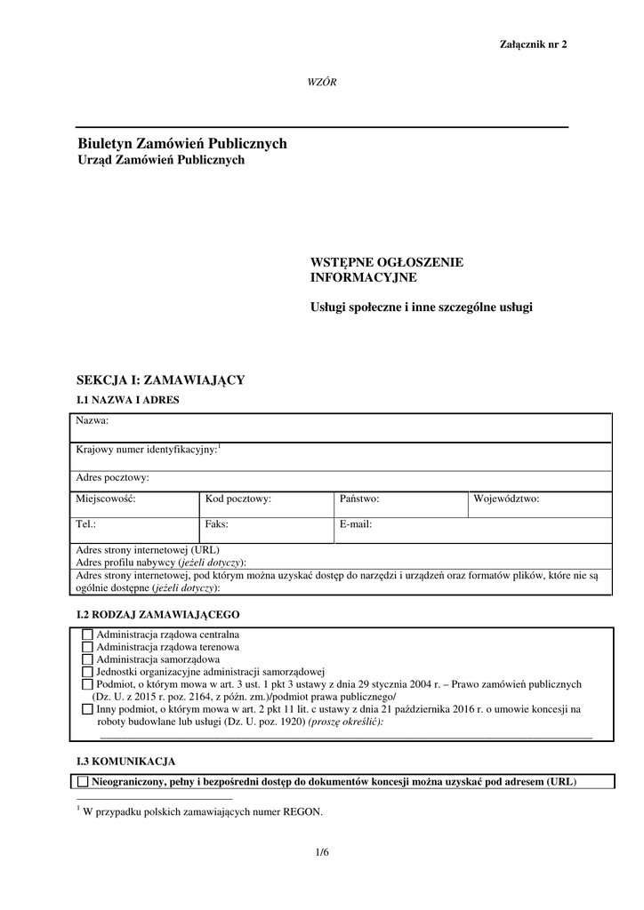 Załącznik nr 2 WZÓR Biuletyn Zamówień Publicznych Urząd Zamówień Publicznych WSTĘPNE OGŁOSZENIE INFORMACYJNE Usługi społeczne i inne szczególne usługi SEKCJA I: ZAMAWIAJĄCY I.1 NAZWA I ADRES Nazwa: Krajowy numer identyfikacyjny:1 Adres pocztowy: Miejscowość: Kod pocztowy: Państwo: Tel.: Faks: E-mail: Województwo: Adres strony internetowej (URL) Adres profilu nabywcy (jeżeli dotyczy): Adres strony internetowej, pod którym można uzyskać dostęp do narzędzi i urządzeń oraz formatów plików, które nie są ogólnie dostępne (jeżeli dotyczy): I.2 RODZAJ ZAMAWIAJĄCEGO Administracja rządowa centralna Administracja rządowa terenowa Administracja samorządowa Jednostki organizacyjne administracji samorządowej Podmiot, o którym mowa w art. 3 ust. 1 pkt 3 ustawy z dnia 29 stycznia 2004 r. – Prawo zamówień publicznych (Dz. U. z 2015 r. poz. 2164, z późn. zm.)/podmiot prawa publicznego/ Inny podmiot, o którym mowa w art. 2 pkt 11 lit. c ustawy z dnia 21 października 2016 r. o umowie koncesji na roboty budowlane lub usługi (Dz. U. poz. 1920) (proszę określić): ___________________________________________________________________________________________ I.3 KOMUNIKACJA Nieograniczony, pełny i bezpośredni dostęp do dokumentów koncesji można uzyskać pod adresem (URL) 1 W przypadku polskich zamawiających numer REGON. 1/6 (w postępowaniach wieloetapowych informację tę należy podać w zaproszeniu do składania ofert): __________________________________________________________________________________________________ Dostęp do dokumentów koncesji jest ograniczony – więcej informacji można uzyskać pod adresem (w postępowaniach wieloetapowych informację tę należy podać w zaproszeniu do składania ofert): __________________________________________________________________________________________________ Oferty/wnioski o dopuszczenie do udziału w postępowaniu należy przesyłać: Na adres2: __________________________________________________________________________________________________ Elektronicznie na adres: __________________________________________________________________________________________________ Dopuszczone/ wymagane jest przesłanie ofert albo wniosków o dopuszczenie do udziału w postępowaniu w inny sposób: __________________________________________________________________________________________________ Na adres3: __________________________________________________________________________________________________ Komunikacja elektroniczna wymaga korzystania z narzędzi i urządzeń lub formatów plików, które nie są ogólnodostępne. Nieograniczony, pełny, bezpośredni i bezpłatny dostęp do tych narzędzi można uzyskać pod adresem (URL): __________________________________________________________________________________________________ SEKCJA II: PRZEDMIOT UMOWY KONCESJI II.1. Nazwa: __________________________________________________________________________________________________ Numer referencyjny (jeżeli dotyczy): Umowa koncesji będzie finansowana ze środków pochodzących z projektu/programu Unii Europejskiej Nazwa i numer projektu/programu: ___________________________________________________________________ II.2 Rodzaj przedmiotu umowy koncesji: Roboty budowlane Usługi II.3 Informacja o częściach (jeżeli jest znana) Przedmiot umowy koncesji podzielony jest na części 2 3 Adres pocztowy, numer faksu. Adres pocztowy, numer faksu. 2/6 Oferty/wnioski o dopuszczenie do udziału w postępowaniu można składać w odniesieniu do: Wszystkich części Maksymalnej liczby części: [………] Wyłącznie jednej części Maksymalna liczba części przedmiotu umowy koncesji, w których umowa może być zawarta z tym samym wykonawcą: [………] Zamawiający zastrzega sobie prawo do zawarcia umowy koncesji łącznie w odniesieniu do następujących części lub grup części: __________________________________________________________________________________________________ II.4 Krótki opis przedmiotu umowy koncesji (wielkość lub zakres usług lub robót budowlanych, a w przypadku, gdy przedmiot umowy koncesji nie jest dzielony na części także rodzaj i ilość robót budowlanych lub usług lub określenie zapotrzebowania i wymagań, jeżeli są znane)4: __________________________________________________________________________________________________ II.5 Główny kod CPV . . . - Dodatkowe kody CPV . . . - 5 II.6 Szacunkowa całkowita wartość umowy koncesji6 Wartość bez VAT: [………] Waluta: [……….] II.7 Okres obowiązywania umowy koncesji (jeżeli jest znany)7 Okres w miesiącach: lub data rozpoczęcia: lub dniach: / / (dd/mm/rrrr) lub zakończenia: / / (dd/mm/rrrr) II.8 Informacje dodatkowe: __________________________________________________________________________________________________ 4 W przypadku podziału przedmiotu umowy koncesji na części należy wypełnić załącznik nr 1 oddzielnie dla każdej części. 5 Zastosować tyle razy, ile jest to potrzebne. 6 Podać szacunkowy rząd wartości, a w przypadku podziału przedmiotu umowy koncesji na części, szacunkowy rząd wartości umowy koncesji dla poszczególnych części podać na formularzach załącznika nr 1 (oddzielnie dla każdej części). 7 Podać przewidywany okres lub termin; zastosować tylko w przypadku, gdy przedmiot umowy koncesji nie jest podzielony na części; w przypadku podziału przedmiotu umowy koncesji na części, przewidywany okres obowiązywania umowy koncesji dla poszczególnych części podać na formularzach załącznika nr 1 (oddzielnie dla każdej części). 3/6 SEKCJA III: INFORMACJE O FINANSOWYM, TECHNICZNYM I WYKLUCZENIA Z POSTĘPOWANIA CHARAKTERZE EKONOMICZNYM, ZAWODOWYM ORAZ PODSTAWY III.1 Wykaz kryteriów kwalifikacji do udziału w postępowaniu o zawarcie umowy koncesji oraz podstaw wykluczenia z udziału w postępowaniu (jeżeli dotyczy) wraz z krótkim opisem oraz wskazaniem zasad, na jakich będą stoso
