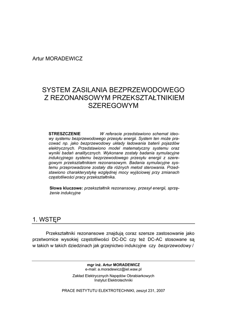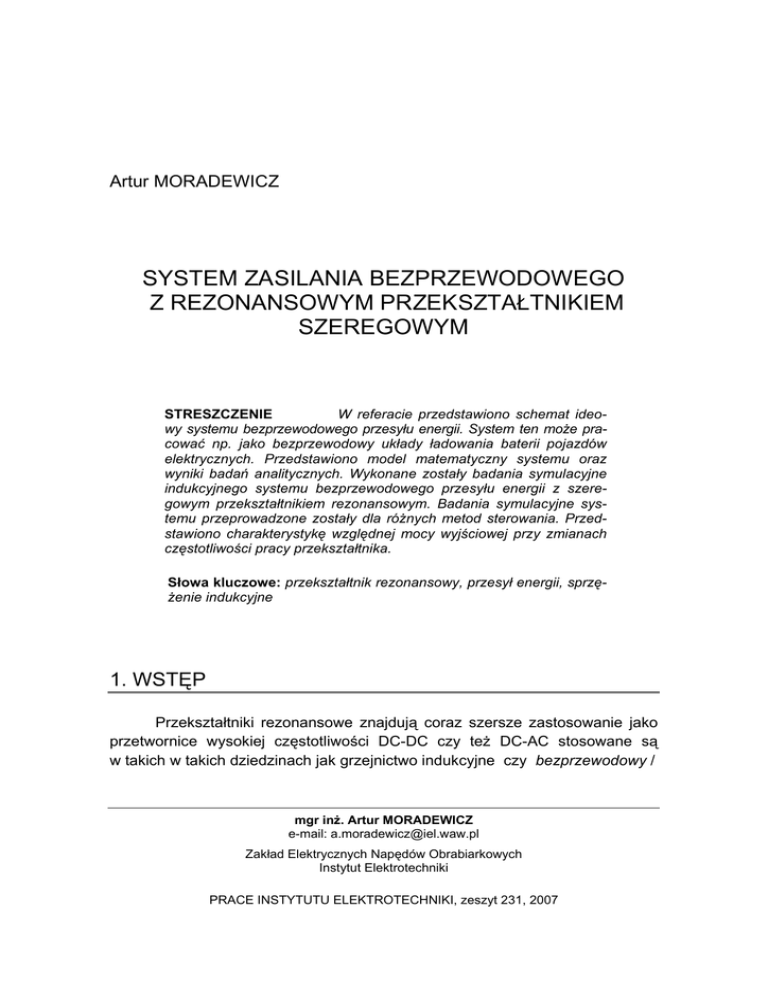 Artur MORADEWICZ SYSTEM ZASILANIA BEZPRZEWODOWEGO Z REZONANSOWYM PRZEKSZTAŁTNIKIEM SZEREGOWYM STRESZCZENIE W referacie przedstawiono schemat ideowy systemu bezprzewodowego przesyłu energii. System ten może pracować np. jako bezprzewodowy układy ładowania baterii pojazdów elektrycznych. Przedstawiono model matematyczny systemu oraz wyniki badań analitycznych. Wykonane zostały badania symulacyjne indukcyjnego systemu bezprzewodowego przesyłu energii z szeregowym przekształtnikiem rezonansowym. Badania symulacyjne systemu przeprowadzone zostały dla różnych metod sterowania. Przedstawiono charakterystykę względnej mocy wyjściowej przy zmianach częstotliwości pracy przekształtnika. Słowa kluczowe: przekształtnik rezonansowy, przesył energii, sprzężenie indukcyjne 1. WSTĘP Przekształtniki rezonansowe znajdują coraz szersze zastosowanie jako przetwornice wysokiej częstotliwości DC-DC czy też DC-AC stosowane są w takich w takich dziedzinach jak grzejnictwo indukcyjne czy bezprzewodowy / mgr inż. Artur MORADEWICZ e-mail: [email protected] Zakład Elektrycznych Napędów Obrabiarkowych Instytut Elektrotechniki PRACE INSTYTUTU ELEKTROTECHNIKI, zeszyt 231, 2007 48 A. Moradewicz bezstykowy przesył energii BPE. W stosowanych obecnie rozwiązaniach bezprzewodowego przesyłu energii wykorzystuje się głównie sprzęganie indukcyjne. W zastosowaniach tych wymagane jest przeważnie generowanie sinusoidalnych przebiegów o częstotliwości kilkudziesięciu − kilkuset kHz przy minimalnej zawartości wyższych harmonicznych. Korzyści, jakie płyną z zastosowania układu rezonansowego w systemach BPE to mniejsze gabaryty, możliwość przełączania tranzystorów w zerze prądu lub napięcia (ZCS, ZVS), mniejszy poziom zakłóceń elektromagnetycznych EMI. Celem artykułu jest analiza modelu matematycznego systemu BPE oraz porównanie wybranych właściwości przy sterowaniu mocą wyjściową szeregowego falownika rezonansowego. 2. METODY STEROWANIA PRZEKSZTAŁTNIKIEM Do konwencjonalnych metod sterowania przekształtnika DC-DC można zaliczyć następujące metody: amplitudową, częstotliwościową FM, metodę Modulacji Szerokości Impulsów PWM przy stałej częstotliwości przełączania oraz metodę PWM-FM z jednoczesną modulacją częstotliwości. W celu zapewnienia minimalnych strat przełączania zaworów, które rosną wraz ze wzrostem częstotliwości pracy przekształtnika, koniecznym jest stosowanie metod sterowania zapewniających największą sprawność. Z wymienionych powyżej metod sterowania tylko metoda amplitudowa zapewnia najmniejsze straty przełączania. W układach praktycznych gdzie w sygnałach sterujących tranzystorami w jednej gałęzi mostka, występuje strefa martwa, metoda amplitudowa zapewnia możliwość przełączania tranzystorów w warunkach ZCS (ang. zero current switching). Komutacja twarda występuje jedynie w układzie regulacji stałego napięcia zasilającego, układ ten pracuje w warunkach NZCS. Częściowe lub zupełne odstąpienie od przełączania w warunkach ZCS występuje w metodach modulacyjnych. Metodami, które pozwalają uzyskać regulacje mocy wyjściowej, przy zachowaniu przełączania tranzystorów w warunkach komutacji miękkiej i wysokiej częstotliwości pracy przekształtnika są metody integracyjne [2]. Praca przekształtnika w rezonansie wymaga jednak zastosowania bardziej złożonych metod sterowania i zabezpieczeń w porównaniu z metodami konwencjonalnymi. Między innymi ze względu na większe szybkość zmian prądów i napięć występujących na elementach L-C. Wybór metody jest, więc kompromisem pomiędzy złożonością układu zasilania w metodzie AM, złożonością układu sterowania i zabezpieczeń przy pracy przekształtnika w warunkach rezonansu a stratami przełączania zaworów w metodach modulacyjnych FM, PWM. System zasilania bezprzewodowego z rezonansowym przekształtnikiem ... 49 3. OPIS SYSTEMU BPE I MODEL MATEMATYCZNY Na rysunku 3.1 przedstawiony jest model systemu BPE z szeregowym przekształtnikiem rezonansowym. Transformator w systemie bezprzewodowego przesyłu energii składa się z dwóch niezależnych, ruchomych względem siebie rdzeni. Rys. 3.1. Model systemu BPE z szeregowymi kondensatorami rezonansowymi dołączonymi do uzwojenia strony pierwotnej i wtórnej transformatora W układach konwencjonalnych, w których transformatory używane są w celu zapewnienia izolacji galwanicznej między siecią a odbiornikiem lub też w celu dopasowania prądowo-napięciowego, problem rozproszenia strumienia magnetycznego właściwie nie występuje, ponieważ cały strumień zamyka się w rdzeniu transformatora. Szczelina powietrzna, która w systemie BPE zapewnia bezprzewodowość / bezstykowość zasilania odbiorników znajdujących się po stronie wtórnej transformatora, powodując jednocześnie znaczące obniżenie sprawności i wartości przesyłanej energii ze strony pierwotnej na wtórną, ponieważ strumień rozproszenia wzrasta, a to powoduje wzrost indukcyjności rozproszenia uzwojeń transformatora. Kompensacja indukcyjności rozproszenia transformatora, w przedstawionym modelu, zrealizowana jest poprzez szeregowe dołączenie kondensatorów rezonansowych do uzwojeń transformatora po stronie pierwotnej i wtórnej. Przekształtnik zasilany jest ze źródła napięcia stałego E z i generuje na wyjściu napięcie przemienne u1 (t ) o przebiegu prosto- 50 A. Moradewicz kątnym. Przebieg napięcia na przekątnej przekształtnika zapisany w szeregu Fouriera można przedstawić jako: u1 (t ) = 4 ⋅ Ez π 1 sin (nω1t ) n =1, 3, 5... n ∑ (1) Częstotliwość drgań własnych obwodu, rys. 3.2 bez tłumienia wynosi: ωo = 1 / Lr Cr (2) a impedancja falowa ρ = Lr / C r (3) dobroć obwodu Qac = ρ / Re (4) Częstotliwość drgań własnych obwodu rezonansowego wyraża się jako: ωr = (1 / (Lr C r ) − α )2 gdzie Lr = L11 + L22 – wypadkowa indukcyjność rezonansowa, (5) 1 1 1 = + 