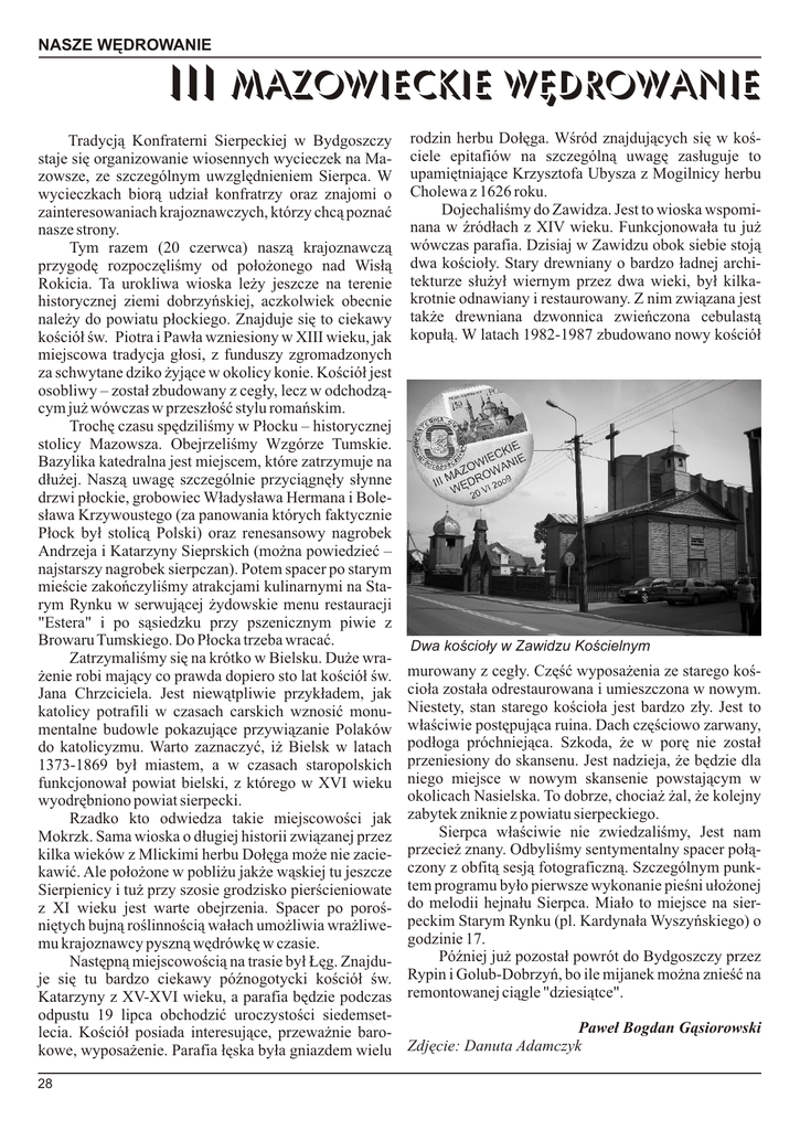 NASZE WÊDROWANIE III Mazowieckie Wêdrowanie Tradycj¹ Konfraterni Sierpeckiej w Bydgoszczy staje siê organizowanie wiosennych wycieczek na Mazowsze, ze szczególnym uwzglêdnieniem Sierpca. W wycieczkach bior¹ udzia³ konfratrzy oraz znajomi o zainteresowaniach krajoznawczych, którzy chc¹ poznaæ nasze strony. Tym razem (20 czerwca) nasz¹ krajoznawcz¹ przygodê rozpoczêliœmy od po³o¿onego nad Wis³¹ Rokicia. Ta urokliwa wioska le¿y jeszcze na terenie historycznej ziemi dobrzyñskiej, aczkolwiek obecnie nale¿y do powiatu p³ockiego. Znajduje siê to ciekawy koœció³ œw. Piotra i Paw³a wzniesiony w XIII wieku, jak miejscowa tradycja g³osi, z funduszy zgromadzonych za schwytane dziko ¿yj¹ce w okolicy konie. Koœció³ jest osobliwy – zosta³ zbudowany z ceg³y, lecz w odchodz¹cym ju¿ wówczas w przesz³oœæ stylu romañskim. Trochê czasu spêdziliœmy w P³ocku – historycznej stolicy Mazowsza. Obejrzeliœmy Wzgórze Tumskie. Bazylika katedralna jest miejscem, które zatrzymuje na d³u¿ej. Nasz¹ uwagê szczególnie przyci¹gnê³y s³ynne drzwi p³ockie, grobowiec W³adys³awa Hermana i Boles³awa Krzywoustego (za panowania których faktycznie P³ock by³ stolic¹ Polski) oraz renesansowy nagrobek Andrzeja i Katarzyny Sieprskich (mo¿na powiedzieæ – najstarszy nagrobek sierpczan). Potem spacer po starym mieœcie zakoñczyliœmy atrakcjami kulinarnymi na Starym Rynku w serwuj¹cej ¿ydowskie menu restauracji "Estera" i po s¹siedzku przy pszenicznym piwie z Browaru Tumskiego. Do P³ocka trzeba wracaæ. Zatrzymaliœmy siê na krótko w Bielsku. Du¿e wra¿enie robi maj¹cy co prawda dopiero sto lat koœció³ œw. Jana Chrzciciela. Jest niew¹tpliwie przyk³adem, jak katolicy potrafili w czasach carskich wznosiæ monumentalne budowle pokazuj¹ce przywi¹zanie Polaków do katolicyzmu. Warto zaznaczyæ, i¿ Bielsk w latach 1373-1869 by³ miastem, a w czasach staropolskich funkcjonowa³ powiat bielski, z którego w XVI wieku wyodrêbniono powiat sierpecki. Rzadko kto odwiedza takie miejscowoœci jak Mokrzk. Sama wioska o d³ugiej historii zwi¹zanej przez kilka wieków z Mlickimi herbu Do³êga mo¿e nie zaciekawiæ. Ale po³o¿one w pobli¿u jak¿e w¹skiej tu jeszcze Sierpienicy i tu¿ przy szosie grodzisko pierœcieniowate z XI wieku jest warte obejrzenia. Spacer po poroœniêtych bujn¹ roœlinnoœci¹ wa³ach umo¿liwia wra¿liwemu krajoznawcy pyszn¹ wêdrówkê w czasie. Nastêpn¹ miejscowoœci¹ na trasie by³ £êg. Znajduje siê tu bardzo ciekawy póŸnogotycki koœció³ œw. Katarzyny z XV-XVI wieku, a parafia bêdzie podczas odpustu 19 lipca obchodziæ uroczystoœci siedemsetlecia. Koœció³ posiada interesuj¹ce, przewa¿nie barokowe, wyposa¿enie. Parafia ³êska by³a gniazdem wielu 28 rodzin herbu Do³êga. Wœród znajduj¹cych siê w koœciele epitafiów na szczególn¹ uwagê zas³uguje to upamiêtniaj¹ce Krzysztofa Ubysza z Mogilnicy herbu Cholewa z 1626 roku. Dojechaliœmy do Zawidza. Jest to wioska wspominana w Ÿród³ach z XIV wieku. Funkcjonowa³a tu ju¿ wówczas parafia. Dzisiaj w Zawidzu obok siebie stoj¹ dwa koœcio³y. Stary drewniany o bardzo ³adnej architekturze s³u¿y³ wiernym przez dwa wieki, by³ kilkakrotnie odnawiany i restaurowany. Z nim zwi¹zana jest tak¿e drewniana dzwonnica zwieñczona cebulast¹ kopu³¹. W latach 1982-1987 zbudowano nowy koœció³ Dwa koœcio³y w Zawidzu Koœcielnym murowany z ceg³y. Czêœæ wyposa¿enia ze starego koœcio³a zosta³a odrestaurowana i umieszczona w nowym. Niestety, stan starego koœcio³a jest bardzo z³y. Jest to w³aœciwie postêpuj¹ca ruina. Dach czêœciowo zarwany, pod³oga próchniej¹ca. Szkoda, ¿e w porê nie zosta³ przeniesiony do skansenu. Jest nadzieja, ¿e bêdzie dla niego miejsce w nowym skansenie powstaj¹cym w okolicach Nasielska. To dobrze, chocia¿ ¿al, ¿e kolejny zabytek zniknie z powiatu sierpeckiego. Sierpca w³aœciwie nie zwiedzaliœmy, Jest nam przecie¿ znany. Odbyliœmy sentymentalny spacer po³¹czony z obfit¹ sesj¹ fotograficzn¹. Szczególnym punktem programu by³o pierwsze wykonanie pieœni u³o¿onej do melodii hejna³u Sierpca. Mia³o to miejsce na sierpeckim Starym Rynku (pl. Kardyna³a Wyszyñskiego) o godzinie 17. PóŸniej ju¿ pozosta³ powrót do Bydgoszczy przez Rypin i Golub-Dobrzyñ, bo ile mijanek mo¿na znieœæ na remontowanej ci¹gle "dziesi¹tce". Pawe³ Bogdan G¹siorowski Zdjêcie: Danuta Adamczyk