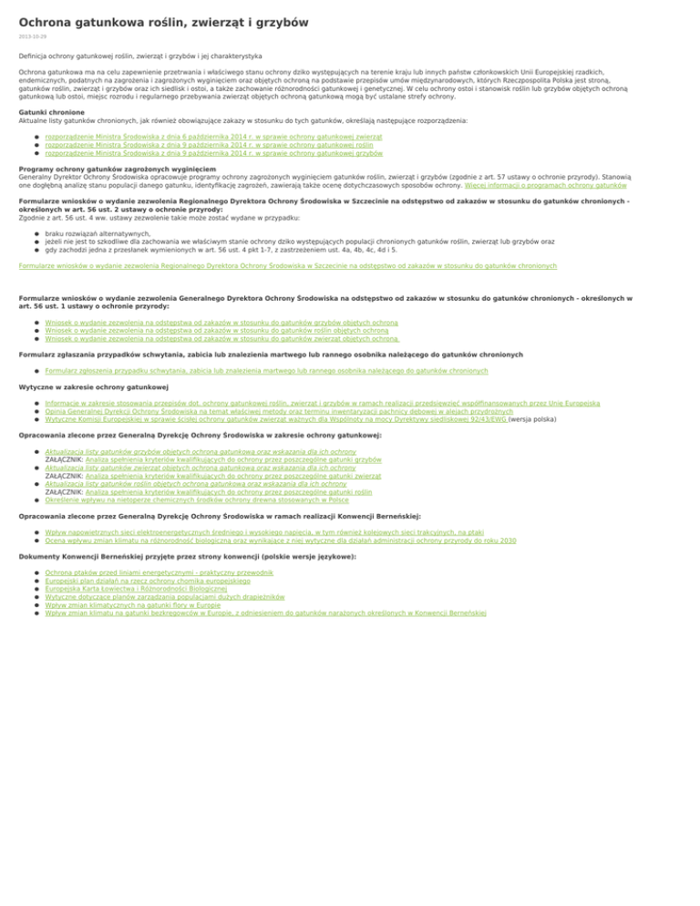 Ochrona gatunkowa roślin, zwierząt i grzybów 2013-10-29 Definicja ochrony gatunkowej roślin, zwierząt i grzybów i jej charakterystyka Ochrona gatunkowa ma na celu zapewnienie przetrwania i właściwego stanu ochrony dziko występujących na terenie kraju lub innych państw członkowskich Unii Europejskiej rzadkich, endemicznych, podatnych na zagrożenia i zagrożonych wyginięciem oraz objętych ochroną na podstawie przepisów umów międzynarodowych, których Rzeczpospolita Polska jest stroną, gatunków roślin, zwierząt i grzybów oraz ich siedlisk i ostoi, a także zachowanie różnorodności gatunkowej i genetycznej. W celu ochrony ostoi i stanowisk roślin lub grzybów objętych ochroną gatunkową lub ostoi, miejsc rozrodu i regularnego przebywania zwierząt objętych ochroną gatunkową mogą być ustalane strefy ochrony. Gatunki chronione Aktualne listy gatunków chronionych, jak również obowiązujące zakazy w stosunku do tych gatunków, określają następujące rozporządzenia: rozporządzenie Ministra Środowiska z dnia 6 października 2014 r. w sprawie ochrony gatunkowej zwierząt rozporządzenie Ministra Środowiska z dnia 9 października 2014 r. w sprawie ochrony gatunkowej roślin rozporządzenie Ministra Środowiska z dnia 9 października 2014 r. w sprawie ochrony gatunkowej grzybów Programy ochrony gatunków zagrożonych wyginięciem Generalny Dyrektor Ochrony Środowiska opracowuje programy ochrony zagrożonych wyginięciem gatunków roślin, zwierząt i grzybów (zgodnie z art. 57 ustawy o ochronie przyrody). Stanowią one dogłębną analizę stanu populacji danego gatunku, identyfikację zagrożeń, zawierają także ocenę dotychczasowych sposobów ochrony. Więcej informacji o programach ochrony gatunków Formularze wniosków o wydanie zezwolenia Regionalnego Dyrektora Ochrony Środowiska w Szczecinie na odstępstwo od zakazów w stosunku do gatunków chronionych określonych w art. 56 ust. 2 ustawy o ochronie przyrody: Zgodnie z art. 56 ust. 4 ww. ustawy zezwolenie takie może zostać wydane w przypadku: braku rozwiązań alternatywnych, jeżeli nie jest to szkodliwe dla zachowania we właściwym stanie ochrony dziko występujących populacji chronionych gatunków roślin, zwierząt lub grzybów oraz gdy zachodzi jedna z przesłanek wymienionych w art. 56 ust. 4 pkt 1-7, z zastrzeżeniem ust. 4a, 4b, 4c, 4d i 5. Formularze wniosków o wydanie zezwolenia Regionalnego Dyrektora Ochrony Środowiska w Szczecinie na odstępstwo od zakazów w stosunku do gatunków chronionych Formularze wniosków o wydanie zezwolenia Generalnego Dyrektora Ochrony Środowiska na odstępstwo od zakazów w stosunku do gatunków chronionych - określonych w art. 56 ust. 1 ustawy o ochronie przyrody: Wniosek o wydanie zezwolenia na odstępstwa od zakazów w stosunku do gatunków grzybów objętych ochroną Wniosek o wydanie zezwolenia na odstępstwa od zakazów w stosunku do gatunków roślin objętych ochroną Wniosek o wydanie zezwolenia na odstępstwa od zakazów w stosunku do gatunków zwierząt objętych ochroną Formularz zgłaszania przypadków schwytania, zabicia lub znalezienia martwego lub rannego osobnika należącego do gatunków chronionych Formularz zgłoszenia przypadku schwytania, zabicia lub znalezienia martwego lub rannego osobnika należącego do gatunków chronionych Wytyczne w zakresie ochrony gatunkowej Informacje w zakresie stosowania przepisów dot. ochrony gatunkowej roślin, zwierząt i grzybów w ramach realizacji przedsięwzięć współfinansowanych przez Unię Europejską Opinia Generalnej Dyrekcji Ochrony Środowiska na temat właściwej metody oraz terminu inwentaryzacji pachnicy dębowej w alejach przydrożnych Wytyczne Komisji Europejskiej w sprawie ścisłej ochrony gatunków zwierząt ważnych dla Wspólnoty na mocy Dyrektywy siedliskowej 92/43/EWG (wersja polska) Opracowania zlecone przez Generalną Dyrekcję Ochrony Środowiska w zakresie ochrony gatunkowej: Aktualizacja listy gatunków grzybów objętych ochroną gatunkową oraz wskazania dla ich ochrony ZAŁĄCZNIK: Analiza spełnienia kryteriów kwalifikujących do ochrony przez poszczególne gatunki grzybów Aktualizacja listy gatunków zwierząt objętych ochroną gatunkową oraz wskazania dla ich ochrony ZAŁĄCZNIK: Analiza spełnienia kryteriów kwalifikujących do ochrony przez poszczególne gatunki zwierząt Aktualizacja listy gatunków roślin objętych ochroną gatunkową oraz wskazania dla ich ochrony ZAŁĄCZNIK: Analiza spełnienia kryteriów kwalifikujących do ochrony przez poszczególne gatunki roślin Określenie wpływu na nietoperze chemicznych środków ochrony drewna stosowanych w Polsce Opracowania zlecone przez Generalną Dyrekcję Ochrony Środowiska w ramach realizacji Konwencji Berneńskiej: Wpływ napowietrznych sieci elektroenergetycznych średniego i wysokiego napięcia, w tym również kolejowych sieci trakcyjnych, na ptaki Ocena wpływu zmian klimatu na różnorodność biologiczną oraz wynikające z niej wytyczne dla działań administracji ochrony przyrody do roku 2030 Dokumenty Konwencji Berneńskiej przyjęte przez strony konwencji (polskie wersje językowe): Ochrona ptaków przed liniami energetycznymi - praktyczny przewodnik Europejski plan działań na rzecz ochrony chomika europejskiego Europejska Karta Łowiectwa i Różnorodności Biologicznej Wytyczne dotyczące planów zarządzania populacjami dużych drapieżników Wpływ zmian klimatycznych na gatunki flory w Europie Wpływ zmian klimatu na gatunki bezkręgowców w Europie, z odniesieniem do gatunków narażonych określonych w Konwencji Berneńskiej