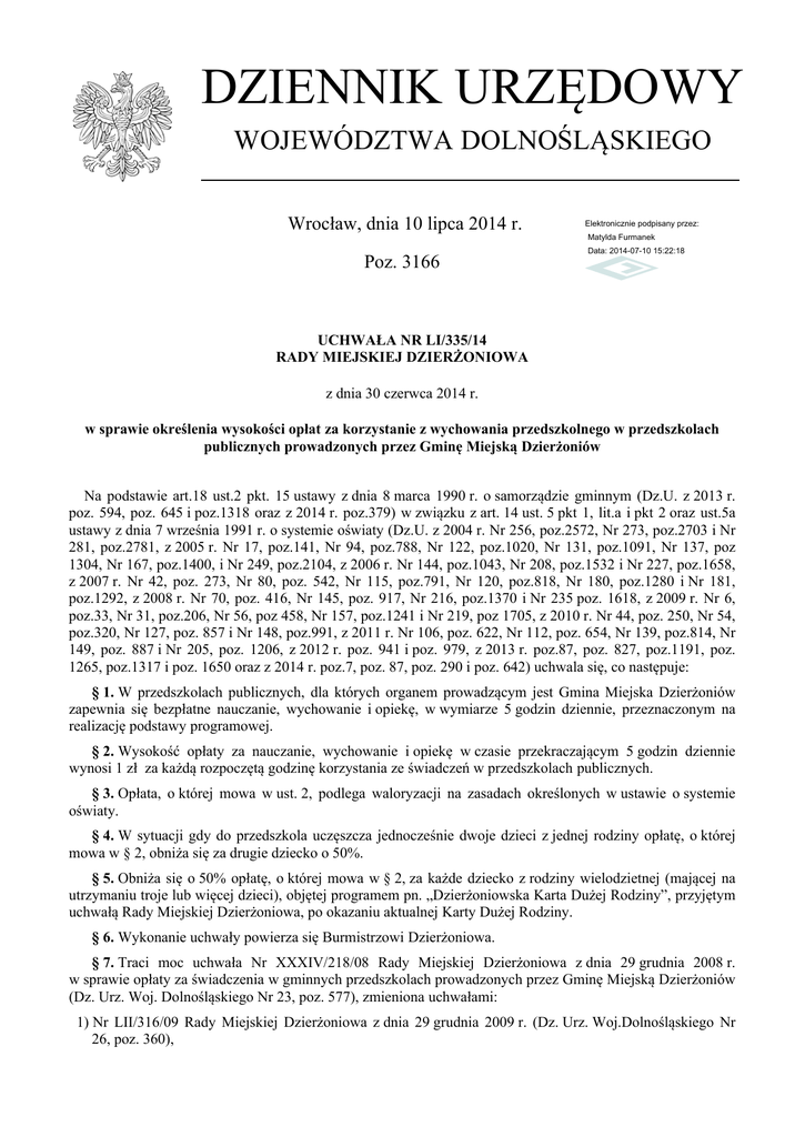 DZIENNIK URZĘDOWY WOJEWÓDZTWA DOLNOŚLĄSKIEGO Wrocław, dnia 10 lipca 2014 r. Elektronicznie podpisany przez: Matylda Furmanek Poz. 3166 Data: 2014-07-10 15:22:18 UCHWAŁA NR LI/335/14 RADY MIEJSKIEJ DZIERŻONIOWA z dnia 30 czerwca 2014 r. w sprawie określenia wysokości opłat za korzystanie z wychowania przedszkolnego w przedszkolach publicznych prowadzonych przez Gminę Miejską Dzierżoniów Na podstawie art.18 ust.2 pkt. 15 ustawy z dnia 8 marca 1990 r. o samorządzie gminnym (Dz.U. z 2013 r. poz. 594, poz. 645 i poz.1318 oraz z 2014 r. poz.379) w związku z art. 14 ust. 5 pkt 1, lit.a i pkt 2 oraz ust.5a ustawy z dnia 7 września 1991 r. o systemie oświaty (Dz.U. z 2004 r. Nr 256, poz.2572, Nr 273, poz.2703 i Nr 281, poz.2781, z 2005 r. Nr 17, poz.141, Nr 94, poz.788, Nr 122, poz.1020, Nr 131, poz.1091, Nr 137, poz 1304, Nr 167, poz.1400, i Nr 249, poz.2104, z 2006 r. Nr 144, poz.1043, Nr 208, poz.1532 i Nr 227, poz.1658, z 2007 r. Nr 42, poz. 273, Nr 80, poz. 542, Nr 115, poz.791, Nr 120, poz.818, Nr 180, poz.1280 i Nr 181, poz.1292, z 2008 r. Nr 70, poz. 416, Nr 145, poz. 917, Nr 216, poz.1370 i Nr 235 poz. 1618, z 2009 r. Nr 6, poz.33, Nr 31, poz.206, Nr 56, poz 458, Nr 157, poz.1241 i Nr 219, poz 1705, z 2010 r. Nr 44, poz. 250, Nr 54, poz.320, Nr 127, poz. 857 i Nr 148, poz.991, z 2011 r. Nr 106, poz. 622, Nr 112, poz. 654, Nr 139, poz.814, Nr 149, poz. 887 i Nr 205, poz. 1206, z 2012 r. poz. 941 i poz. 979, z 2013 r. poz.87, poz. 827, poz.1191, poz. 1265, poz.1317 i poz. 1650 oraz z 2014 r. poz.7, poz. 87, poz. 290 i poz. 642) uchwala się, co następuje: § 1. W przedszkolach publicznych, dla których organem prowadzącym jest Gmina Miejska Dzierżoniów zapewnia się bezpłatne nauczanie, wychowanie i opiekę, w wymiarze 5 godzin dziennie, przeznaczonym na realizację podstawy programowej. § 2. Wysokość opłaty za nauczanie, wychowanie i opiekę w czasie przekraczającym 5 godzin dziennie wynosi 1 zł za każdą rozpoczętą godzinę korzystania ze świadczeń w przedszkolach publicznych. § 3. Opłata, o której mowa w ust. 2, podlega waloryzacji na zasadach określonych w ustawie o systemie oświaty. § 4. W sytuacji gdy do przedszkola uczęszcza jednocześnie dwoje dzieci z jednej rodziny opłatę, o której mowa w § 2, obniża się za drugie dziecko o 50%. § 5. Obniża się o 50% opłatę, o której mowa w § 2, za każde dziecko z rodziny wielodzietnej (mającej na utrzymaniu troje lub więcej dzieci), objętej programem pn. „Dzierżoniowska Karta Dużej Rodziny”, przyjętym uchwałą Rady Miejskiej Dzierżoniowa, po okazaniu aktualnej Karty Dużej Rodziny. § 6. Wykonanie uchwały powierza się Burmistrzowi Dzierżoniowa. § 7. Traci moc uchwała Nr XXXIV/218/08 Rady Miejskiej Dzierżoniowa z dnia 29 grudnia 2008 r. w sprawie opłaty za świadczenia w gminnych przedszkolach prowadzonych przez Gminę Miejską Dzierżoniów (Dz. Urz. Woj. Dolnośląskiego Nr 23, poz. 577), zmieniona uchwałami: 1) Nr LII/316/09 Rady Miejskiej Dzierżoniowa z dnia 29 grudnia 2009 r. (Dz. Urz. Woj.Dolnośląskiego Nr 26, poz. 360), Dziennik Urzędowy Województwa Dolnośląskiego –2– Poz. 3166 2) Nr X/65/11 Rady Miejskiej Dzierżoniowa z dnia 27 czerwca 2011 r. (Dz. Urz. Woj. Dolnośląskiego Nr 173, poz. 2992). § 8. Uchwała wchodzi w życie po upływie 14 dni od dnia ogłoszenia w Dzienniku Urzędowym Województwa Dolnośląskiego. Wiceprzewodniczący Rady Miejskiej: A. Bolisęga