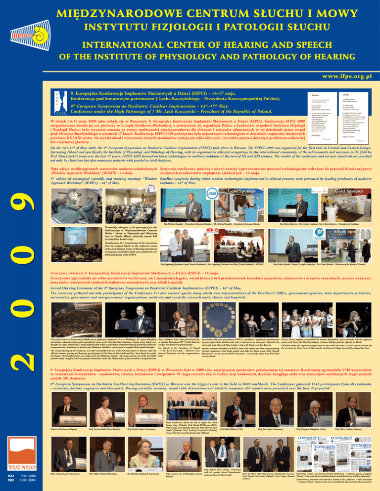MIĘDZYNARODOWE CENTRUM SŁUCHU I MOWY INSTYTUTU FIZJOLOGII I PATOLOGII SŁUCHU INTERNATIONAL CENTER OF HEARING AND SPEECH OF THE INSTITUTE OF PHYSIOLOGY AND PATHOLOGY OF HEARING www.ifps.org.pl 9. Europejska Konferencja Implantów Słuchowych u Dzieci (ESPCI) – 14–17 maja. Konferencja pod honorowym patronatem † Lecha Kaczyńskiego – Prezydenta Rzeczypospolitej Polskiej. 9th European Symposium on Paediatric Cochlear Implantation – 14th–17th May. Conference under the High Patronage of † Mr. Lech Kaczyński – President of the Republic of Poland. W dniach 14–17 maja 2009 roku odbyła się w Warszawie 9. Europejska Konferencja Implantów Słuchowych u Dzieci (ESPCI). Konferencja ESPCI 2009 zorganizowana została po raz pierwszy w Europie Środkowo-Wschodniej, a powierzenie jej organizacji Polsce, a konkretnie zespołowi Instytutu Fizjologii i Patologii Słuchu, było wyrazem uznania ze strony społeczności międzynarodowej dla dokonań i sukcesów odnoszonych w tej dziedzinie przez zespół prof. Henryka Skarżyńskiego w ostatnich 17 latach. Konferencja ESPCI 2009 poświęcona była najnowszym technologiom w dziedzinie implantów słuchowych przełomu XX i XXI wieku. Na wyniki obrad i wytyczenie nowych standardów czekają nie tylko klinicyści, lecz także pacjenci dotknięci problemem całkowitej lub częściowej głuchoty. On the 14th–17th of May 2009, the 9th European Symposium on Paediatric Cochlear Implantation (ESPCI) took place in Warsaw. The ESPCI 2009 was organized for the first time in Central and Eastern Europe. Entrusting Poland and specifically the Institute of Physiology and Pathology of Hearing, with its organization reflected recognition, by the international community, of the achievements and successes in the field by Prof. Skarżyński’s team over the last 17 years. ESPCI 2009 focused on latest technologies in auditory implants at the turn of XX and XXI century. The results of the conference and set new standards are awaited not only by clinicians but also numerous patients with partial or total deafness. Piąta edycja otochirurgicznych warsztatów naukowo-szkoleniowych Sympozja satelitarne, podczas których zostały zaprezentowane nowości technologiczne wdrażane do praktyki klinicznej przez „Window Approach Workshop” (WAW5) – 14 maja. czołowych producentów implantów słuchowych – 14 maja. 5th edition of otosurgical scientific and training meetings “Window Satellite symposia during which modern technologies implemented in clinical practice were presented by leading producers of auditory Approach Workshop” (WAW5) – 14th of May. implants – 14th of May. 9 Gold Sponsor Gold Sponsor Pan Michael Sundler – Prezydent Advanced Bionics / Mr. Michael Sundler – President of Advanced Bionics 0 0 Transmisje zabiegów z sali operacyjnej na sale konferencyjne w Międzynarodowym Centrum Słuchu i Mowy w Kajetanach pod Warszawą oraz w Hotelu Hilton obejrzało ponad 850 uczestników konferencji Gold Sponsor Silver Sponsor Simultaneous live transmission of the operations from the surgical theater to the conference rooms at the International Center of Hearing and Speech in Kajetany and Hilton Hotel was watched by over 850 participants of the ESPCI. Pani Ingeborg Hochmair i prof. Erwin Hochmair / Mrs. Ingeborg Hochmair and Prof. Erwin Hochmair – MED-EL Pan Cedric Briand – Prezes Zarządu Neurelec / Mr. Cedric Briand – Chairman of the Board of Neurelec Uroczyste otwarcie 9. Europejskiej Konferencji Implantów Słuchowych u Dzieci (ESPCI) – 14 maja. Uroczystość zgromadziła nie tylko uczestników konferencji, ale i znamienitych gości, wśród których byli przedstawiciele kancelarii prezydenta, ministerstw i urzędów centralnych, uczelni wyższych, instytutów resortowych i jednostek badawczo-rozwojowych oraz klinik i szpitali. Grand Opening Ceremony of the 9th European Symposium on Paediatric Cochlear Implantation (ESPCI) – 14th of May. The ceremony gathered not only participants of the Conference but also eminent guests mong which were representatives of the President’s Office, government agencies, state departments ministries, universities, government and non-government organizations, institutes and scientific research units, clinics and hospitals. Uroczyste otwarcie konferencji odbyło się w pięknych wnętrzach Teatru Wielkiego. Po części oficjalnej, powitaniu i uhonorowaniu gości specjalnych przez prof. Henryka Skarżyńskiego i panią Annę Popek rozpoczęła się część artystyczna, którą poprowadził jeden z najbardziej wszechstronnych pianistów polskich, rozpoznawany i doceniany na świecie pan Waldemar Malicki w towarzystwie zespołu Filharmonii Dowcipu. 2 Pan Chris Roberts – Prezydent Cochlear /Mr. Chris Roberts – President of Cochlear Pani minister Ewa Juńczyk-Ziomecka, Przechodni łańcuch prezydenta ESPCI z medalem i ogniwami upamiętniaw imieniu Prezydenta RP † Lecha Kaczyń- jącymi poprzednie konferencje oraz z miejscem na następne. Łańcuch ten skiego, odczytała list gratulacyjny otrzymał prof. Henryk Skarżyński z rąk prof. Paula van den Broeka On behalf of the President of Poland Special, transitory President’s of ESPCI chain with medals and links commemorating The Grand Opening of the Conference was held in beautiful interiors of the National Opera in Warsaw. After the – † Mr. Lech Kaczyński – Minister Ewa previous conferences with blank medals and links for future events. Prof. Henryk official ceremony, greeting and honoring special guests by Prof. Henryk Skarżyński and Mrs. Anna Popek the artistic Juńczyk-Ziomecka read the congratulatory Skarżyński – as the current ESPCI President – received the chain from Prof. Paul part begun. The less official part was conducted by Mr. Waldemar Malicki – all-round musician, one of the best Polish letter van den Broek pianists widely recognized and very popular around the world. The Philharmonic of Joke ensemble accompanied him. Dz