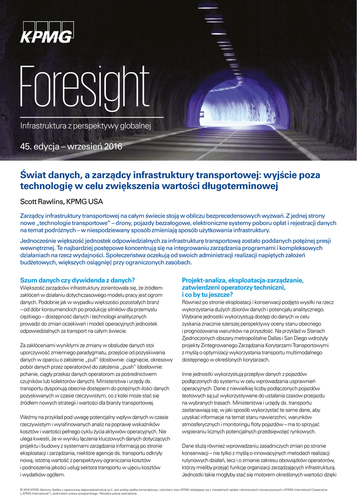 Foresight Infrastruktura z perspektywy globalnej 45. edycja – wrzesień 2016 Świat danych, a zarządcy infrastruktury transportowej: wyjście poza technologię w celu zwiększenia wartości długoterminowej Scott Rawlins, KPMG USA Zarządcy infrastruktury transportowej na całym świecie stoją w obliczu bezprecedensowych wyzwań. Z jednej strony nowe „technologie transportowe” – drony, pojazdy bezzałogowe, elektroniczne systemy poboru opłat i rejestracji danych na temat podróżnych – w niespodziewany sposób zmieniają sposób użytkowania infrastruktury. Jednocześnie większość jednostek odpowiedzialnych za infrastrukturę transportową zostało poddanych potężnej presji wewnętrznej. Te najbardziej postępowe koncentrują się na integrowaniu zarządzania programami i kompleksowych działaniach na rzecz wydajności. Społeczeństwa oczekują od swoich administracji realizacji napiętych założeń budżetowych, większych osiągnięć przy ograniczonych zasobach. Szum danych czy dywidenda z danych? Większość zarządców infrastruktury zorientowała się, że źródłem zakłóceń w działaniu dotychczasowego modelu pracy jest ogrom danych. Podobnie jak w wypadku większości pozostałych branż – od dóbr konsumenckich po produkcję silników dla przemysłu ciężkiego – dostępność danych i technologii analitycznych prowadzi do zmian oczekiwań i modeli operacyjnych jednostek odpowiedzialnych za transport na całym świecie. Za zakłóceniami wynikłymi ze zmiany w obsłudze danych stoi uporczywość zmiennego paradygmatu, przejście od pozyskiwania danych w oparciu o założenie „pull” (dosłownie: ciągnięcie, okresowy pobór danych przez operatorów) do założenia „push” (dosłownie: pchanie, ciągły przekaz danych operatorom za pośrednictwem czujników lub kolektorów danych). Ministerstwa i urzędy ds. transportu dysponują obecnie dostępem do potężnych ilości danych pozyskiwanych w czasie rzeczywistym, co z kolei może stać się źródłem nowych strategii i wartości dla branży transportowej. Weźmy na przykład pod uwagę potencjalny wpływ danych w czasie rzeczywistym i wyrafinowanych analiz na poprawę wskaźników kosztów i wartości pełnego cyklu życia aktywów operacyjnych. Nie ulega kwestii, że w wyniku łączenia kluczowych danych dotyczących projektu i budowy z systemami zarządzania informacją po stronie eksploatacji i zarządzania, niektóre agencje ds. transportu odkryły nową, istotną wartość z perspektywy ograniczania kosztów i podnoszenia jakości usług sektora transportu w ujęciu kosztów i wydatków ogółem. Projekt‑analiza, eksploatacja‑zarządzanie, zatwierdzeni operatorzy techniczni, i co by tu jeszcze? Również po stronie eksploatacji i konserwacji podjęto wysiłki na rzecz wykorzystania dużych zbiorów danych i potencjału analitycznego. Wybrane jednostki wykorzystują dostęp do danych w celu zyskania znacznie szerszej perspektywy oceny stanu obecnego i prognozowania warunków na przyszłość. Na przykład w Stanach Zjednoczonych obszary metropolitalne Dallas i San Diego wdrożyły projekty Zintegrowanego Zarządzania Korytarzami Transportowymi z myślą o optymizacji wykorzystania transportu multimodalnego dostępnego w określonych korytarzach. Inne jednostki wykorzystują przepływ danych z pojazdów podłączonych do systemu w celu wprowadzania usprawnień operacyjnych. Dane z niewielkiej liczby podłączonych pojazdów testowych są już wykorzystywane do ustalania czasów przejazdu na wybranych trasach. Ministerstwa i urzędy ds. transportu zastanawiają się, w jaki sposób wykorzystać te same dane, aby uzyskać informacje na temat stanu nawierzchni, warunków atmosferycznych i monitoringu floty pojazdów – ma to sprzyjać wspieraniu licznych potencjalnych przedsięwzięć rynkowych. Dane służą również wprowadzaniu zasadniczych zmian po stronie konserwacji – nie tylko z myślą o innowacyjnych metodach realizacji rutynowych działań, lecz i o zmianie zakresu obowiązków operatorów, którzy mieliby przejąć funkcję organizacji zarządzających infrastrukturą. Jednostki takie mogłyby stać się motorem określonych wartości dzięki © 2016 KPMG Advisory Spółka z ograniczoną odpowiedzialnością sp.k. jest polską spółką komandytową i członkiem sieci KPMG składającej się z niezależnych spółek członkowskich stowarzyszonych z KPMG International Cooperative („KPMG International”), podmiotem prawa szwajcarskiego. Wszelkie prawa zastrzeżone. dopasowaniu celów i założeń organizacyjnych do zasad zarządzania aktywami w pełnym cyklu życia – a to wymaga dostępu do danych wykonawczych i operacyjnych w czasie rzeczywistym. Znaczenie wartości danych Nie jest zaskoczeniem, że agencje ds. transportu na całym świecie coraz częściej zdają sobie sprawę z wartości posiadanych danych. Nie ulega kwestii, że dane wykonawcze i operacyjne nabierają znaczenia aktywów samych w sobie – stanowią swoisty dowód trwałej wartości i rzeczywistych kosztów. Wiele organizacji księguje koszty gromadzenia danych na temat aktywów w bilansach; niedługo dane staną się najpewniej standardową pozycją bilansową w branży transportu. Dane i informacje na temat klientów również nabierają coraz większej wartości dla ministerstw i urzędów ds. transportu, w szczególności jako czynnik wspomagający poszczególne jednostki w podejmowaniu właściwych decyzji długoterminowych w obszarze wykorzystania ograniczonych zasobów konserwacyjno ‑remontowych. Zaangażowanie klientów i wgląd w dane pochodzące z aplikacji smartfonowych i narzędzi indeksujących już wspomagają urzędy odpowiedzialne za transport w dopracowywaniu decyzji inwestycyjnych. Im większa liczba danych, jakimi użytkownicy będą się dzielić z agencjami ds. transportu (za pośrednictwem aplikacji mobilnych lub pojazdów podłączonych do systemu), tym istotnie wyższa wartoś