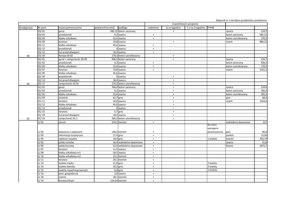 Załącznik nr 1 do Opisu przedmiotu zamówienia Kondygnacja 03 02 01 Nr pom. 03/ 01 03/ 03 03/ 04 03/ 09 03/ 11 03/ 12 03/ 14 03/ 20 02/ 01 02/ 03 02/ 04 02/ 07 02/ 09 02/ 10 02/ 13 02/ 17 01/ 01 01/ 04 01/ 05 01/ 09 01/ 11 01/ 12 01/ 13 01/ 15 01/ 19 01/ 25 1/ 01 1/ 02 1/ 03 1/ 04 1/ 05 1/ 06 1/ 07 1/ 08 1/ 10 1/ 11 1/ 13 1/ 14 1/ 15 1/ 16 1/ 18 1/ 19 1 nazwa pomieszczenia garaż przedsionek klatka schodowa korytarz klatka schodowa przedsionek hol przed dźwigami Rampa 03-02 garaż + rampa kond. 03-02 przedsionek klatka schodowa korytarz klatka schodowa przedsionek hol przed dźwigami rampa kond. 02-01 garaż przedsionek klatka schodowa śmietnik korytarz klatka schodowa przedsionek korytarz hol przed dźwigami rampa kond. 01-1 atrium kawiarnia z zapleczem informacja turystyczna zaplecze socjalne pokój rozmów pokój biurowy korytarz klatka schodowa nr1 klatka schodowa nr2 korytarz toaleta męska toaleta damska toaleta niepełnosprawnych pom. gospodarcze szatnia Korytarz/foyer powierzchnia (m2) 585,15 9,3 22,6 19,8 45,6 9 18,4 170,3 936,5 9,3 22,6 19,8 45,6 9 18,4 170,3 766,4 9,2 22,6 62,7 19,8 45,6 9 5,7 18,4 205,2 314,2 158,2 27,4 10,4 16,4 32,9 11,5 18,5 23,1 20,1 21,8 20,2 6,8 3,9 28,1 154,54 podłoga beton zacierany żywica żywica żywica żywica żywica żywica beton szorstkowany beton zacierany żywica żywica żywica żywica żywica żywica beton szorstkowany beton zacierany żywica żywica gres żywica żywica żywica gres żywica beton szorstkowany kamień kamień gres gres wykładzina dywanowa wykładzina dywanowa żywica żywica kamień kamień gres gres gres żywica kamień kamień codzienne Częstotliwość sprzątania 1x w tygodniu 1 x na 2 tygodnie Uwagi + + + + żywica beton zacierany beton szorstkowany razem 124,7 585,15 170,3 880,15 żywica beton zacierany beton szorstkowany razem 124,7 936,5 170,3 1231,5 żywica beton zacierany beton szorstkowany gres razem 124,6 766,4 205,2 68,4 1164,6 + + + + + + + + + + + + + + + + + + + + + + + + + + + + + + + + + + + + + wykładzina dywanowa do czasu wynajęcia pomieszczenia 1 toaleta 3 toalety 3 toalety 1 toaleta gres parkiet kamień żywica Razem 217 86,6 13,56 703,74 51,8 1072,7 1 2 3 4 1/ 19 1/ 20 1/ 21 1/ 25 1/ 26 2/ 01 2/ 02 2/ 04 2/ 04a 2/ 06 2/ 08 2/ 09 2/ 11 2/ 12 2/ 13 2/ 14 2/ 15 2/ 16 3/ 01 3/ 02 3/ 03 3/03a 3/ 05 3/ 07 3/ 09 3/ 10 3/ 12 3/ 13 3/ 14 3/ 15 3/ 16 3/ 17 4/ 01 4/ 02 4/ 03 4/ 04 4/ 04a 4/ 06 4/ 08 4/ 09 4/ 11 4/ 12 4/ 13 4/ 14 4/ 15 4/ 16 5/ 01 Korytarz/foyer sala konferencyjna S1 sala multimedialna komunikacja klatka schodowa nr3 sala wielofunkcyjna S2 klatka schodowa nr 3 foyer hol przed dźwigiem pom. gospodarcze klatka schodowa nr 2 komunikacja Klatka schodowa nr 1 toaleta męska toaleta damska pokój organizatorów pokój organizatorów Sala konferencyjna S3 klatka schodowa pomieszczenie gospodarcze foyer hol przed dźwigiem pom. pomocnicze klatka schodowa nr2 sala spotkań komunikacja klatka schodowa toaleta męska toaleta damska pokój organizatorów pokój organizatorów sala konferencyjna S4 powierzchnia wystawiennicza S5 klatka schodowa nr 3 pomieszczenie pomocnicze foyer hol przed dźwigiem pom gospodarcze klatka schodowa komunikacja klatka schodowa toaleta męska toaleta damska pokój organizatorów pokój organizatorów sala konferencyjna s6 sala konferencyjna S7 13,56 147,7 20 5,5 17,9 362,1 24,2 173,1 19,8 8,2 24,3 111,5 19,6 31,7 36,1 12,8 8,7 55,2 24,2 3,2 126,9 23 8,2 24,3 45,4 101,7 19,6 33,8 36,1 12,8 8,7 103,9 361 24,2 3,2 169,6 21,3 8,2 24,3 101,7 19,6 33,8 36,1 12,8 8,7 103,9 366,2 parkiet wykładzina dywanowa wykładzina dywanowa kamień żywica parkiet żywica parkiet parkiet gres kamień parkiet żywica gres gres wykładzina dywanowa wykładzina dywanowa wykładzina dywanowa żywica gres parkiet parkiet gres kamień wykładzina dywanowa parkiet żywica gres gres wykładzina dywanowa wykładzina dywanowa wykładzina dywanowa parkiet żywica wykładzina dywanowa parkiet parkiet gres kamień parkiet żywica gres gres wykładzina dywanowa wykładzina dywanowa wykładzina dywanowa wykładzina dywanowa + + + + + + + + + + + wykładzina dywanowa gres parkiet kamień żywica Razem 76,7 76 666,5 24,3 43,8 887,3 wykładzina dywanowa gres parkiet kamień żywica Razem 170,8 81,3 251,6 24,3 43,8 571,8 wykładzina dywanowa gres parkiet kamień żywica Razem 128,6 78,1 653,6 24,3 43,8 928,4 wykładzina dywanowa 631,01 + + + + + + + 5 toalet 7 toalet + + + + + + + + + + 5 toalet 7 toalet + + + + + + + + + + + + + + + + + + 5 toalet 7 toalet 5 6 5/ 02 5/ 04 5/04 * 5/04a 5/ 06 5/ 08 5/ 09 5/ 11 5/ 12 5/ 13 5/ 14 5/ 15 6/ 01 6/ 02 6/ 03 6/ 04 6/ 04a 6/ 05 6/ 06 6/ 07 6/ 10 6/ 10a 6/ 11 6/ 13 6/ 15 6/ 15a 6/ 17 6/ 18 6/ 19 6/ 20 6/ 23 6/ 24 klatka schodowa nr 3 foyer foyer hol przed dźwigiem pom gospodarcze klatka schodowa komunikacja klatka schodowa toaleta męska toaleta damska pokój organizatorów sala konferencyjna S8 recepcja sala konferencyjna pokój biurowy pokój biurowy pokój biurowy pokój biurowy pokój biurowy pokój biurowy WC - przedsionek WC komunikacja z aneksem socjalnym archiwum korytarz komunikacja szatnia, WC + natrysk pom. socjalne WC + natrysk szatnia komunikacja korytarz 6/ 25 toaleta męska 6/ 26 6/ 28 6/ 29 toaleta damska klatka schodowa komunikacja 6/ 31 6/ 32 restauracja klatka schodowa taras 24,2 117,91 53,89 21,3 8,2 24,3 101,7 19,6 33,8 36,1 21,7 103,9 38 40,8 45,8 23,7 25,1 25,2 33,3 38 4,7 1,8 30,9 4,6 60,9 8,8 12,4 12 13,3 9,1 10,5 14,8 żywica wykładzina dywanowa parkiet wykładzina dywanowa gres kamień parkiet żywica gres gres wykładzina dywanowa wykładzina dywanowa wykładzina dywanowa wykładzina dywanowa wykładzina dywanowa wykładzina dywanowa wykładzina dywanowa wykładzina dywanowa wykładzina dywanowa wykładzina dywanowa gres gres wykładzina dywanowa wykładzina dywanowa parkiet kamień gres gres gres gres gres gres + + + + + 103,8 parkiet 19,6 żywica 382,1 drewno egzotyczne 78,1 155,59 24,3 43,8 932,8 wykładzina dywanowa gres parkiet kamie