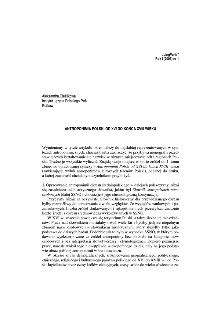 „LingVaria” Rok I (2006) nr 1 Aleksandra Cieślikowa Instytut Języka Polskiego PAN Kraków ANTROPONIMIA POLSKI OD XVI DO KOŃCA XVIII WIEKU Wymieniony w tytule artykułu okres naleŜy do najsłabiej reprezentowanych w syntezach antroponimicznych, chociaŜ trzeba zaznaczyć, Ŝe przybywa monografii przedstawiających kształtowanie się nazwisk w róŜnych miejscowościach i regionach Polski. Trudno je wszystkie wyliczać. Znajdą swoje miejsce w spisie źródeł do 1. tomu zbiorowo opracowanej syntezy – Antroponimii Polski od XVI do końca XVIII wieku (zawierającej wybór antroponimów z róŜnych terenów Polski), oddanej do druku, a której zawartość chciałabym czytelnikom przybliŜyć. 1. Opracowanie antroponimii okresu średniopolskiego w dziejach polszczyzny, róŜni się zasadniczo od historycznego słownika, jakim był Słownik staropolskich nazw osobowych (dalej SSNO), chociaŜ jest jego chronologiczną kontynuacją. Przyczyny róŜnic są oczywiste. Słownik historyczny dla przewidzianego okresu byłby niemoŜliwy do opracowania z wielu względów. Ze względów naukowych i pozanaukowych. Liczba źródeł drukowanych i rękopiśmiennych przewyŜsza znacznie liczbę źródeł z okresu średniowiecza wykorzystanych w SSNO. W XVI w. znacznie powiększa się terytorium Polski, a takŜe liczba jej mieszkańców. Praca nad słownikiem musiałaby trwać wiele lat i byłaby jedynie niepełnym zbiorem nazw osobowych – słownikiem historycznym, który słuŜyłby tylko jako podstawa do dalszych badań. Podobnie jak to było w wypadku SSNO, w którym podawano wyekscerpowane ze źródeł antroponimy bez podziału na kategorie nazw osobowych i bez interpretacji słowotwórczej i etymologicznej. Dopiero późniejsze prace, narosłe wokół tego niewątpliwie wiekopomnego dzieła, dały na jego podstawie obraz polskiej antroponimii w średniowieczu. W okresie zmian demograficznych, zróŜnicowania geograficznego, politycznego, etnicznego, religijnego i kulturowego państwa polskiego od XVI do XVIII w.: od Polski Jagiellonów przez czasy królów elekcyjnych, czasy saskie do wieku oświecenia za- 96 ALEKSANDRA CIEŚLIKOWA kończonego upadkiem i zniknięciem Polski z mapy Europy na ponad sto lat – niesłychanie trudno jest nie tylko wskazać kierunki zmian w systemie nazewniczym, ale i samo zebranie materiału antroponimicznego stanowi powaŜny problem badawczy. K. Rymut pisał: [...] zebranie materiału do antroponomastykonu XVI–XVIII w. jest praktycznie niemoŜliwe przez jeden choćby liczny zespół. Wydaje się, Ŝe droga do zgromadzenia takiego zbioru wiedzie przez opracowania regionalne. WyobraŜam sobie to tak, Ŝe po opracowaniu podstawowych załoŜeń ogólnopolskiego Słownika nazw osobowych XVI–XVIII w. powinno się opracować podstawowe załoŜenia historycznych, regionalnych badań antroponimicznych. Dysertacje doktorskie z tego zakresu powinny być pisane według jednolitego schematu (Rymut 1991). Propozycje słuszne, ale niestety niewykonalne. Trudno narzucić sposób opracowania materiału w dysertacjach doktorskich, w których musi być wykazana samodzielność teoretyczna i metodologiczna. Kierunki w lingwistyce się zmieniają, zmienia się ogląd nazw własnych, zmianom podlegają określanie funkcji nazw i metody opisu słowotwórczego. Drugi niezwykle istotny problem poruszony przez K. Rymuta to wielonarodowościowy w tym czasie charakter państwa polskiego: Słownik nazw osobowych XVI–XVIII w. powinien stanowić swoistą kontynuację Słownika staropolskich nazw osobowych [i dalej] Polska XVI–XVIII w. była państwem wielonarodowościowym. Słownik winien się ograniczyć do nazw osobowych uŜywanych przez Polaków. Oczywiście juŜ samo zdefiniowanie określenia Polak nastręcza trudności (Rymut 1991). Wieloetniczny skład Polski w okresie od XVI do XVIII w. często uniemoŜliwia badaczowi rozstrzygnięcie, którą osobę z danego źródła moŜna określić jako Polaka. W tym czasie wciąŜ wzrastała liczba nazwisk obcych w zbiorze nazwisk Polaków, co pokazują wykazy nazw osobowych tworzone w naszym Słowniku na podstawie wielu źródeł i uzupełniane nazwiskami z herbarzy i Słownika biograficznego. Ten zróŜnicowany genetycznie skład nazwisk utrzymuje się do współczesności. Kryterium oceny antroponimu winna być adaptacja nazwy osobowej do polskiej formy językowej nazwy osobowej albo nosiciela nazwy do polskiego etnosu (oznaki trwałego związku z Polską, funkcja społeczna, imię jako wskaźnik etnosu). Dwoistość nazwa własna : nosiciel włącza badania onomastyczne w zakres historii, kultury, socjologii, a nawet psychologii. W materiale antroponimicznym przedstawianego tu opracowania są juŜ widoczne zmiany w funkcjach przezwiska i nazwiska. W artykułach słownikowych utworzonych na podstawie przykładów tekstowych, zlokalizowanych i schronologizowanych, a takŜe w wykazach nazwisk pochodzących z trzech wieków i z róŜnych regionów Polski widać wyraźnie dwie tendencje: dąŜność do stabilizacji w sensie rodzinności i dziedziczności nazwisk oraz jednocześnie, utrzymującą się w tekstach (oficjalnych?) wariantywność z powodu braku kodyfikacji urzędowej. Tworzenie się nazwisk to stabilizacja przezwisk (np. Gospodarzyk; często nazwiska te określane są jako odapelatywne), stabilizacja w funkcji nazwiska apelatywów określających wykonywany zawód (Cieśla), stabilizacja przymiotników odmiejsco- ANTROPONIMIA POLSKI 97 wych (Czacki od nazwy miejscowej Czacz), stabilizacja imion w funkcji nazwisk (Abraham), stabilizacja form genetycznie patronimicznych: -icz, -owicz, niekiedy patronimicznych lub hipokorystycznych: -ak, -ek, -czyk, które zaczynają funkcjonować jako odrębne nazwiska, nie wyraŜając juŜ nawet dla ówczesnych odbiorców relacji syn : ojciec. Relację taką, a więc wyraŜoną słowotwórczą zaleŜność od nazwiska męskiego (ojca, męŜa), posiadały jedynie nazwiska kobiet (Ŝon, córek). 