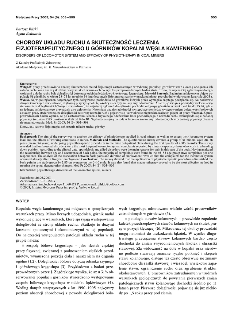 Medycyna Pracy 2003; 54 (6): 503 — 509 503 Bartosz Bilski Agata Bednarek CHOROBY UKŁADU RUCHU A SKUTECZNOŚĆ LECZENIA FIZJOTERAPEUTYCZNEGO U GÓRNIKÓW KOPALNI WĘGLA KAMIENNEGO DISORDERS OF LOCOMOTOR SYSTEM AND EFFICACY OF PHYSIOTHERAPY IN COAL MINERS Z Katedry Profilaktyki Zdrowotnej Akademii Medycznej im. K. Marcinkowskiego w Poznaniu STRESZCZENIE Wstęp.W pracy przedstawiono analizę skuteczności metod fizjoterapii zastosowanych w wybranej populacji górników wraz z oceną obciążenia ich układu ruchu oraz analizą skutków pracy w takich warunkach. W wyniku przeprowadzonych badań stwierdzono, że najczęściej zgłaszanymi dolegliwościami układu ruchu były dolegliwości dotyczące odcinka lędźwiowo-krzyżowego kręgosłupa. Materiał i metody. Badaniem ankietowym objęto populację 51 górników w wieku 28–75 lat (średnio 54 lata) leczonych fizjoterapeutycznie w przykopalnianej przychodni w pierwszym kwartale 2003 r. Wyniki. Najwięcej zgłoszeń dotyczących tych dolegliwości pochodziło od górników, których praca wymagała częstego pochylania się. Na podstawie danych klinicznych stwierdzono, iż główną przyczyną bólu tej okolicy ciała były zmiany zwyrodnieniowe. Analizując związek pomiędzy wiekiem a występowaniem dolegliwości bólowych stwierdzono, że najwięcej zgłoszeń dolegliwości pochodzi od grupy górników w wieku od 46 do 55 lat, gdzie na jednego ankietowanego przypadały dwa zgłoszenia. Natomiast badając zależności występujące pomiędzy występowaniem dolegliwości bólowych a stażem pracy stwierdzono, że dolegliwości ze strony narządu ruchu pojawiły się już w okresie nieprzekraczającym pięciu lat pracy. Wnioski. Z przeprowadzonych badań wynika, że po zastosowaniu leczenia fizykalnego odczuwanie bólu pochodzącego z narządu ruchu zmniejszyło się u badanej populacji średnio o 2,83 punktów w skali od 0 do 10. Najskuteczniejszą metodą w leczeniu zmian zwyrodnieniowych w ocenianej populacji okazała się magnetoterapia. Med. Pr. 2003; 54 (6): 503—509 Słowa kluczowe: fizjoterapia, schorzenia układu ruchu, górnicy ABSTRACT Background: The aim of the survey was to analyze the efficacy of physiotherapy applied in coal miners as well as to assess their locomotor system load and the effects of working conditions in mines. Materials and Methods: The questionnaire survey covered a group of 51 miners, aged 28–76 years (mean, 54 years), undergoing physiotherapeutic procedures in the mine out-patient clinic during the first quarter of 2003. Results: The survey revealed that lumbosacral disorders were the most frequent locomotor system complaints reported by miners, especially those who work in a bending down position. According to the clinical data, spondylosis and allied disorders were the main reasons for pain in this part of the body. Having analyzed the relationship between age and occurrence of back pains, the majority of complaints were found in the 46–55 age group (two complaints per one respondent). The analysis of the association between back pains and duration of employment revealed that the complaints for the locomotor system occurred already after a five-year employment. Conclusions: The survey showed that the application of physiotherapeutic procedures diminished the back pain in the study group by 2.83 on average on the 0–10 scale. It was also found that magnetotherapy proved to be the most effective method in treating the spinal degenerative changes. Med Pr 2003; 54 (6): 503—509 Key words: physiotherapy, disorders of the locomotor system, miners Nadesłano: 26.06.2003 Zatwierdzono: 30.10.2003 Adres autora: Smoluchowskiego 11, 60-179 Poznań, e-mail: [email protected] © 2003, Instytut Medycyny Pracy im. prof. J. Nofera w Łodzi WSTĘP Kopalnia węgla kamiennego jest miejscem o specyficznych warunkach pracy. Mimo licznych udogodnień, górnik nadal wykonuje pracę w warunkach, które sprzyjają występowaniu dolegliwości ze strony układu ruchu. Skutkuje to dużymi kosztami społecznymi i ekonomicznymi w tej populacji. Do najczęściej występujących patologii układu ruchu w tej grupie należą: n zespoły bólowe kręgosłupa – jako skutek ciężkiej pracy fizycznej, związanej z podnoszeniem ciężkich przedmiotów, wymuszoną pozycją ciała i narażeniem na drgania ogólne (1,2). Dolegliwości bólowe dotyczą odcinka szyjnego i lędźwiowego kręgosłupa (3). Przykładowo z badań przeprowadzonych przez J. Zagórskiego wynika, że aż u 31% obserwowanej populacji górników stwierdzono występowanie zespołu bólowego kręgosłupa w odcinku lędźwiowym (4). Według danych statystycznych z lat 1990–1995 najwyższy poziom absencji chorobowej z powodu dolegliwości bólo- wych kręgosłupa odnotowano właśnie wśród pracowników zatrudnionych w górnictwie (5). n patologia stawów kolanowych – przewlekłe zapalenie kaletek przedrzepkowych stawów kolanowych na skutek pracy w pozycji klęczącej (6). Mikrourazy tej okolicy prowadzić mogą natomiast do uszkodzenia łąkotek. W wyniku długotrwałego przeciążenia stawów kolanowych bardzo często dochodzi do zmian zwyrodnieniowych łąkotek i chrząstki stawowej. Zła widoczność na dole w kopalni oraz nierówne podłoże stwarzają znaczne ryzyko potknięć i skręceń stawu kolanowego, dlatego też często obserwuje się zmiany chorobowe chrząstki stawowej i więzadeł, wysiękowe zapalenie stawu, ograniczenie ruchu oraz zgrubienie struktur okołostawowych. U pracowników zatrudnionych w trudnych warunkach geologicznych do powstania pierwszych zmian patologicznych stawu kolanowego dochodzi średnio po 11 latach pracy. Pierwsze dolegliwości pojawiają się już niekiedy po 1,5 roku pracy pod ziemią. 504 B. Bilski, A. Bednarek n skutki wypadków przy pracy – wskaźnik zagrożenia wypadkiem przy pracy w górnictwie jest 4-krotnie wyższy od wskaźnika dla całej gospodarki; w tym urazy stóp – przypadkowe potknięcia, poślizgn