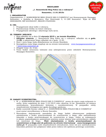 REGULAMIN „1. Sosnowiecki Bieg Policz się z cukrzycą” Sosnowiec, 11.01.2015r I. ORGANIZATOR Organizatorem „1. SOSNOWIECKI BIEG POLICZ SIĘ Z CUKRZYCĄ” jest Stowarzyszenie Harpagan Sosnowiec, z siedzibą w Sosnowcu, Plac Kościuszki 5, 41-200 Sosnowiec. Wpis do KRS 0000486559, NIP 6443505357, REGON 276255482. II. CEL 1. Propagowanie akcji walki z cukrzycą. 2. Popularyzacja wiedzy na temat cukrzycy. 3. Propagowanie zdrowego i aktywnego stylu życia. III. TERMIN I MIEJSCE 1. Bieg odbędzie się w dniu 11 stycznia 2015 r. na terenie Stawików. 2. Oficjalne otwarcie „1. Sosnowiecki Bieg Policz się z cukrzycą” odbędzie się o godz. 11.00, a zakończenie biegu odbędzie się o godz. 12.30. 3. Start i meta biegu będą zlokalizowane na terenie Stawików. 4. Szczegółowa trasa biegu znajduje się na stronie internetowej www.harpagansosnowiec.pl i www.wosp.sosnowiec.pl. 5. Długość trasy: ok. 6 km. 6. Trasa będzie oznaczona taśmami oraz zabezpieczona przez członków Stowarzyszenia Harpagan Sosnowiec. IV. ZASADY UCZESTNICTWA 1. W „1. SOSNOWIECKI BIEG POLICZ SIĘ Z CUKRZYCĄ” prawo do startu mają wyłącznie te osoby, które najpóźniej do dnia 11.01.2015 roku ukończą 16 lat. Niezależnie od miejsca zamieszkania, przynależności klubowej i narodowościowej. W przypadku osoby niepełnoletniej wymagana jest zgoda dorosłego opiekuna. 2. Każdy uczestnik biorący udział w „1. SOSNOWIECKI BIEG POLICZ SIĘ Z CUKRZYCĄ” musi zostać zweryfikowany w Biurze Zawodów. 3. Warunkiem dopuszczenia zawodnika do biegu będzie własnoręczne podpisanie oświadczenia o braku przeciwwskazań do uczestnictwa w biegu, albo zaświadczenie lekarskie o braku przeciwwskazań do uczestnictwa w biegu. Jedno ze wskazanych w zdaniu poprzedzającym zaświadczeń powinno zostać złożone przy potwierdzeniu udziału lub rejestracji do biegu. Wzór oświadczenia o braku przeciwwskazań do uczestnictwa w biegu jest do pobrania na stronie internetowej www.harpagansosn owiec.pl. W przypadku osób niepełnoletnich oświadczenie, które nie jest zaświadczeniem lekarskim powinno być podpisane także przez rodzica lub opiekuna prawnego uczestnika. 4. Wszyscy uczestnicy „1. SOSNOWIECKI BIEG POLICZ SIĘ Z CUKRZYCĄ” są zobowiązani d ostosowania się do poleceń osób odpowiedzialnych za bezpieczeństwo, służb porządkowych oraz obsługi z ramienia Organizatora. 5. Decyzje obsługi medycznej co do kontynuowania biegu są ostateczne i niezmienne. V. ZGŁOSZENIA I OPŁATA STARTOWA 1. Zgłoszenie „1. SOSNOWIECKI BIEG POLICZ SIĘ Z CUKRZYCĄ” będą przyjmowane drogą elektroniczną pod adresem: [email protected]. 2. W zgłoszeniu należy podać Imię i Nazwisko oraz datę urodzenia Uczestnika zawodów. 3. Zgłoszenia elektroniczne będą przyjmowane do dnia 7 stycznia 2015. 4. Za zgłoszenie uważa się łączne dopełnienie wszystkich poniższych czynności: a) prawidłowe wypełnienie elektronicznego zgłoszenia, b) dokonanie opłaty startowej w dniu biegu w wysokości min. 20zł, c) złożenie podpisanego oświadczenia o braku przeciwwskazań do uczestnictwa w biegu lub analogicznego zaświadczenia lekarskiego w Biurze Zawodów, d) limit uczestników w Biegu wynosi 150 osób. Organizator zastrzega sobie prawo wcześniejszego zamknięcia zapisów w przypadku wypełnienia się limitu zgłoszeń lub do zapisów w biurze zawodów w miarę wolnych miejsc do limitu. e) opłata startowa za udział w „1. SOSNOWIECKI BIEG POLICZ SIĘ Z CUKRZYCĄ” w ynosi minimum 20 PLN i jest w całości przeznaczona na 23 Finał Wielkiej Orkiestry Świątecznej Pomocy, f) opłata będzie przyjmowana do puszek WOŚP w Biurze Zawodów, g) organizatorzy biegu nie wystawiają faktur VAT, h) opłata raz uiszczona nie podlega zwrotowi. 5. W ramach opłaty startowej każdy uczestnik biegu otrzymuje: a) numer startowy wraz z czterema agrafkami, b) medal (otrzyma go pierwsze150 - zapisanych i zapłaconych - osób w biurze zawodów). VI. BIURO ZAWODÓW – odbiór pakietów startowych 1. Odbiór pakietów startowych: Biuro Zawodów będzie się znajdować na terenie Stawików obok bramy głównej Stadionu Ludowego, ul. Kresowa 1, 41-200 Sosnowiec. Potwierdzenie rejestracji lub rejestracja zawodników będzie miała miejsce 11 stycznia 2015r. od godziny 10.00 do 10:45. 2. Podczas odbioru pakietu zawodnicy muszą posiadać dokument ze zdjęciem celem weryfikacji danych osobowych. VII. OCHRONA DANYCH OSOBOWYCH 1. Dane osobowe uczestników w „1. SOSNOWIECKI BIEG POLICZ SIĘ Z CUKRZYCĄ” będą przetwarzane w celach przeprowadzenia biegu. 2. Dane osobowe uczestników „1. SOSNOWIECKI BIEG POLICZ SIĘ Z CUKRZYCĄ” będą wykorzystywane zgodnie z warunkami określonymi w ustawie z dnia 29 sierpnia 1997 r. o ochronie danych osobowych (tekst jednolity: Dz. U. z 2002 r., Nr 101 poz. 926). Administratorem danych osobowych jest Organizator. 3. Przetwarzanie danych, o których mowa w ustępie 1 niniejszego paragrafu w związku z udziałem w Biegu obejmuje także publikację imienia i nazwiska uczestnika wraz z nazwą miejscowości, w której zamieszkuje - w każdy sposób, w jaki publikowany lub rozpowszechniany będzie projekt. 4. Uczestnik ma prawo wglądu do swoich danych osobowych oraz ich poprawiania. 5. Podanie danych osobowych oraz wyrażenie zgody na ich przetwarzanie jest dobrowolne, lecz ich niepodanie lub brak zgody na ich przetwarzanie uniemożliwia udział w Biegu. Przez przekazanie do organizatora, prawidłowo wypełnionego i podpisanego formularza zgłoszeniowego uczestnik wyraża zgodę i zezwala na wykorzystanie podanych przez niego danych osobowych na potrzeby przesłania do uczestnika informacji o przyszłych imprezach organizowanych przez Organizatora, zgodnie z ustawą o ochronie o danych osobowych z dnia 29 sierpnia 1997 r., Dz. U. nr 33, poza 883. Uczestnikowi przysługuje prawo do wycofania takiej zgody i może to zrobić w dowolnym momencie kierując korespondencję na adres organizatora 6. Wszystki