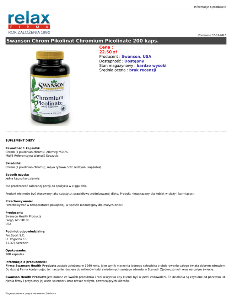 Informacje o produkcie Utworzono 07-03-2017 Swanson Chrom Pikolinat Chromium Picolinate 200 kaps. Cena : 22.50 zł Producent : Swanson, USA Dostępność : Dostępny Stan magazynowy : bardzo wysoki Średnia ocena : brak recenzji SUPLEMENT DIETY Zawartość 1 kapsułki: Chrom (z pikolinian chromu) 200mcg *500% *RWS Referencyjna Wartość Spożycia Składniki: Chrom (z pikolinian chromu), mąka ryżowa oraz żelatyna (kapsułka) Sposób użycia: Jedna kapsułka dziennie. Nie przekraczać zalecanej porcji do spożycia w ciągu dnia. Produkt nie może być stosowany jako substytut prawidłowo zróżnicowanej diety. Produkt niewskazany dla kobiet w ciąży i karmiących. Przechowywanie: Przechowywać w temperaturze pokojowej, w sposób niedostępny dla małych dzieci. Producent: Swanson Health Products Fargo, ND 58108 USA Podmiot odpowiedzialny: Pro Sport S.C. ul. Pogodna 18 71-376 Szczecin Opakowanie: 200 kapsułek Informacje o producencie: Firma Swanson Health Products została założona w 1969 roku, jako wynik marzenia jednego człowieka o obdarowaniu całego świata dobrym zdrowiem. Do dzisiaj Firma kontynuując to marzenie, dociera do milionów ludzi świadomych swojego zdrowia w Stanach Zjednoczonych oraz na całym świecie. Swanson Health Products jest dumne ze swoich produktów i robi wszystko aby klienci byli w pełni zadowoleni. Te działania są czynione od początku istnienia firmy i przyniosły jej wiele splendoru oraz rzesze stałych, powracających klientów. Wygenerowano w programie www.oscGold.com Firma Swanson Health Products stara się aby: Cena produktu była możliwie najniższa. Czystość i Skuteczność była na jak najwyższym poziomie. Od kiedy firma szczyci się certyfikatem Dobrej Praktyki Wytwarzania (GMP) składniki są testowane na różnych etapach całego procesu produkcji w celu sprawdzenia czystości i mocy a gotowe produkty są badane przez niezależne laboratoria w celu potwierdzenia że, to co na etykiecie to jest w produkcie.
